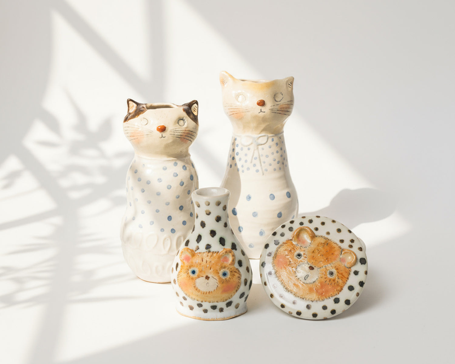 動物をモチーフしたかわいいオブジェなどユーモアと独自の視点を大切に、日常に寄り添う作品です。