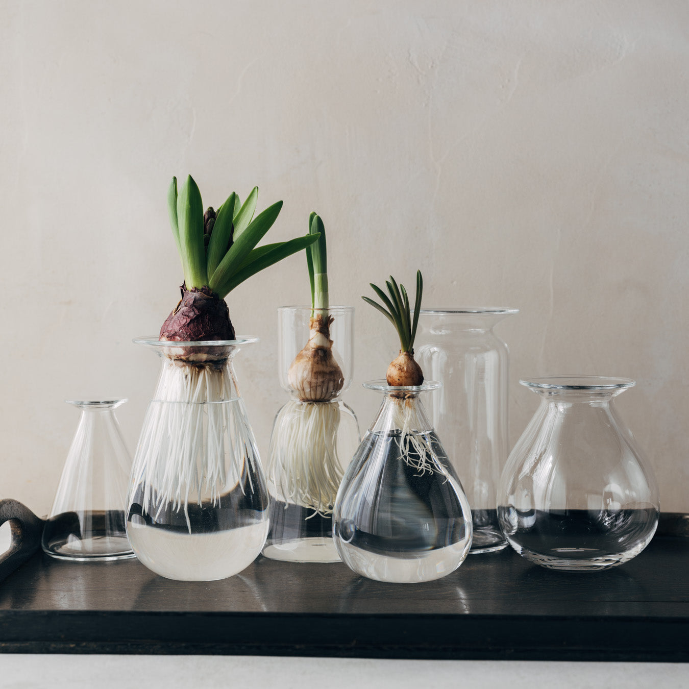 冬はムスカリやクロッカスなどの球根をのせて、水の中で伸びゆく根を眺める。 球根の季節が終われば、庭の草花をさっと生ける一輪挿しとして。