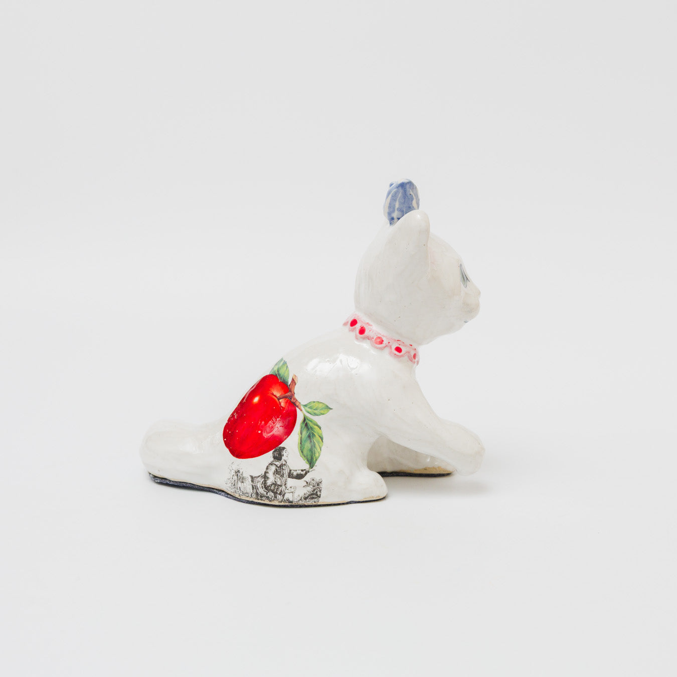 澄んだ瞳と、頭のリボンが印象的。背中にはリンゴのモチーフが描かれ、どこかメルヘンな雰囲気を漂わせます。