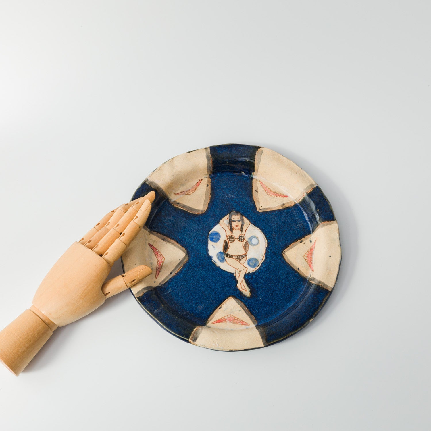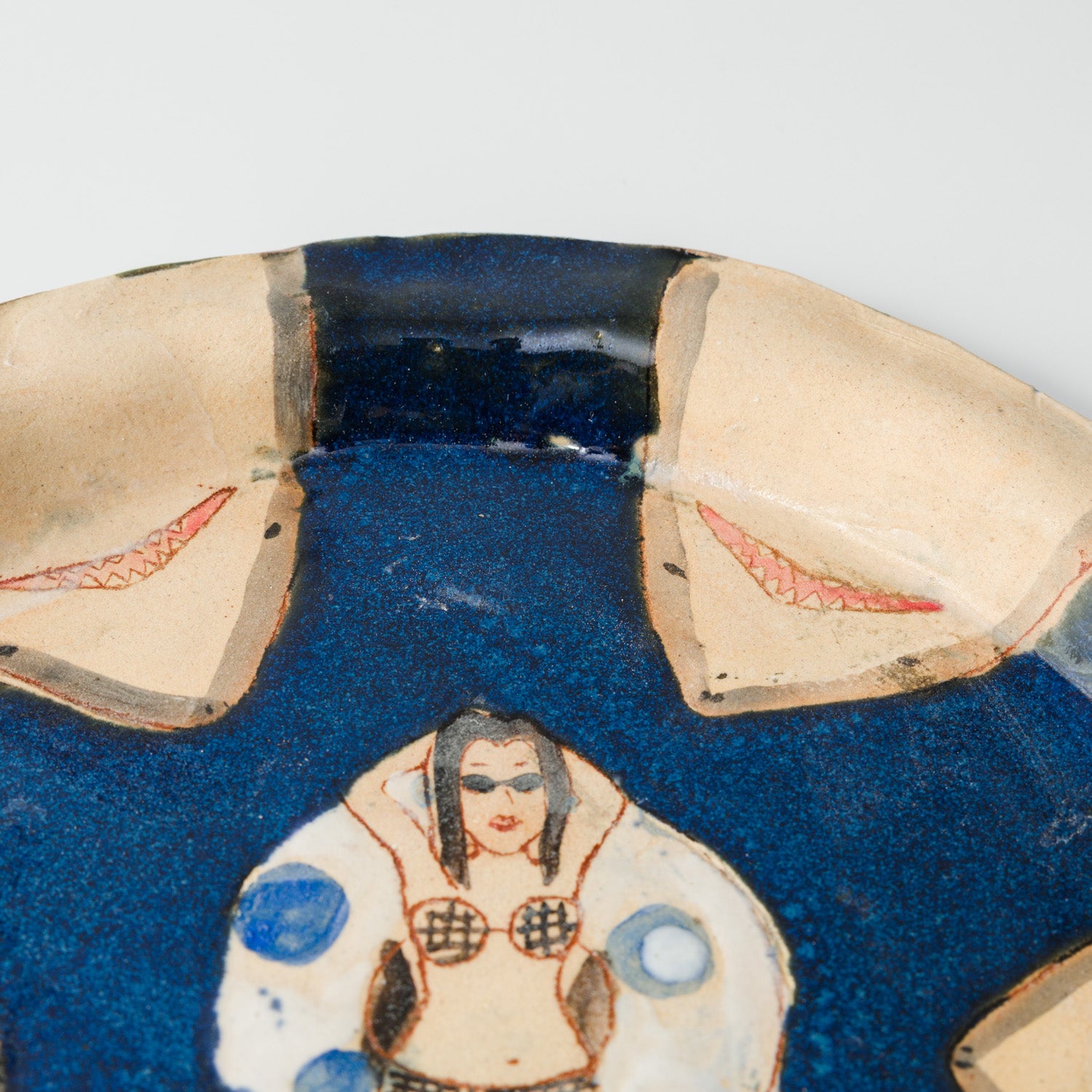 まるでサメのパニック映画のワンシーン!陶芸家・田川亞希さんの遊び心とブラックユーモアが炸裂する、その名も「デンジャラスプレート」です。深いブルーの海に浮かぶ浮き輪の上で、水着姿で優雅にリラックスする女性。しかし、お皿のフチをぐるりと囲むように、鋭い歯を剥き出しにしたサメの顎が今にも迫り来る……という、なんともシュールでスリリングなデザインになっています。お料理を盛り付けて食べていくうちに水着の女性が現れるというドッキリ感を楽しんだり、そのままお皿立てを使ってアートピースとしてお部屋に飾ったりと、楽しみ方はあなた次第。サメ映画好きの方へのプレゼントにも激推ししたいアイテムです。食卓にハラハラドキドキのエンターテインメントを届けてくれる、唯一無二のうつわをぜひお迎えください。