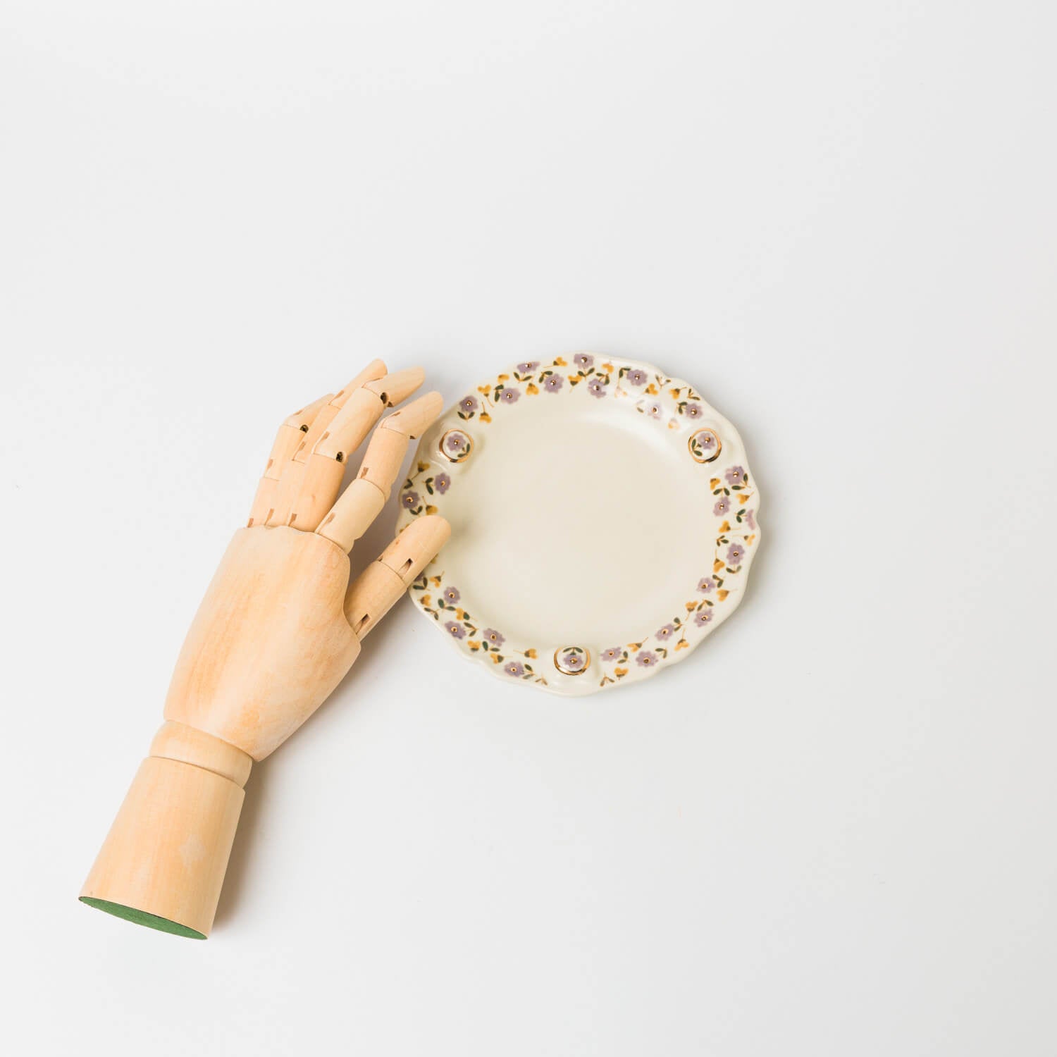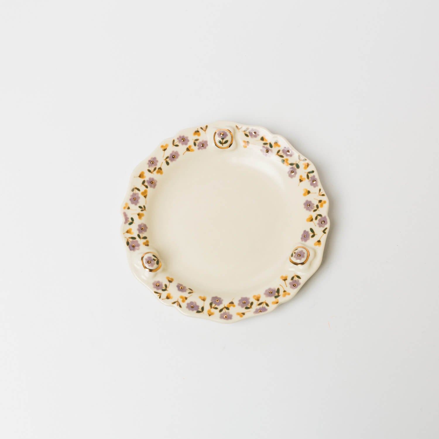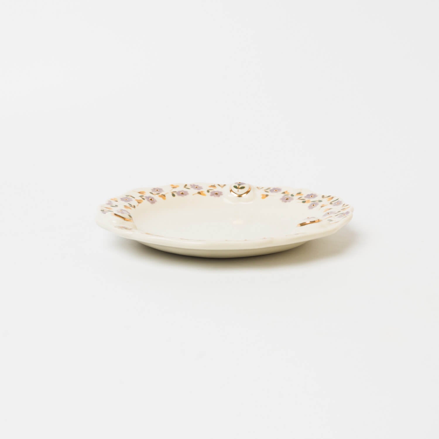 縁に施されたレリーフと金彩、草花文様が印象的なお皿。