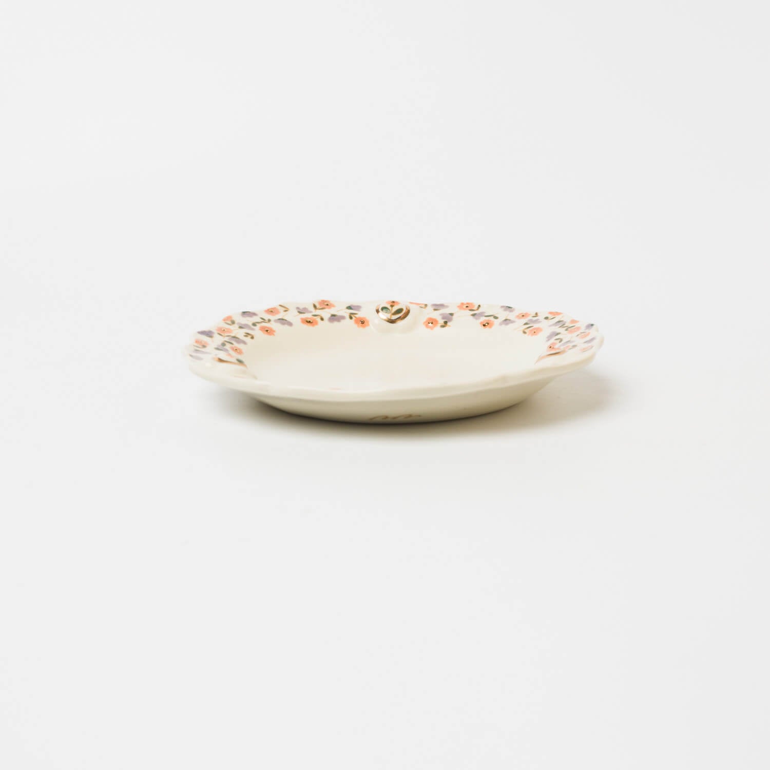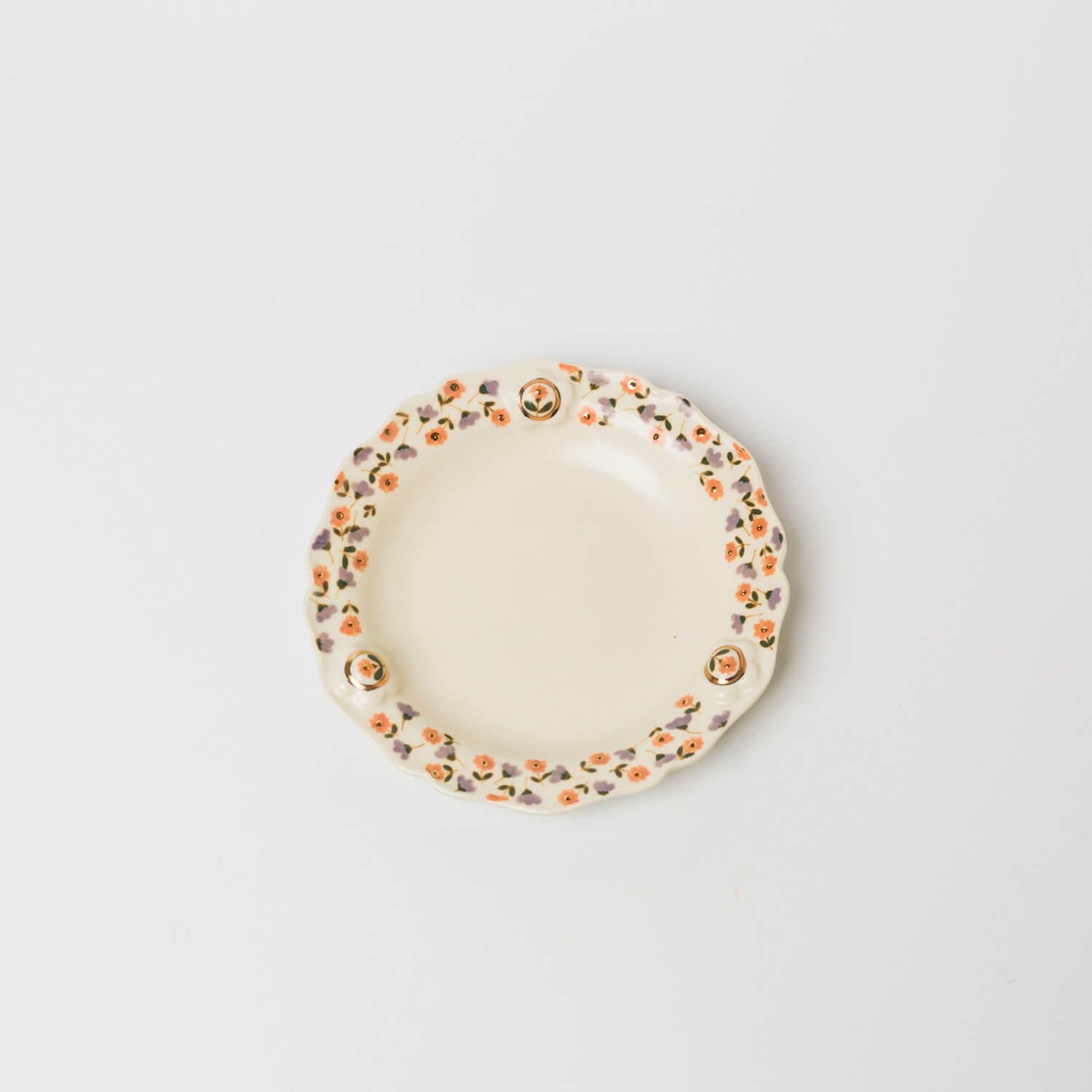 縁に施されたレリーフと金彩、草花文様が印象的なお皿。