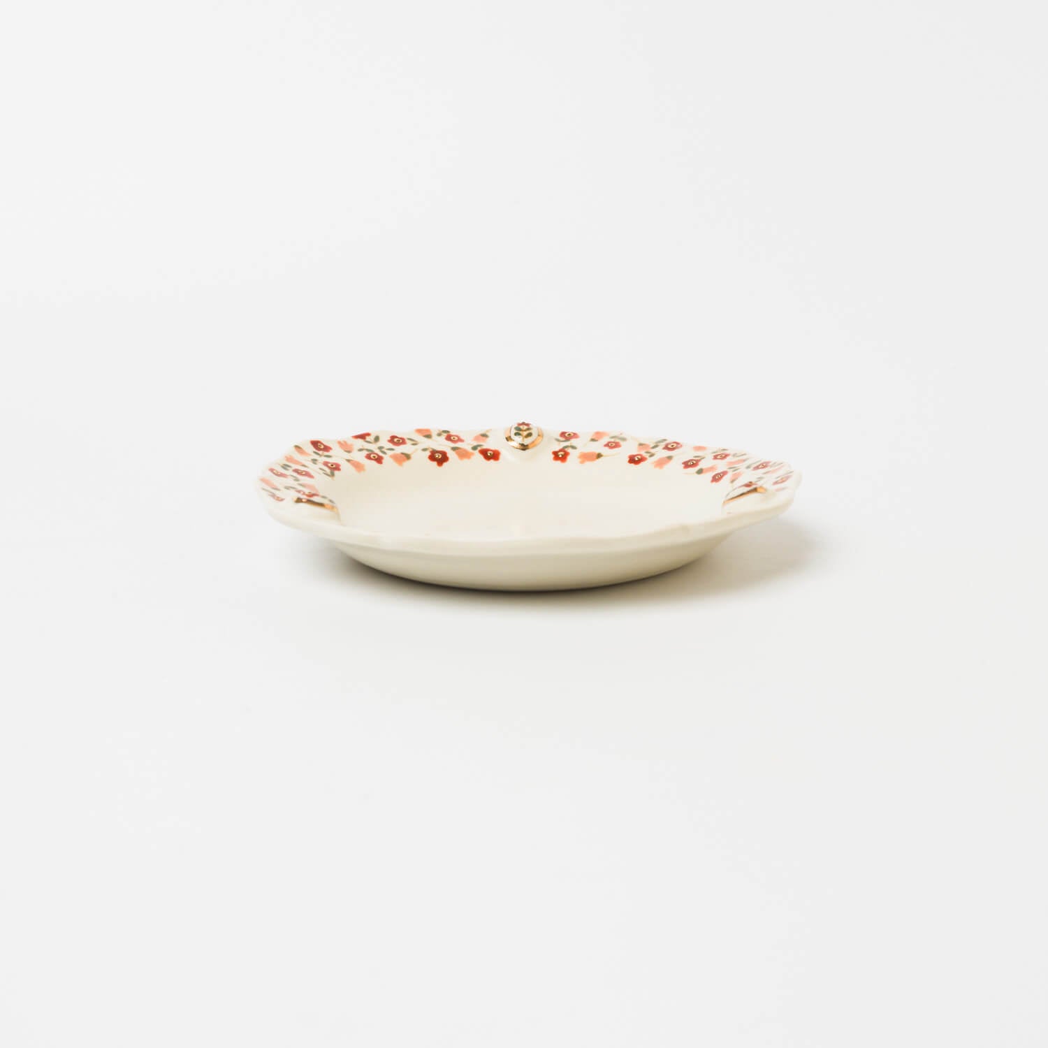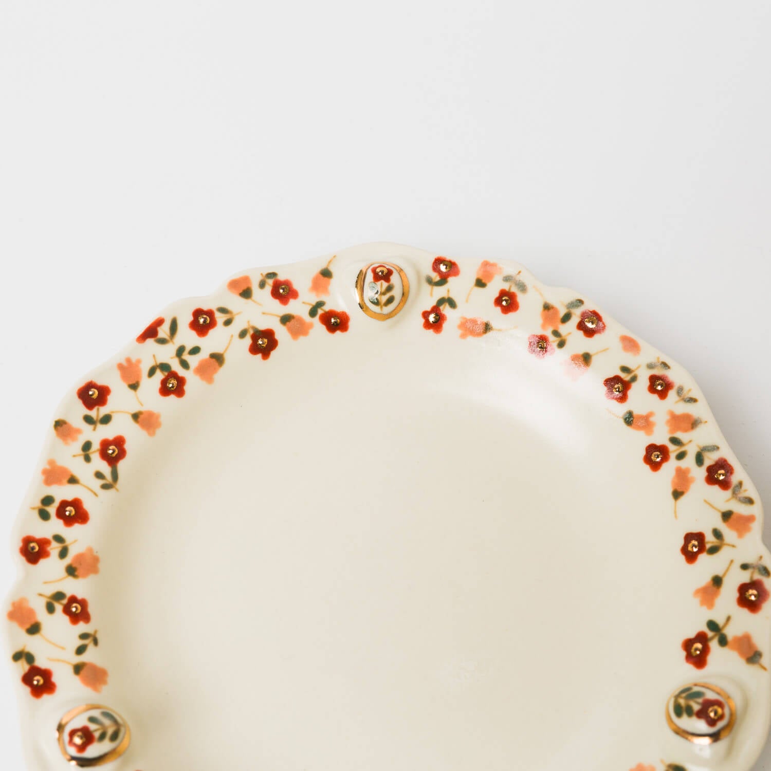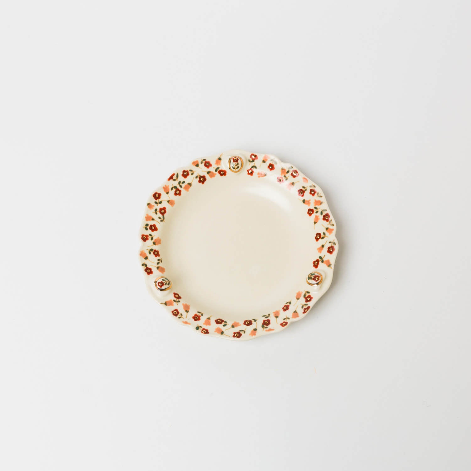 縁に施されたレリーフと金彩、草花文様が印象的なお皿。