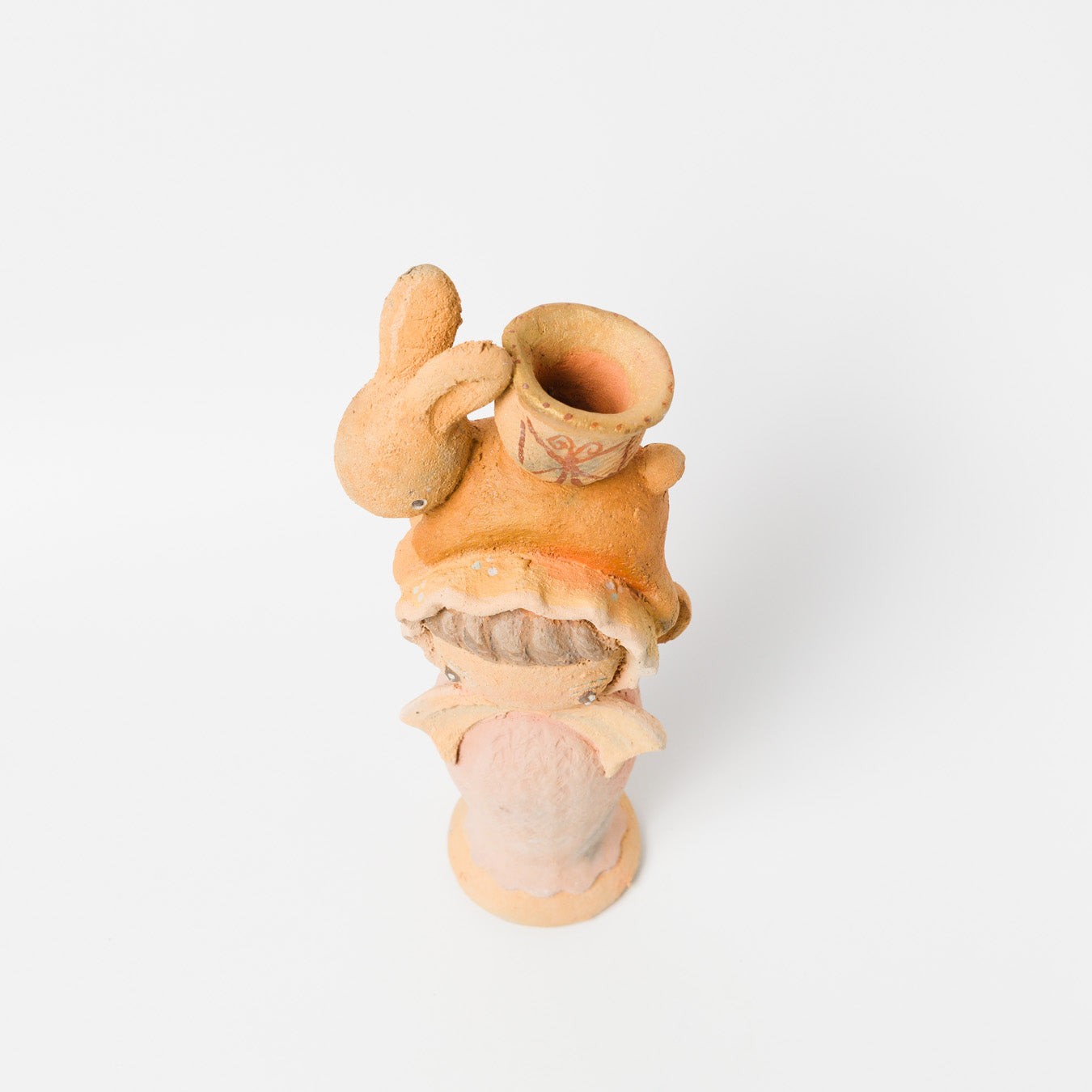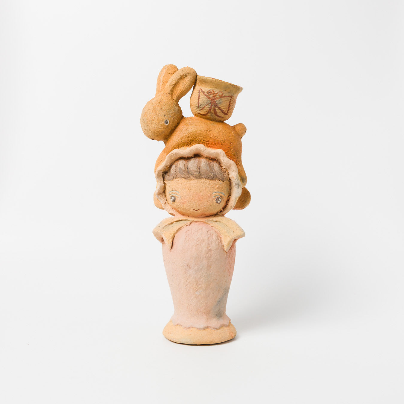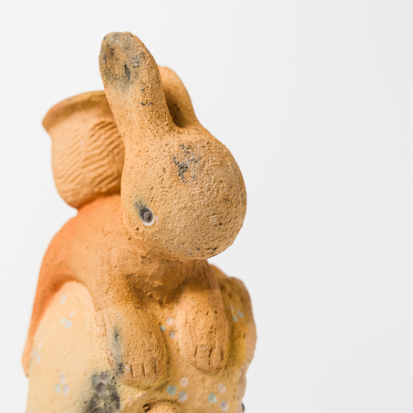 野焼きで作られた、土器の人形「土器子」シリーズ。うさぎ乗せたズキンが印象的です。