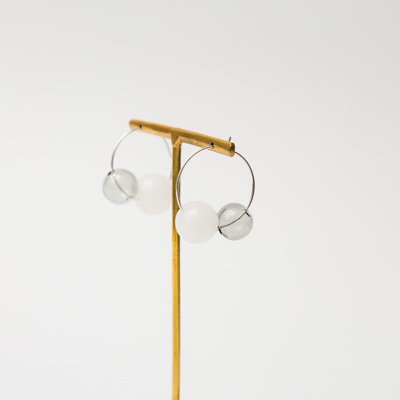 淡いグレーとホワイトのアシンメトリーな組み合わせが耳元のアクセントに。