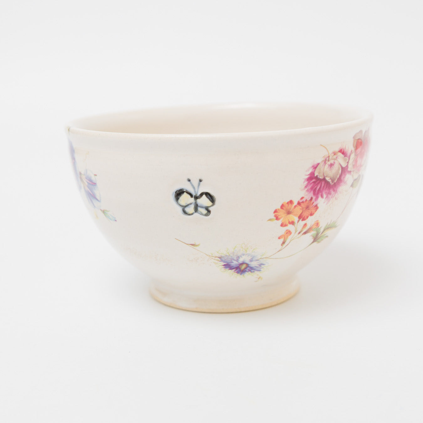 立体的な蝶々のレリーフが愛らしく、植物などのモチーフがコラージュのように散りばめられています。