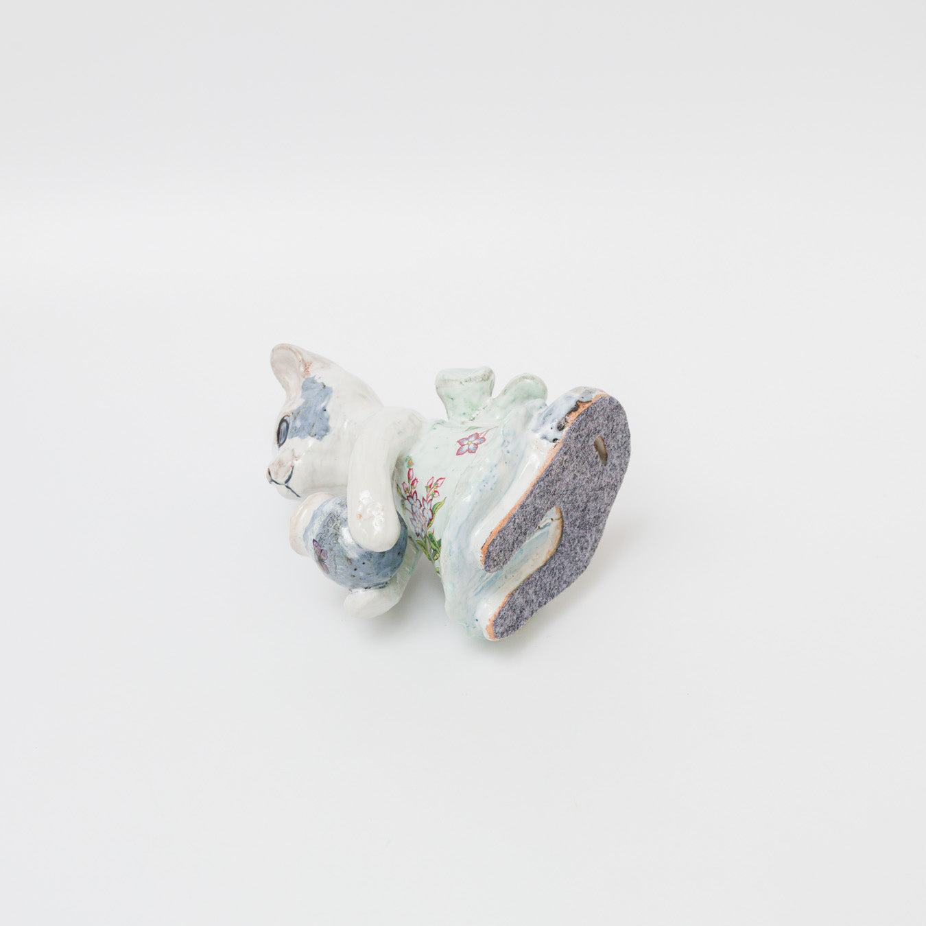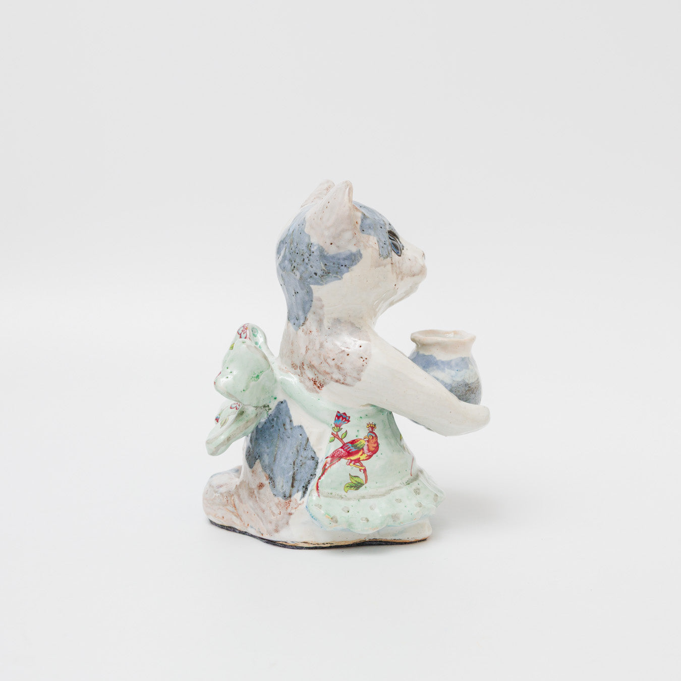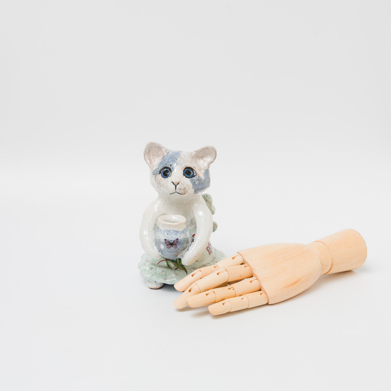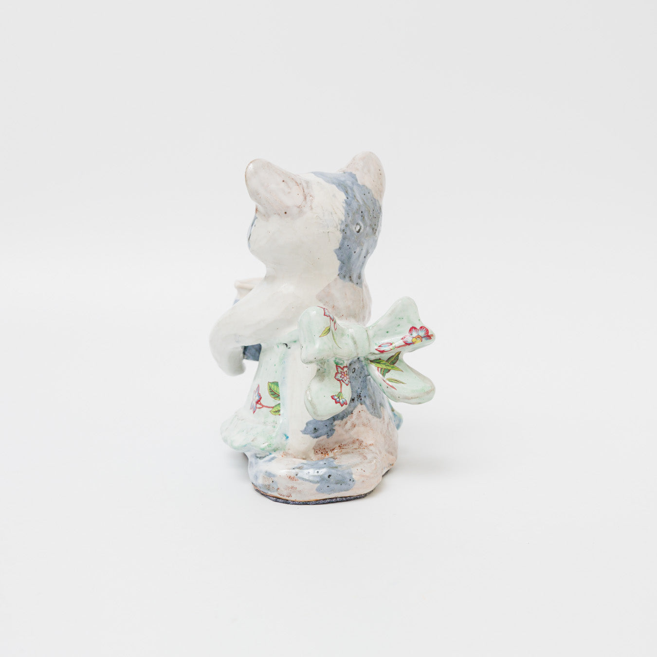 背中のリボンやスカートの模様も丁寧に描かれ、どこから見ても楽しめる作品です。 愛らしい姿と細やかな表情が魅力で、空間にほっとするあたたかさを添えてくれます。