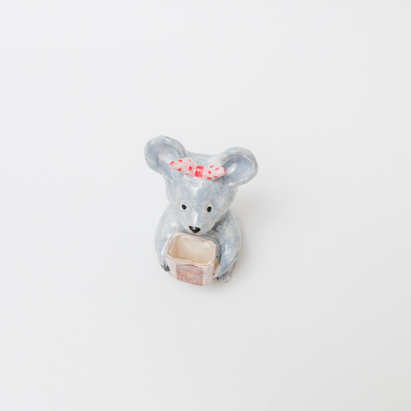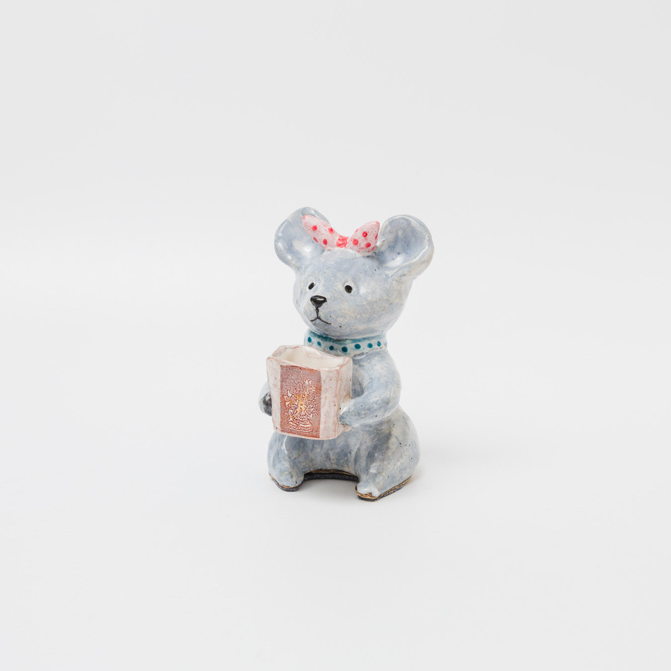 小さな本箱を抱えた姿が微笑ましく、やさしい色合いと表情が魅力です。