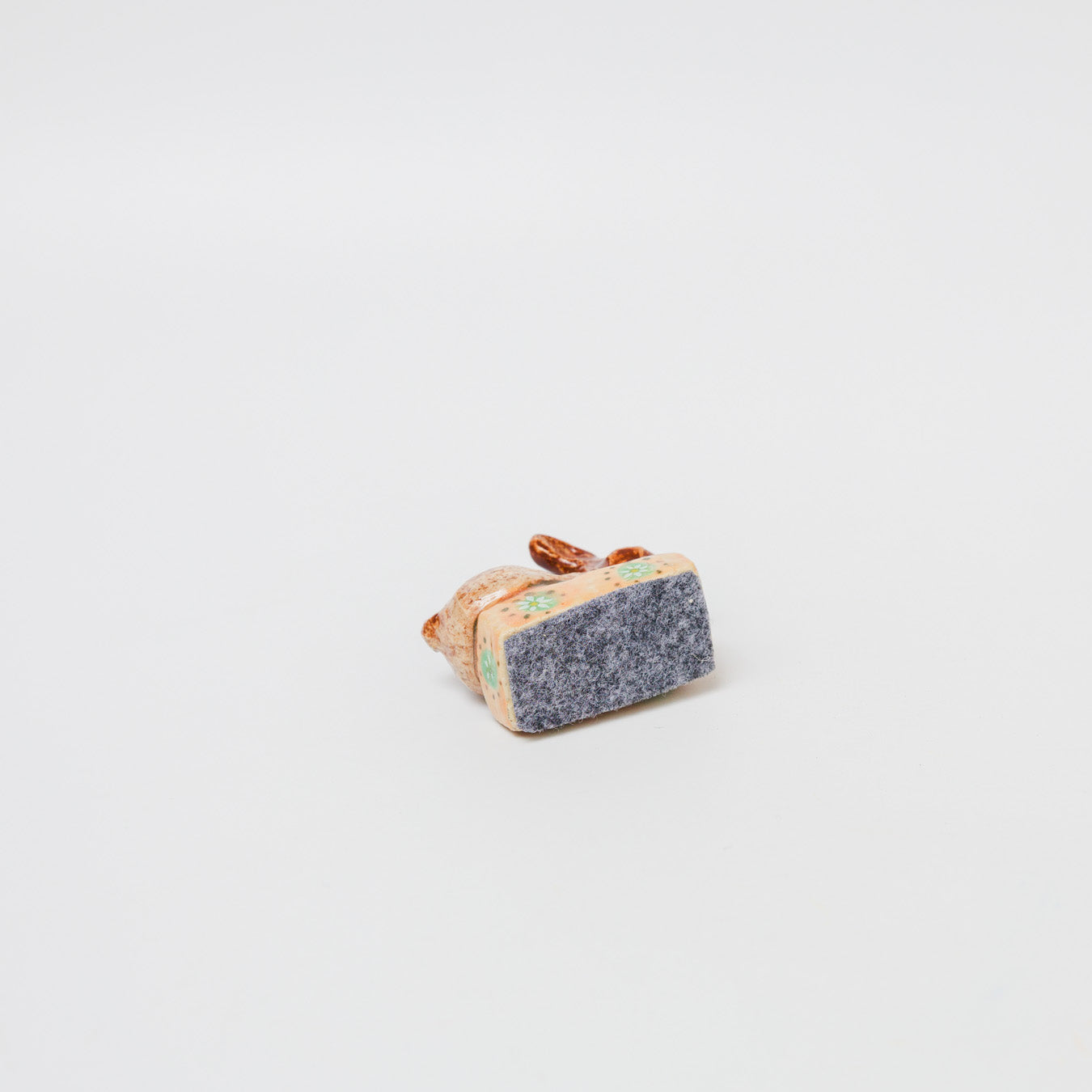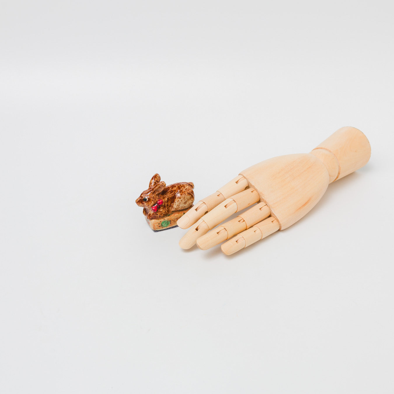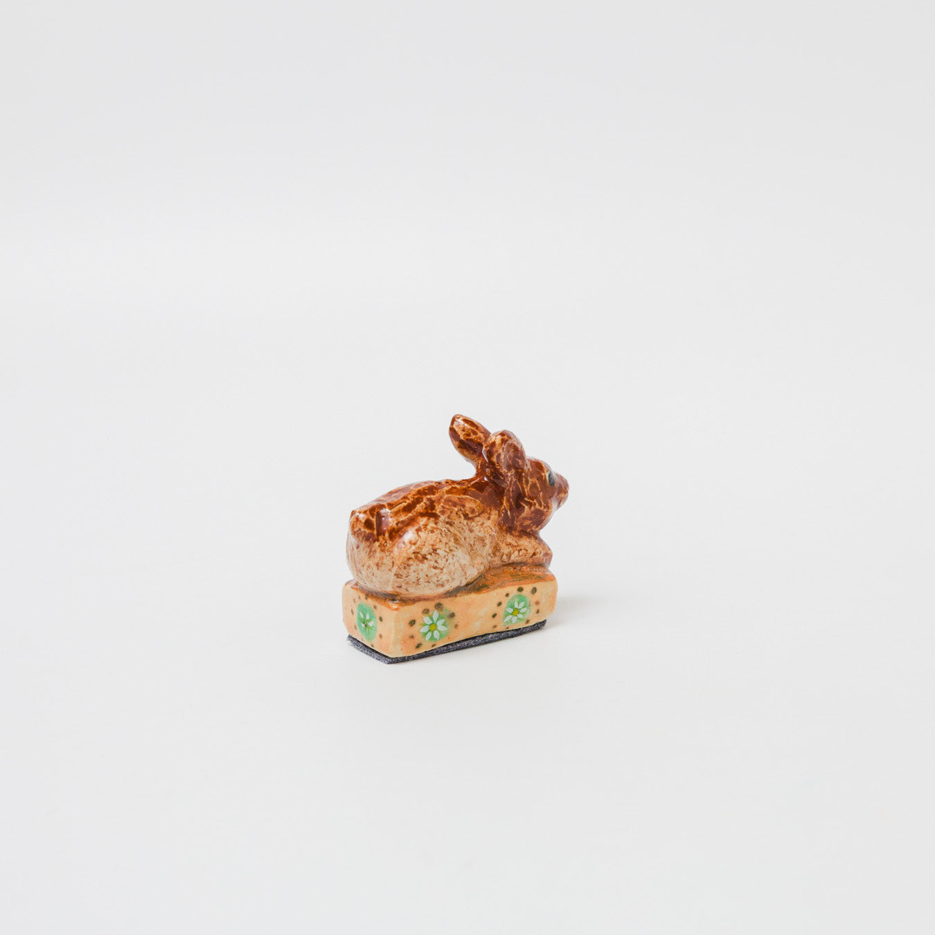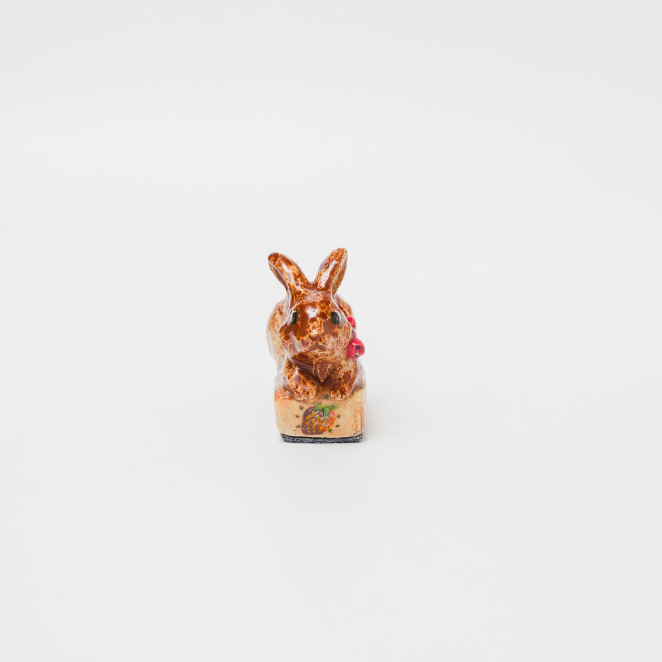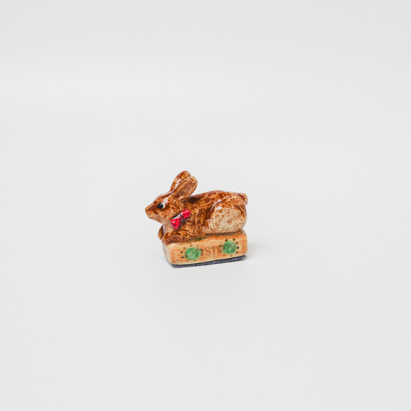 赤いリボンをつけたうさぎの姿が愛らしく、土台には細やかな模様が描かれています。
