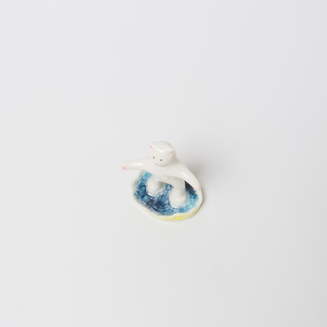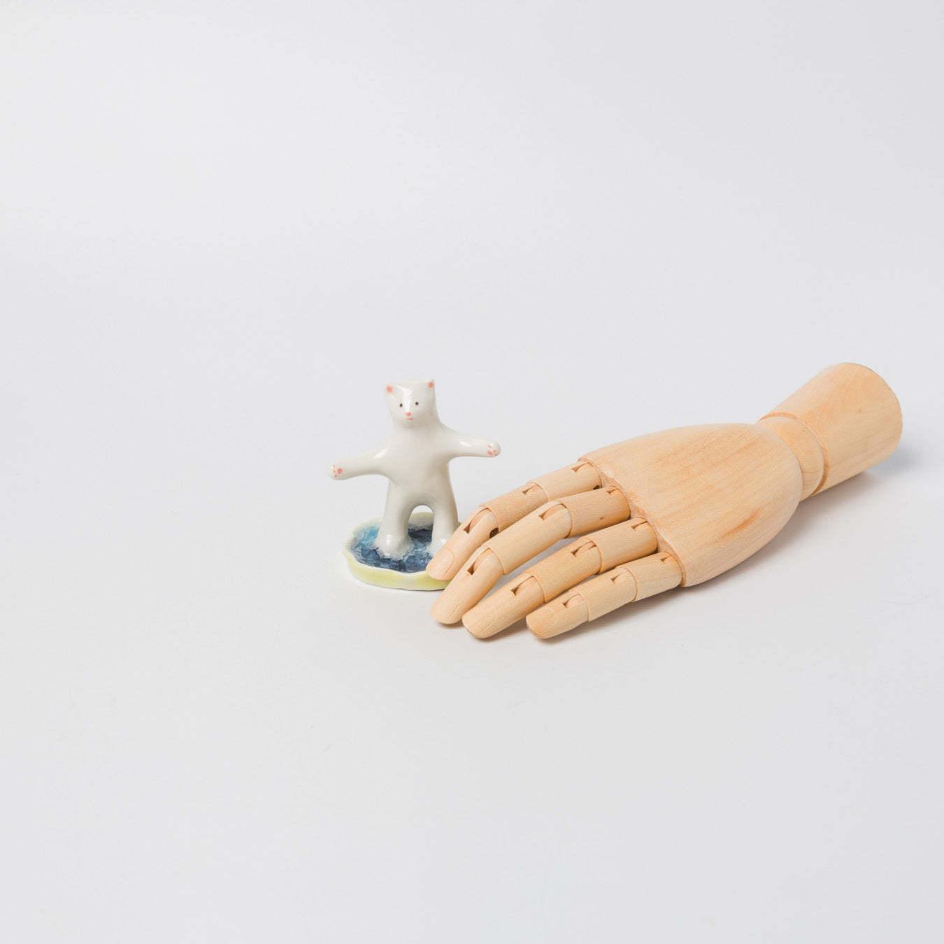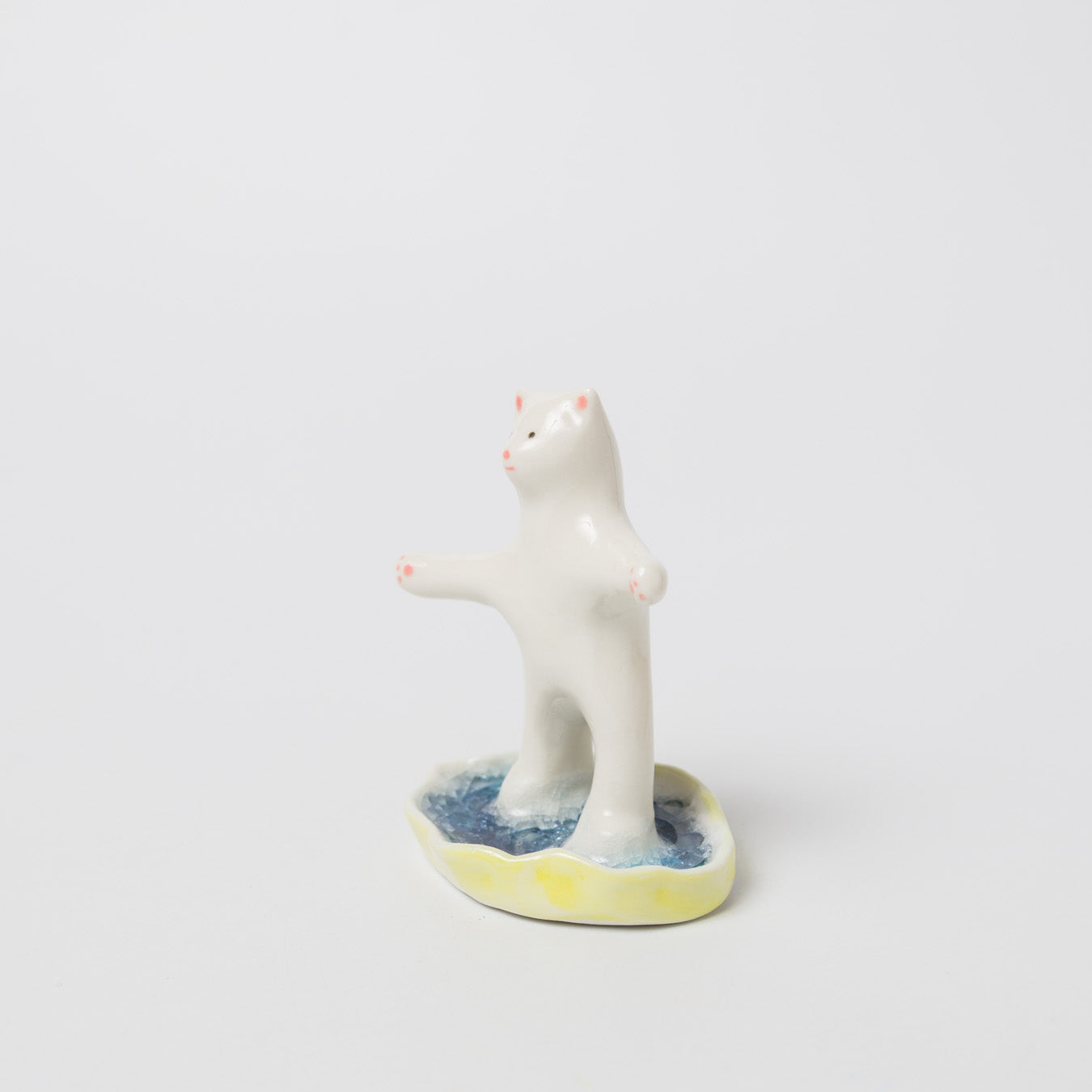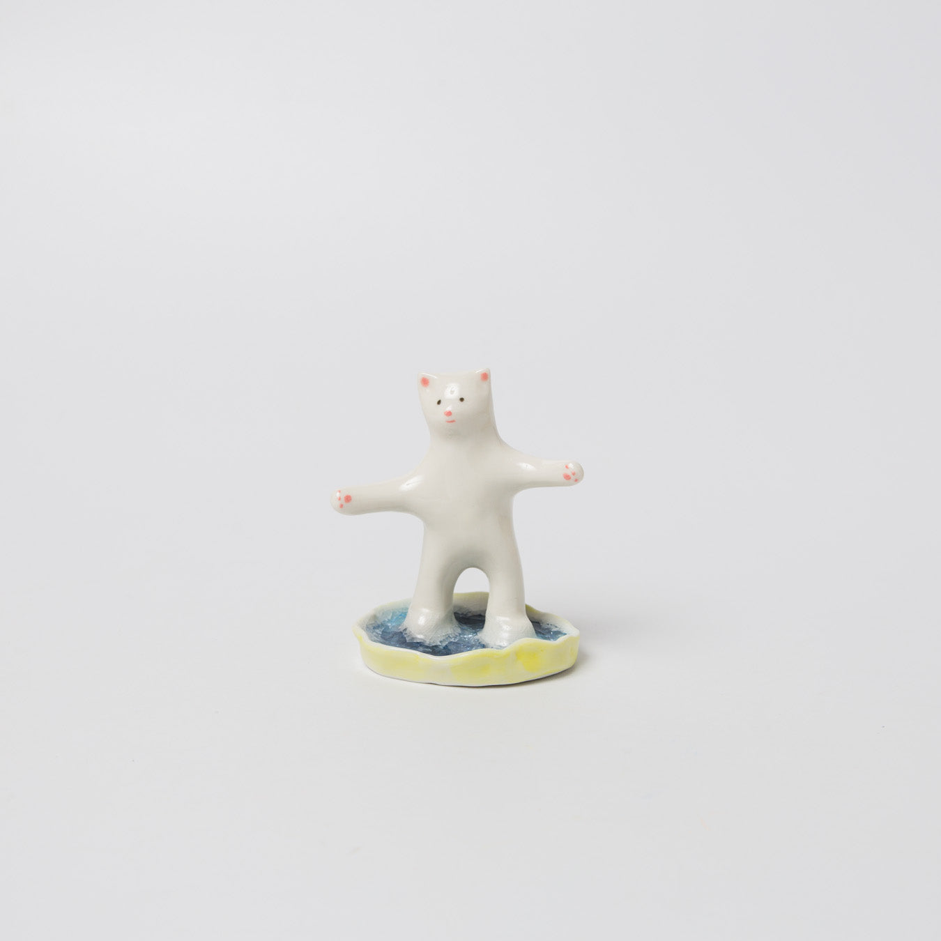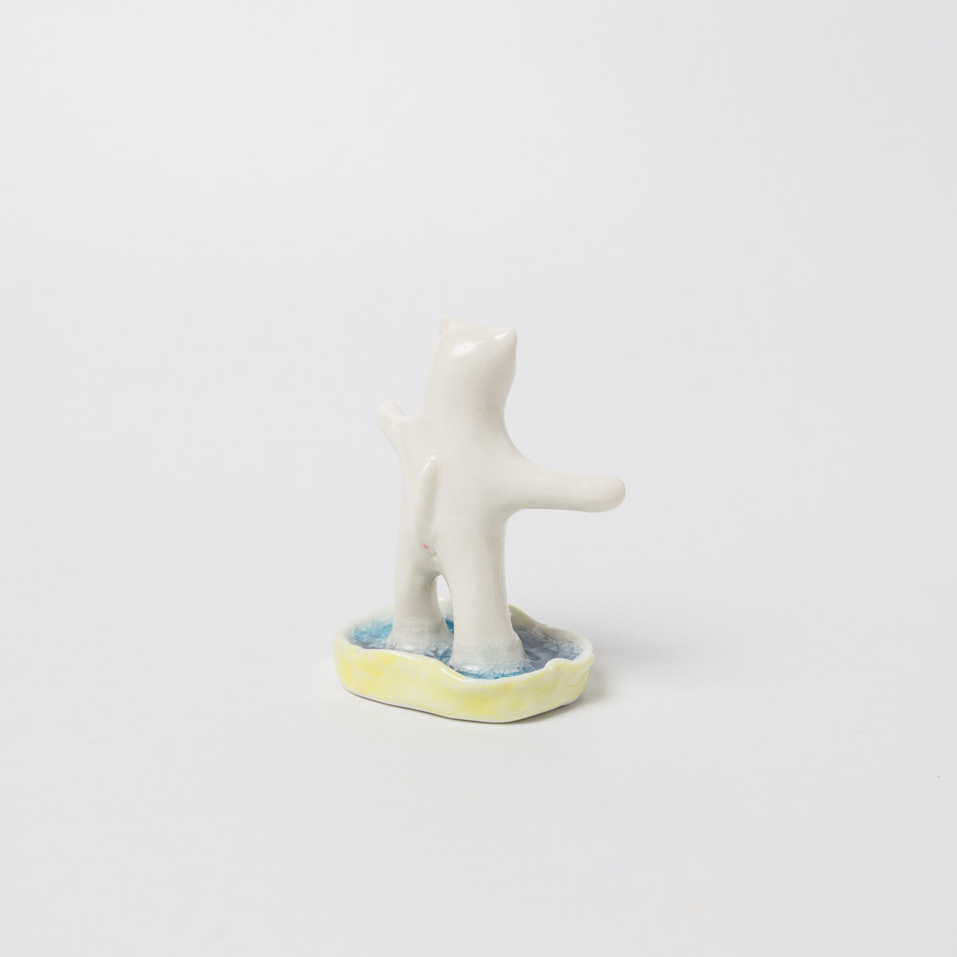 水たまりの真ん中に、ちょこんと立つネコの小さなオブジェ。