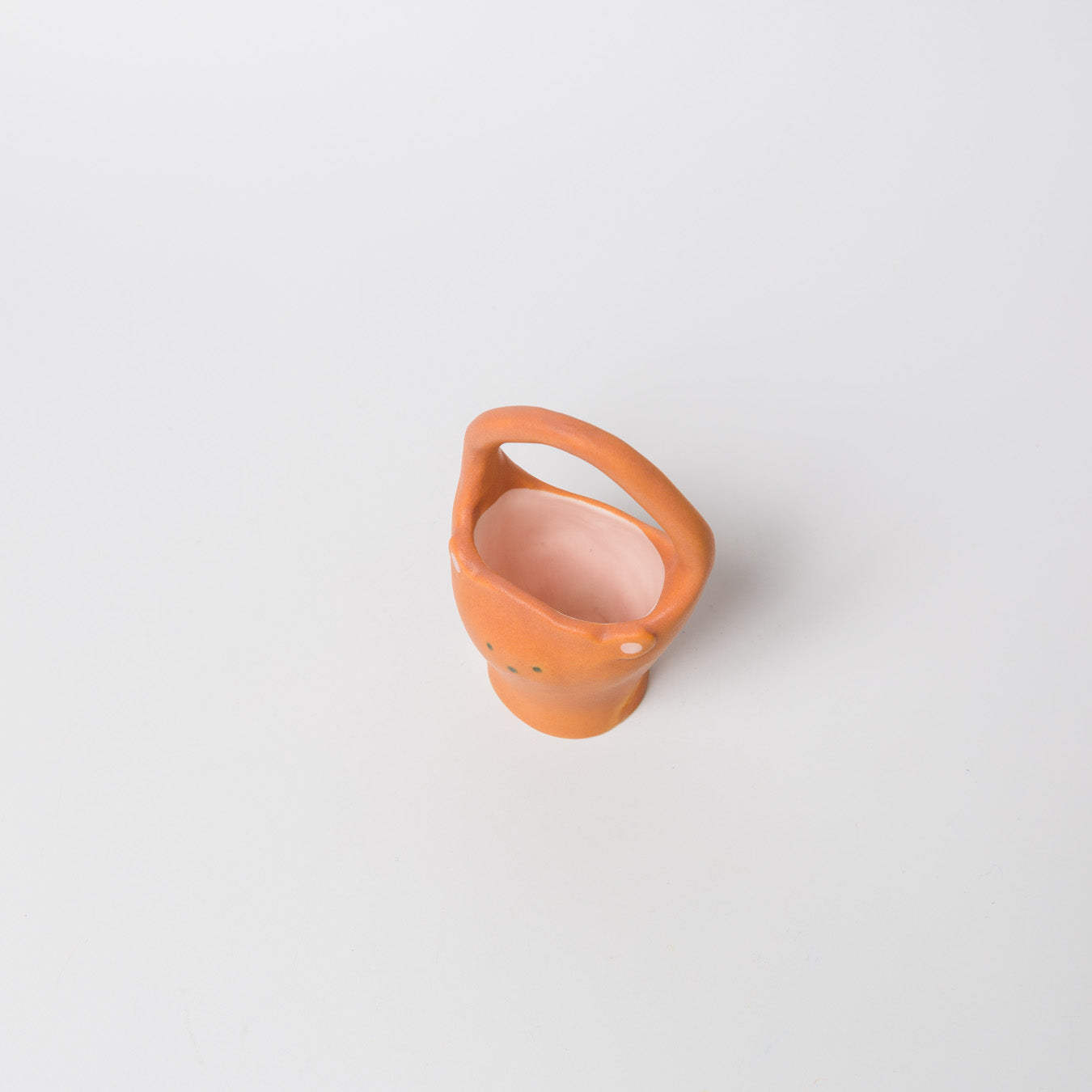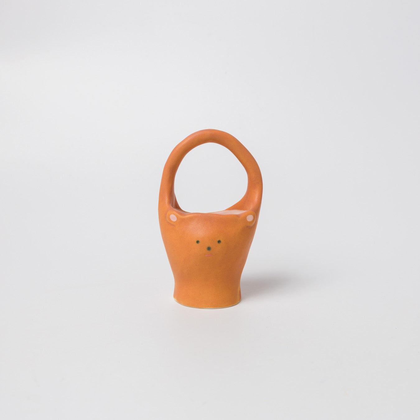 クマの顔が愛らしい、取手付きの陶のオブジェ。