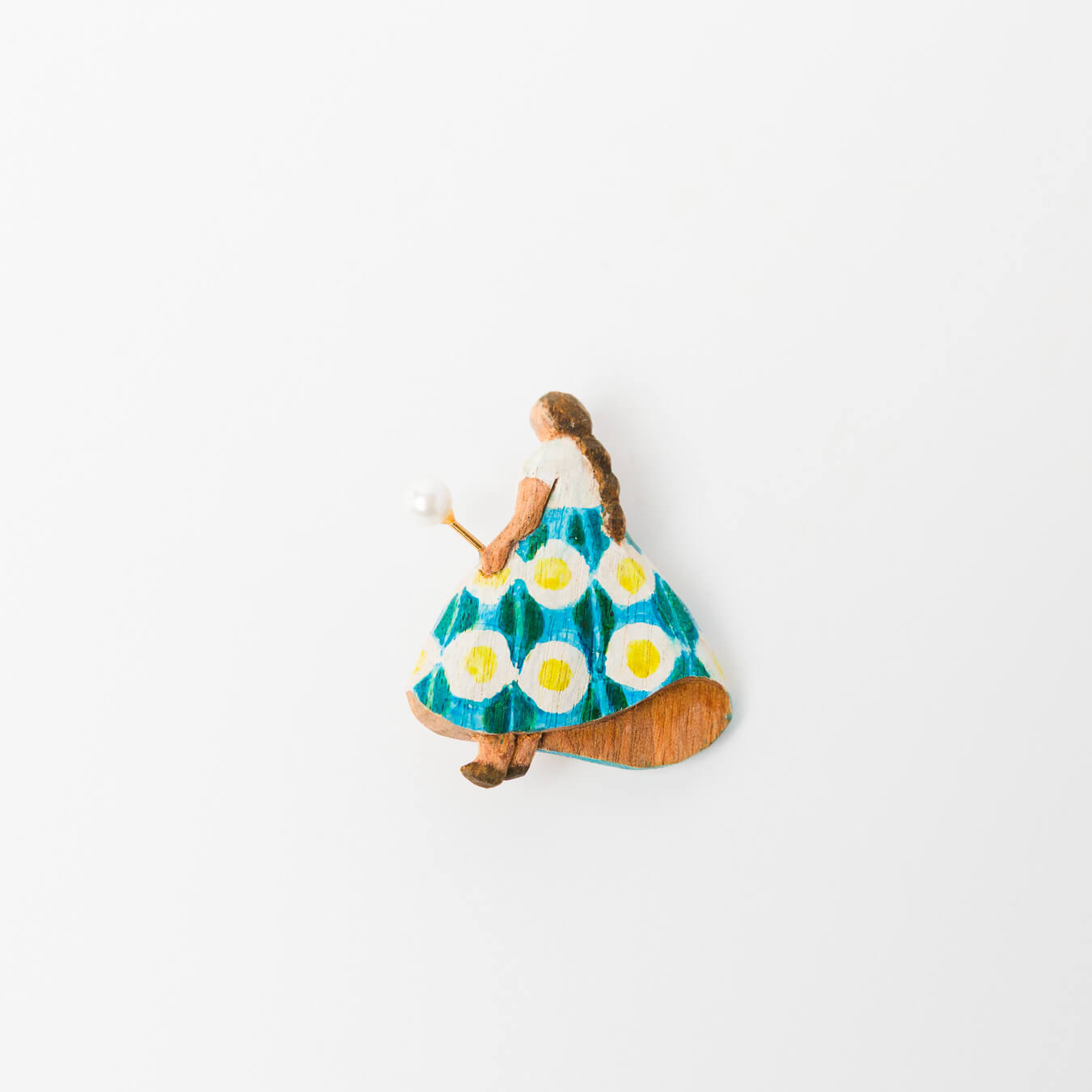 パールのステッキを手にした、三つ編みの少女のブローチ。