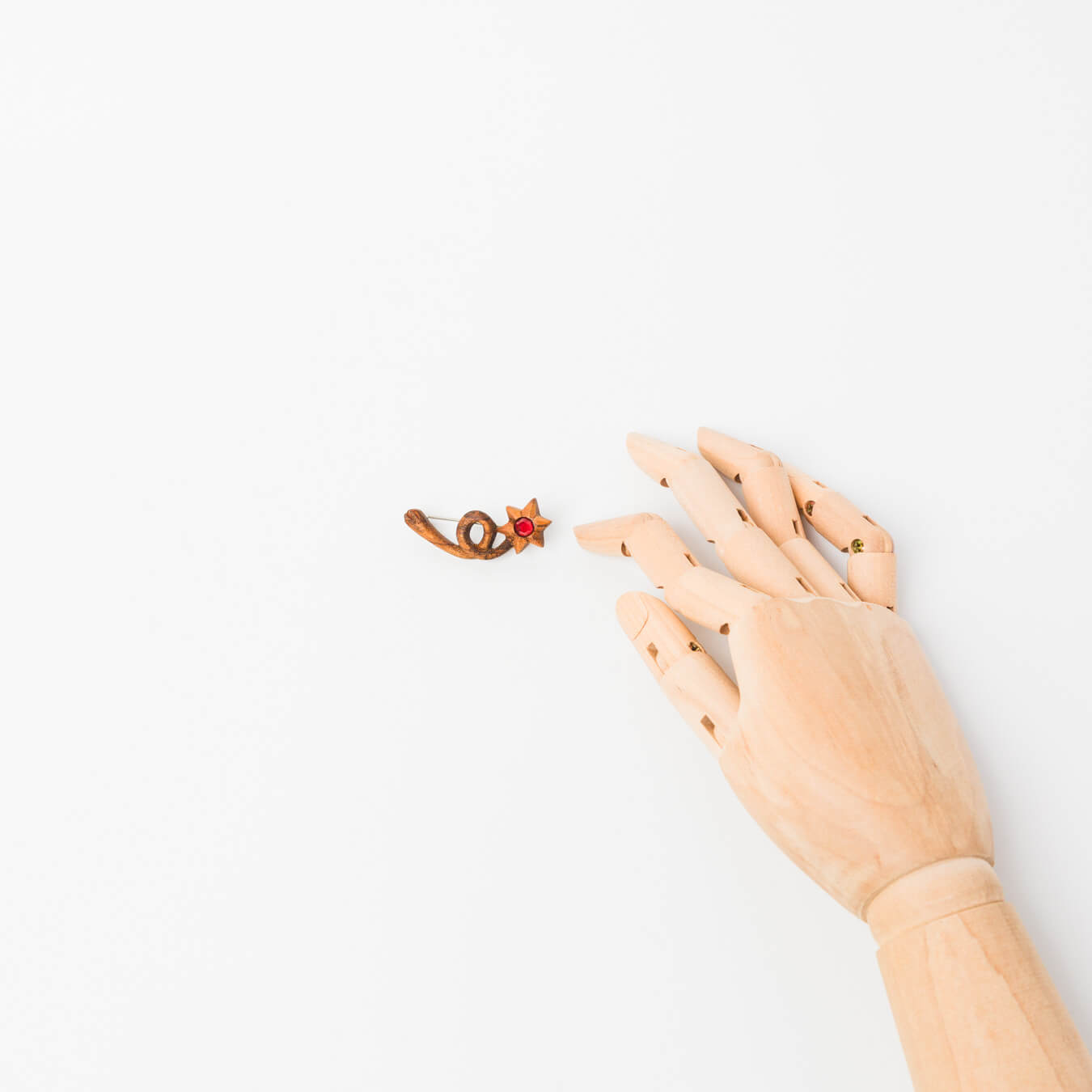 | 素材 | 木(チーク)、ガーネット、ブローチピン |