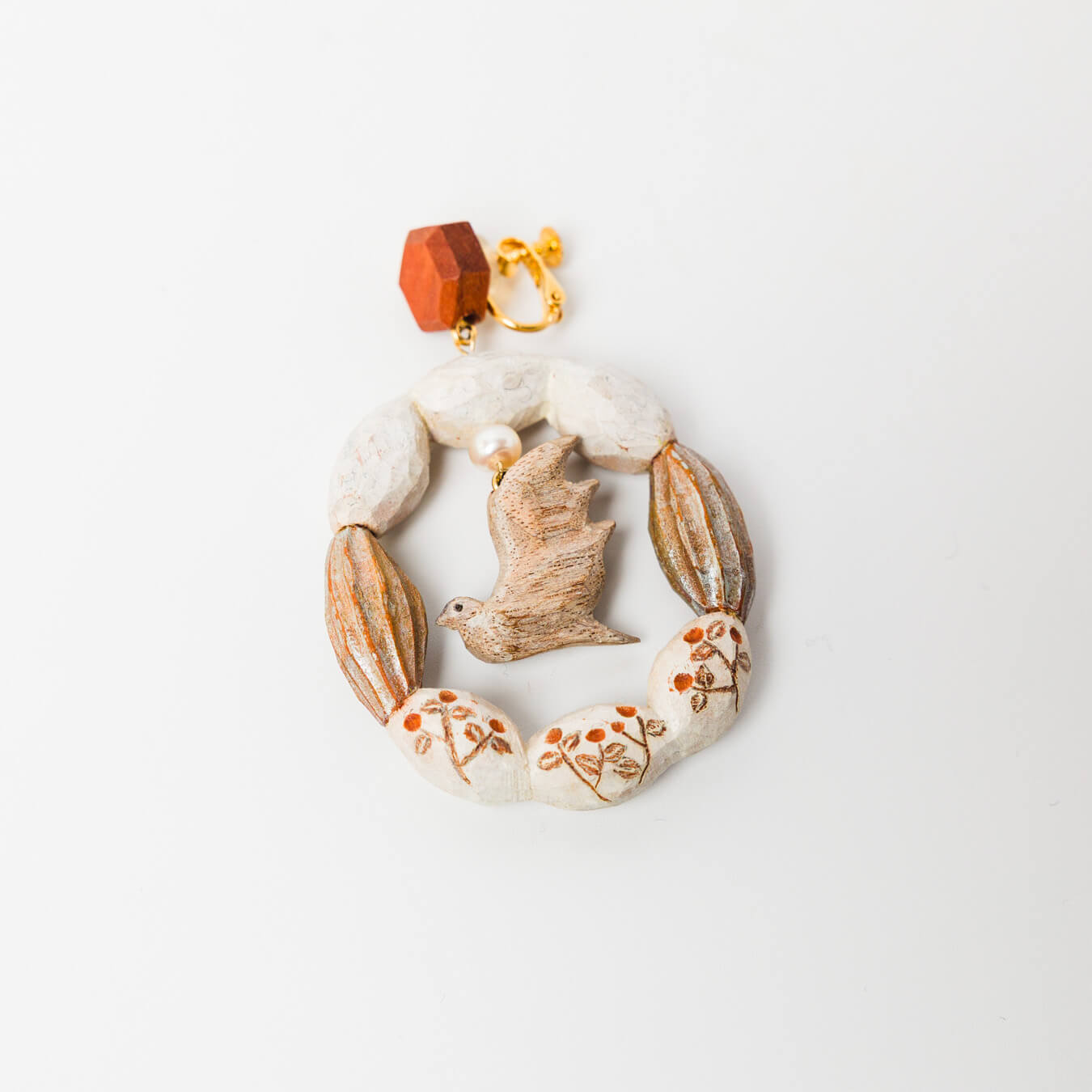 輪の可憐なお花は焼いて絵付けされています。木と花模様、パールの素材感が調和し、ぬくもりを感じるデザインです。存在感があり、装いのアクセントに◎