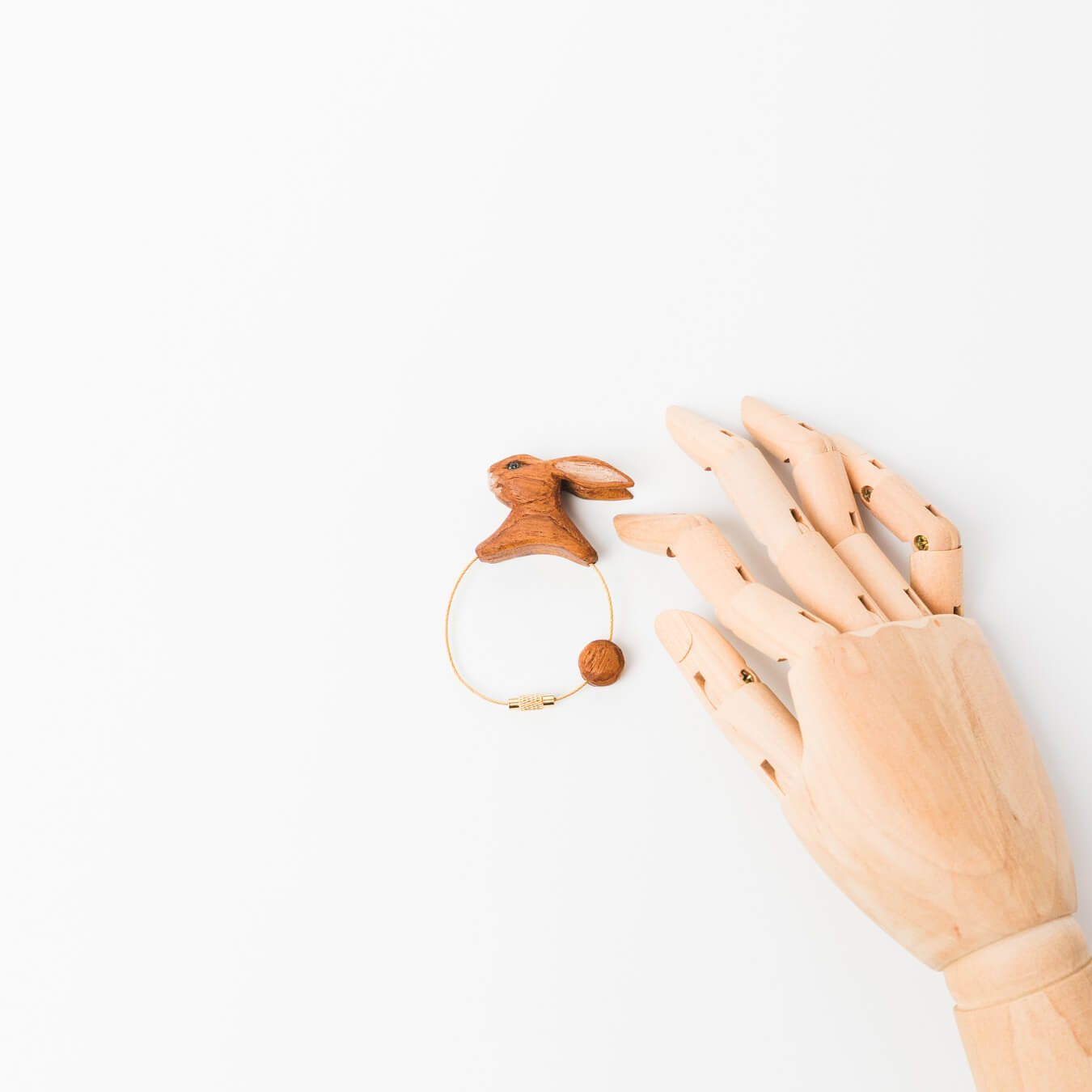 愛らしいうさぎのトルソーをかたどった木製キーホルダー。