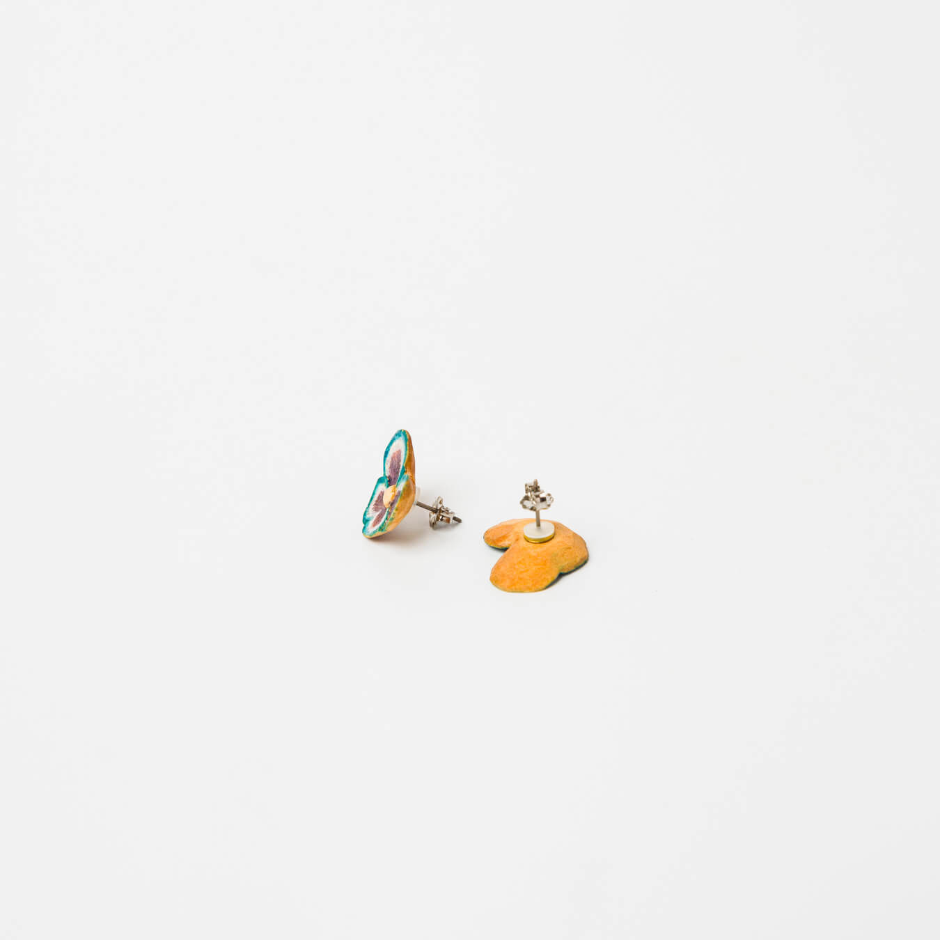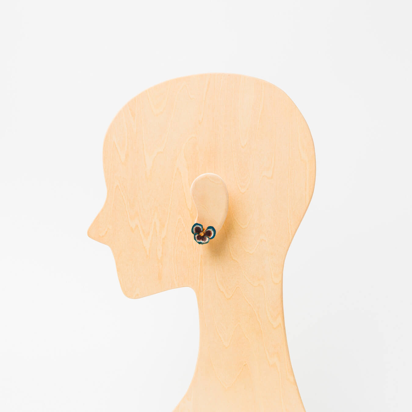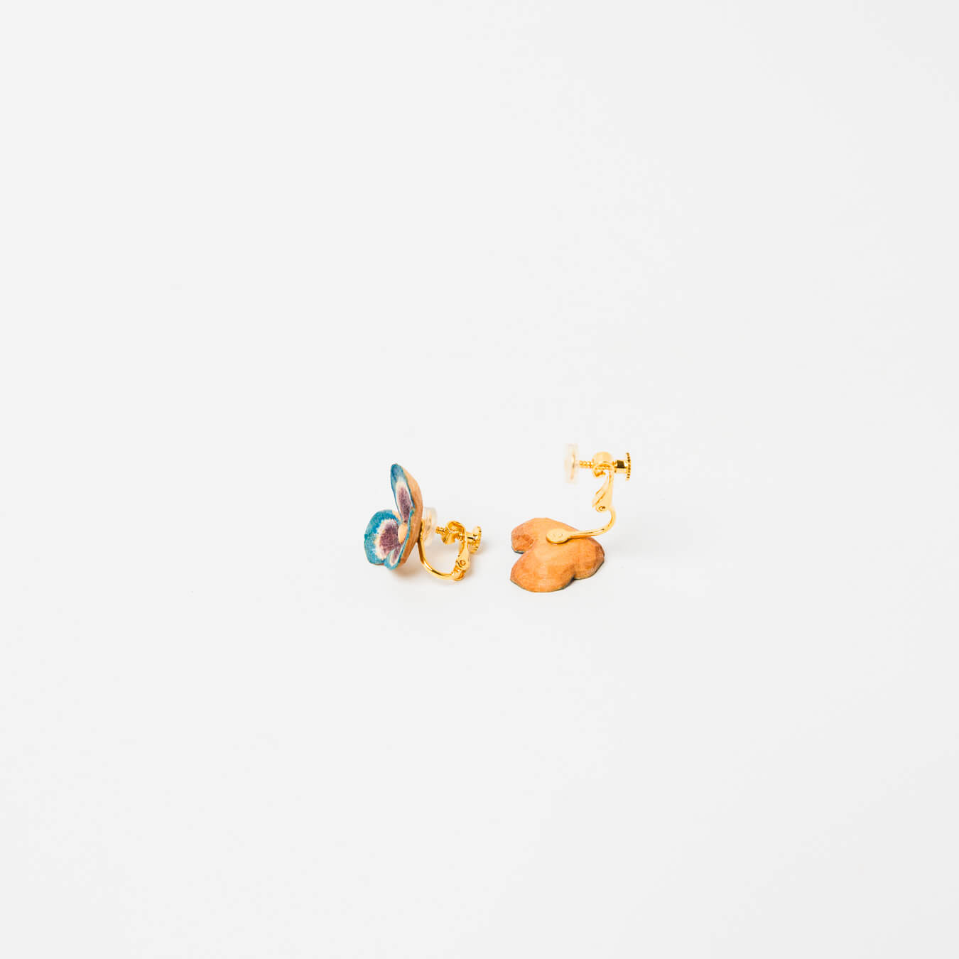 木でかたどったパンジーの花の耳飾り。両耳タイプ。