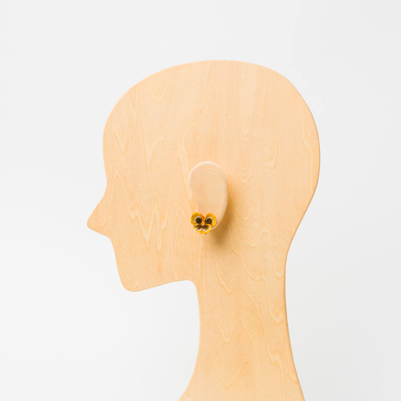 木でかたどったパンジーの花の耳飾り。両耳タイプ。