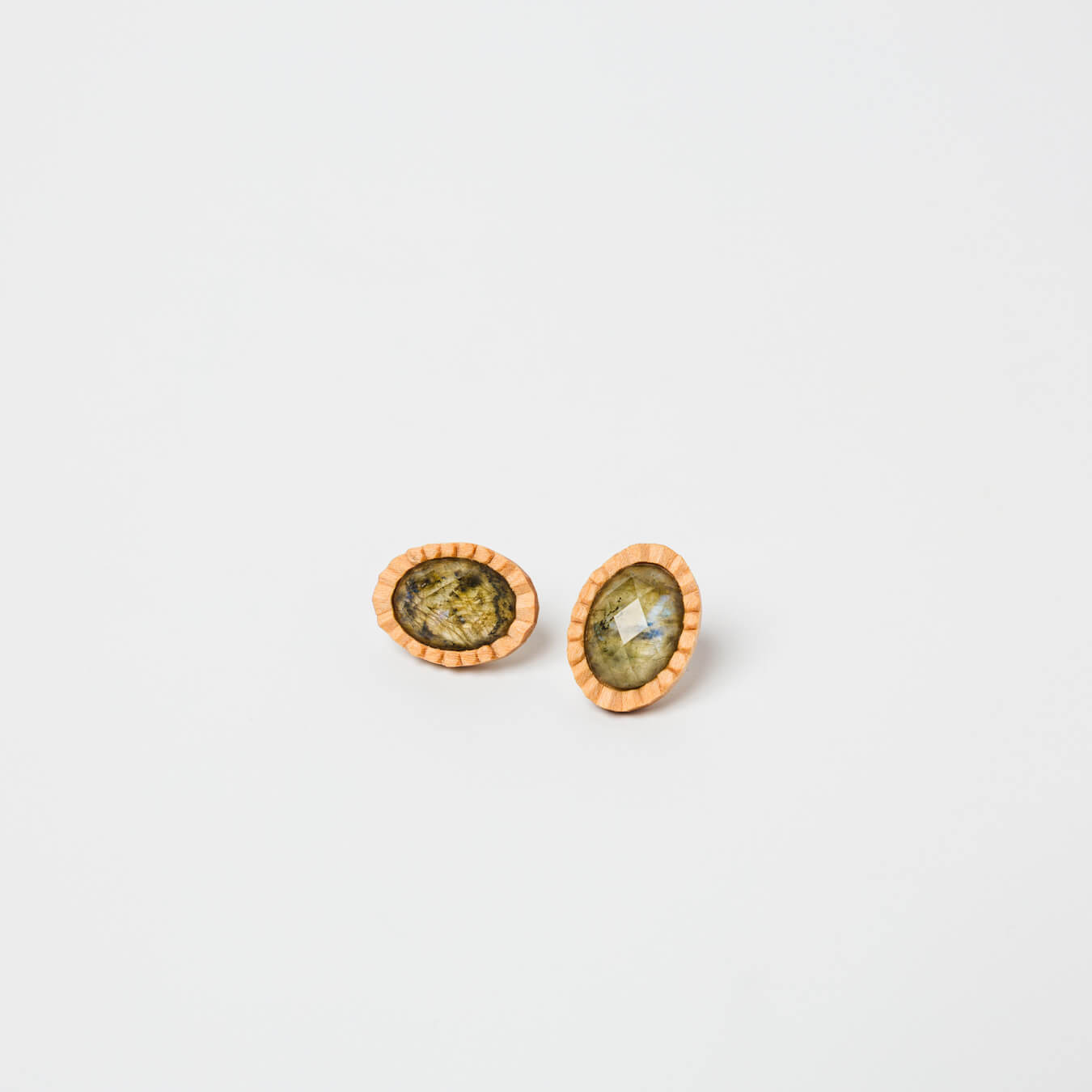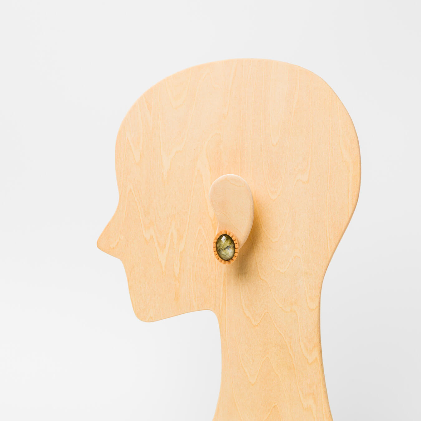 プリーツのように繊細に彫り込まれた木に、天然石をはめこんだクラシカルなデザインの耳飾り。両耳タイプ。