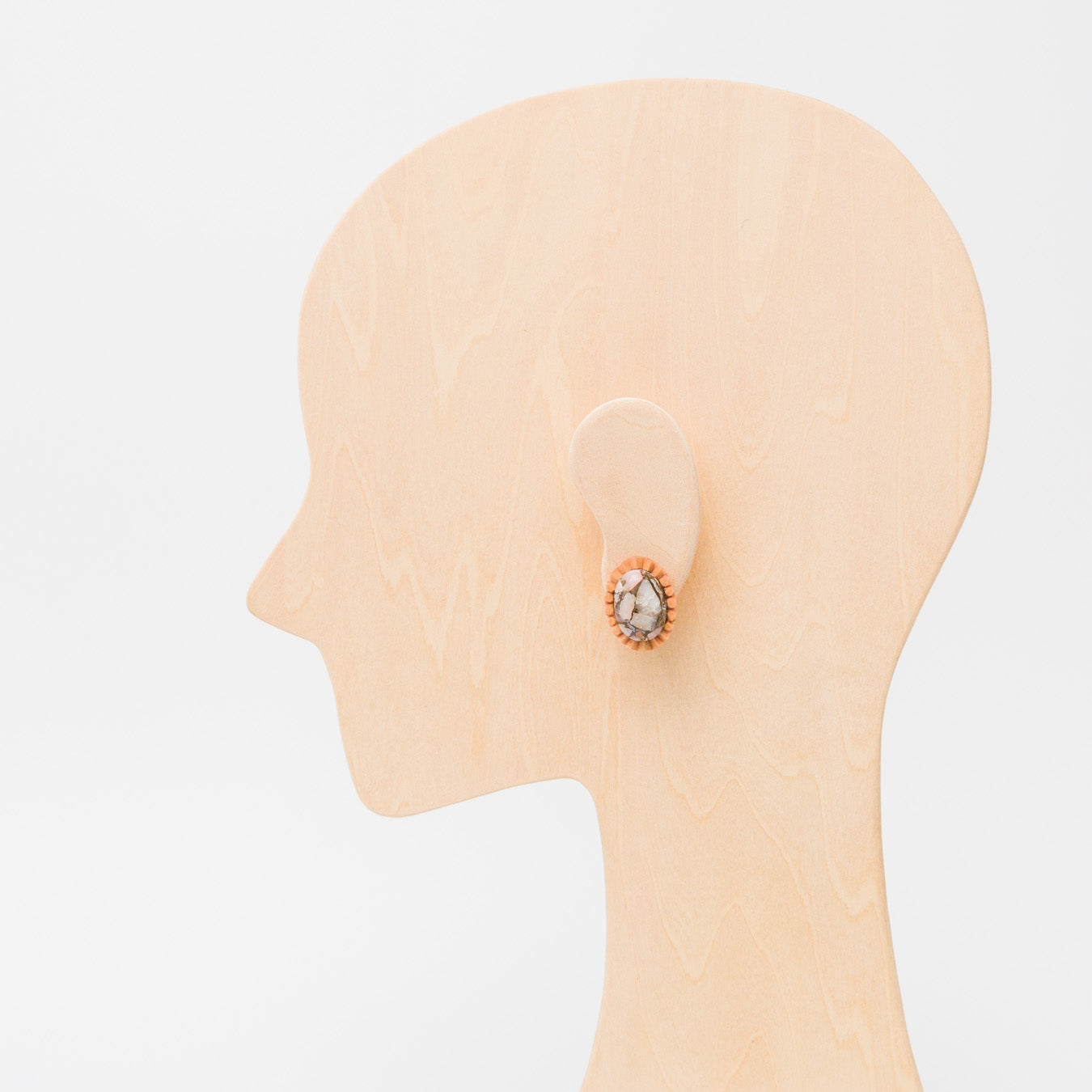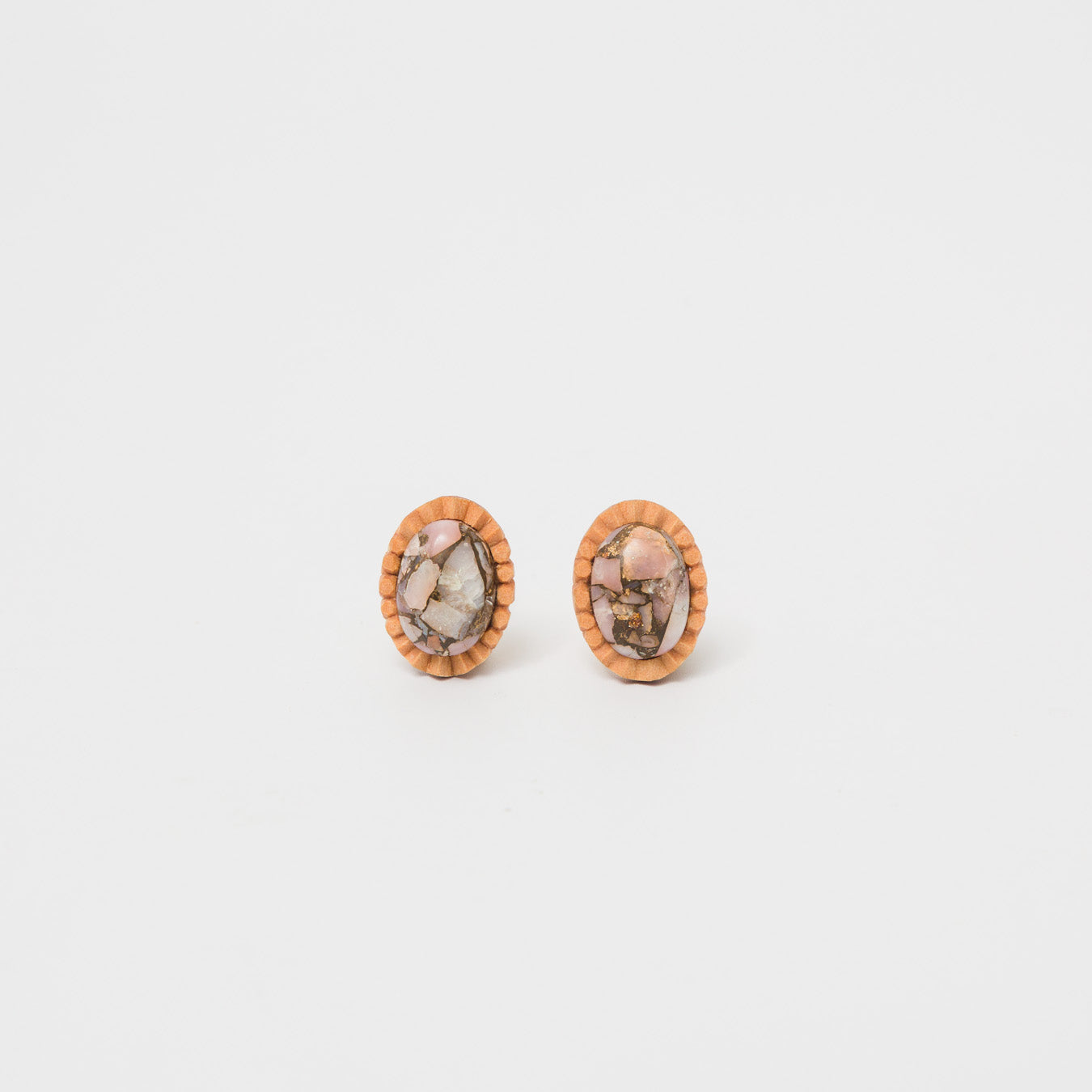 プリーツのように繊細に彫り込まれた木に、天然石をはめこんだクラシカルなデザインの耳飾り。両耳タイプ。
