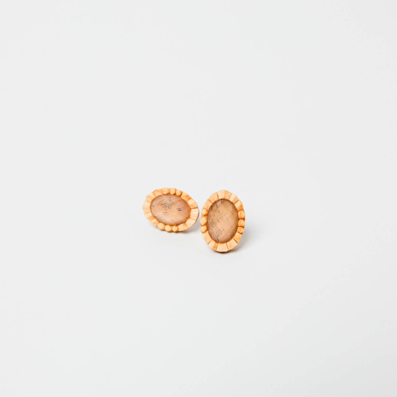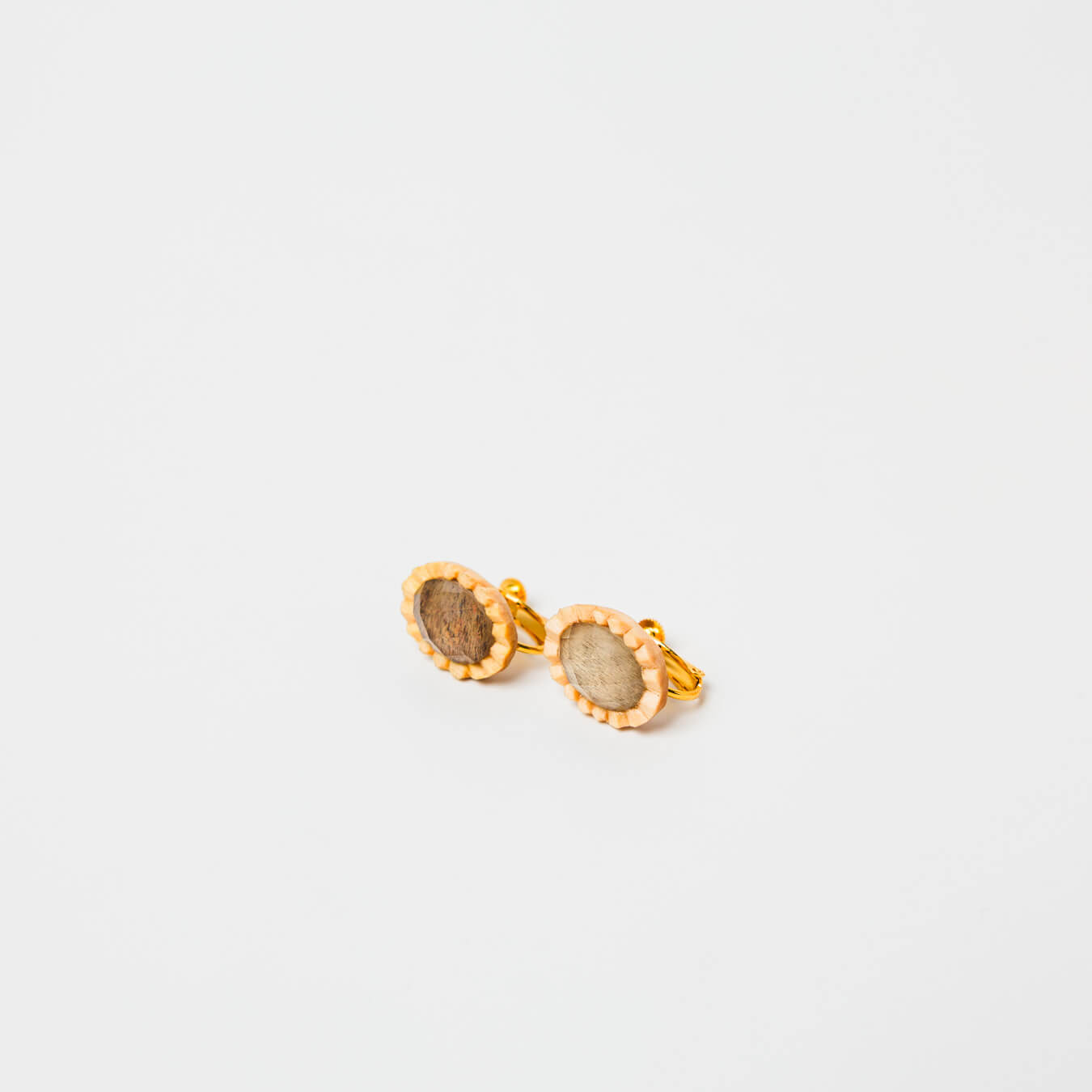 プリーツのように繊細に彫り込まれた木に、天然石をはめこんだクラシカルなデザインの耳飾り。両耳タイプ。