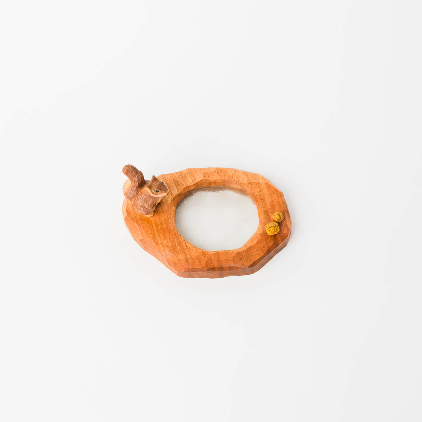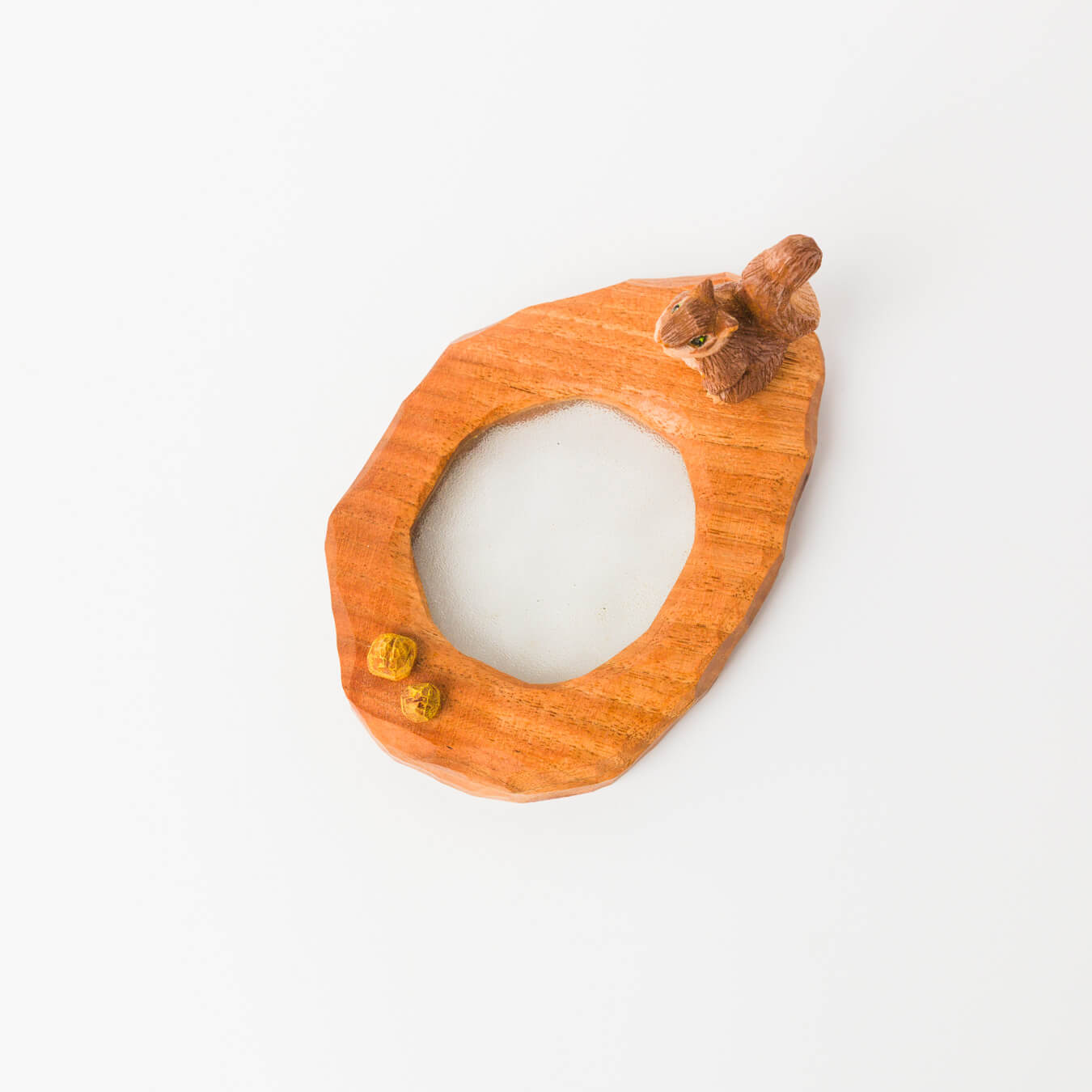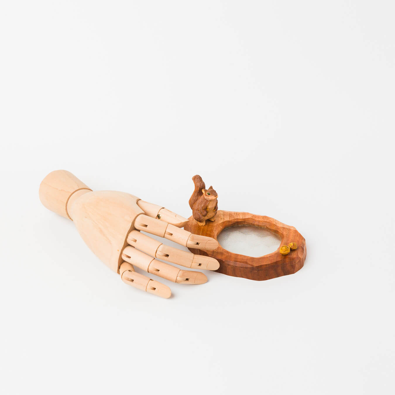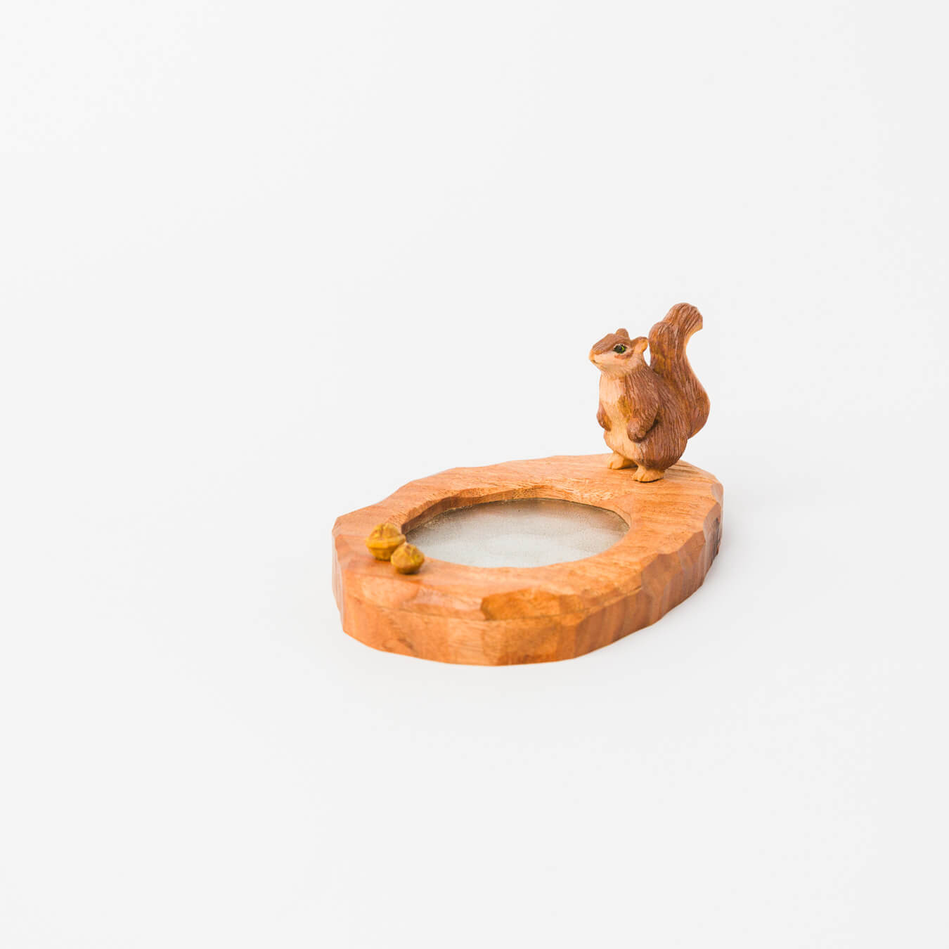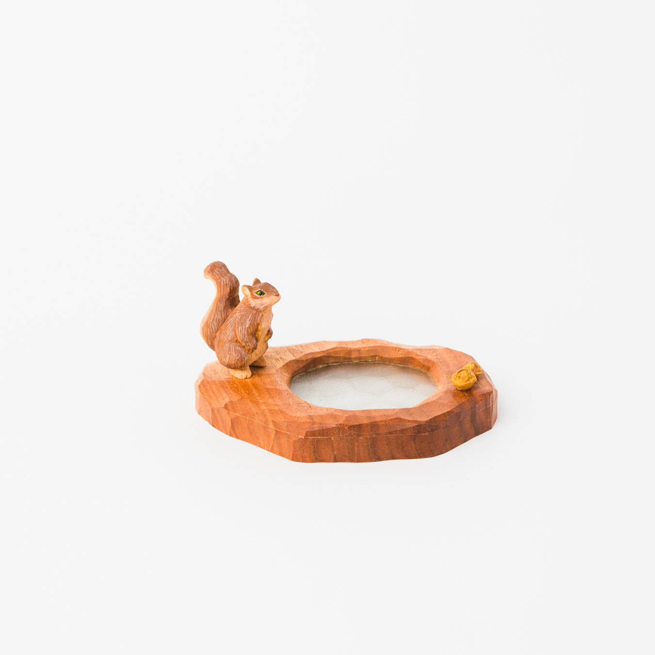 リスのモチーフが印象的な木製のオブジェ。つぶらな瞳が愛らしい佇まいです。