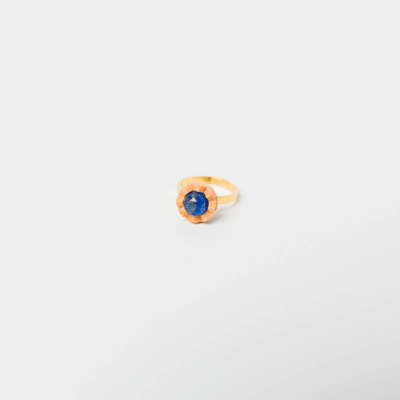プリーツ模様に彫った木に、天然石をはめこんだクラシカルなデザインで、