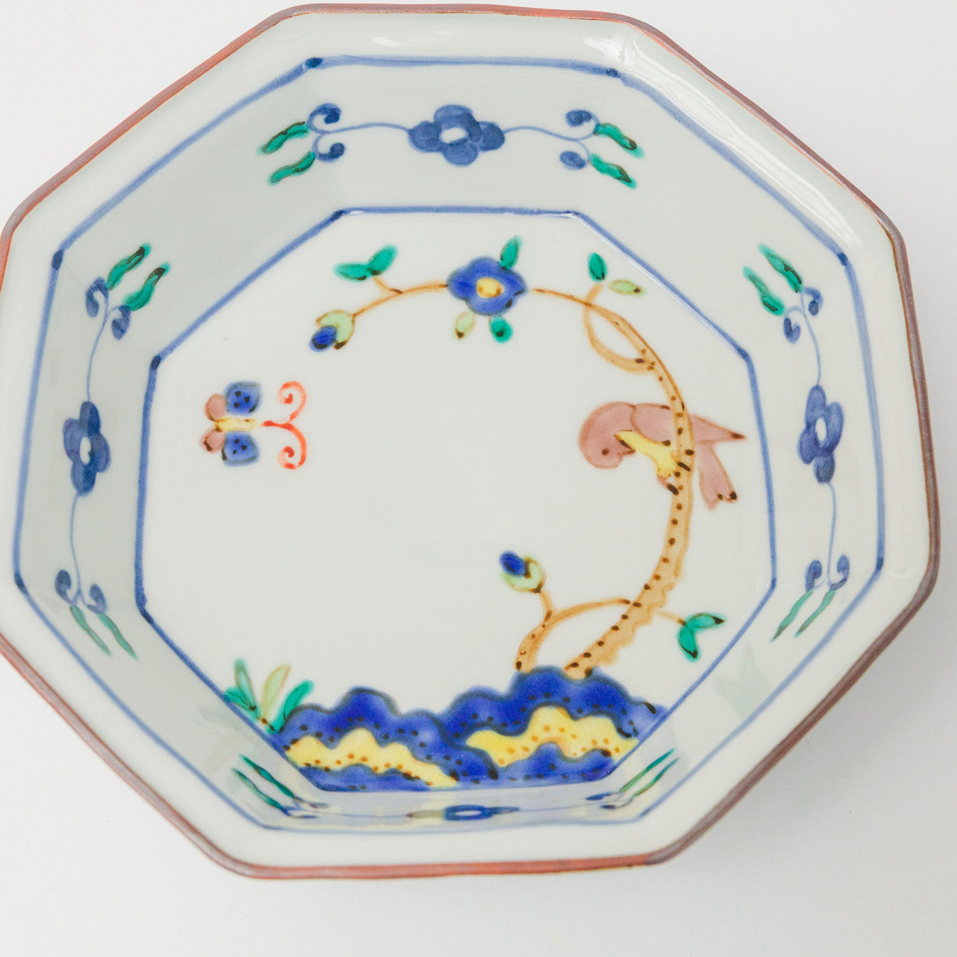 青い花の咲く枝にとまる鳥が描かれた、華やかで物語のある八角鉢。