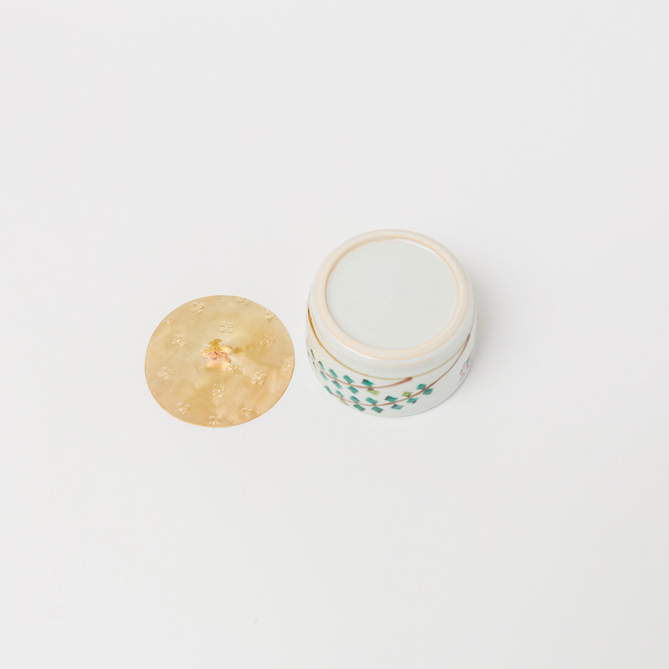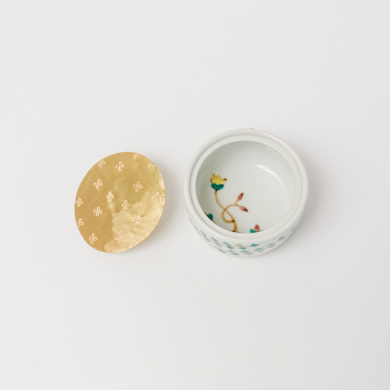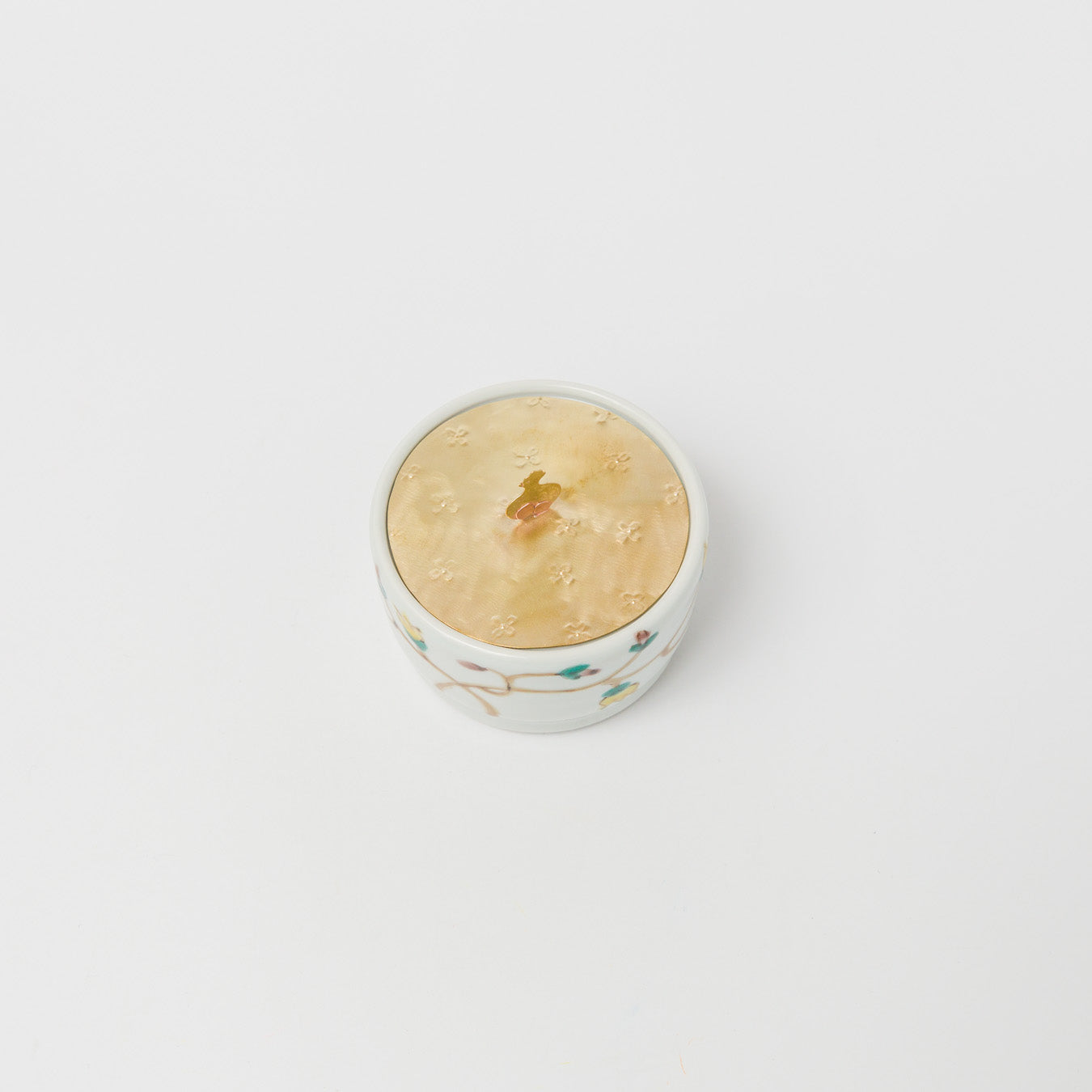 色絵の花模様がめぐる陶器に、真鍮の蓋を合わせた小箱。