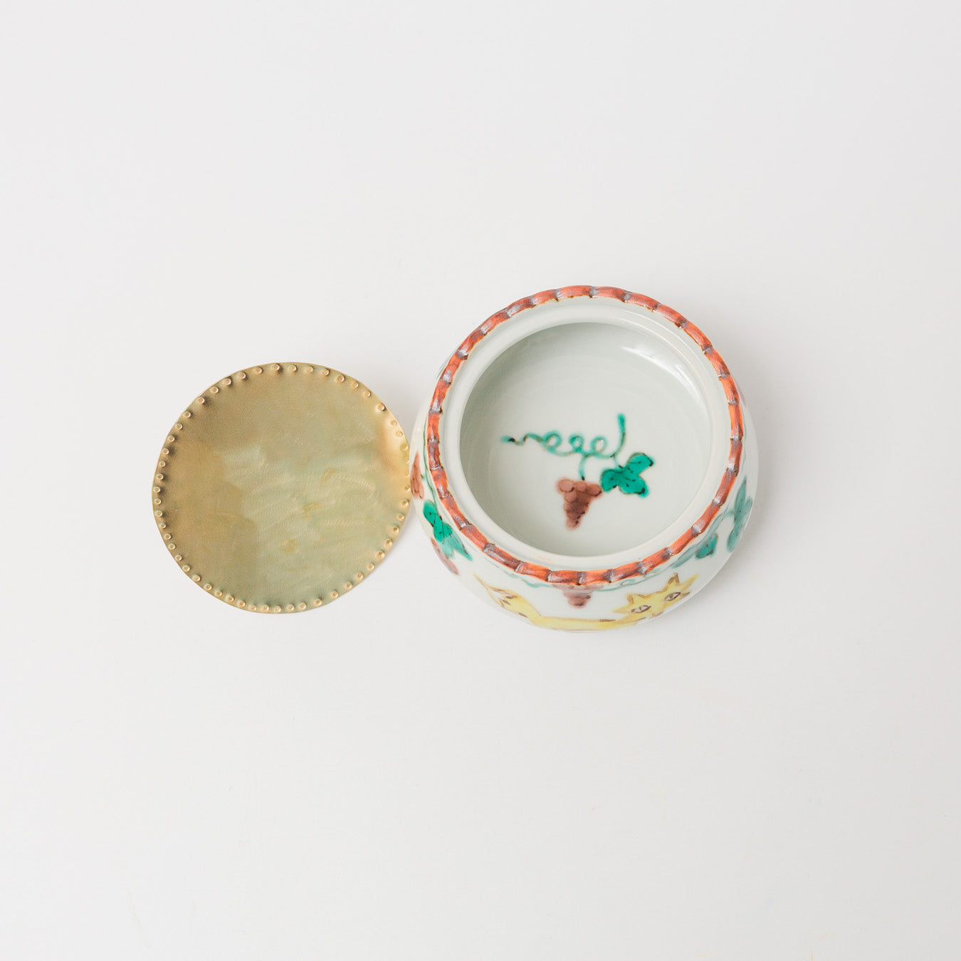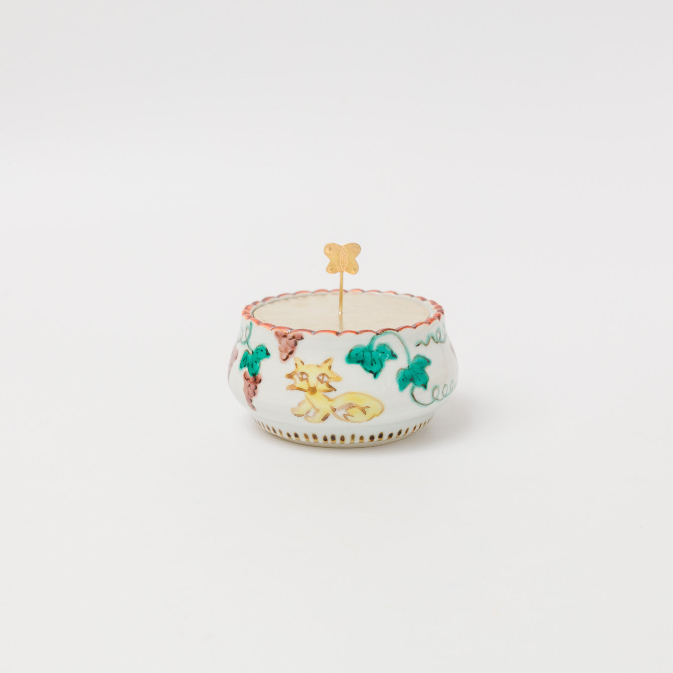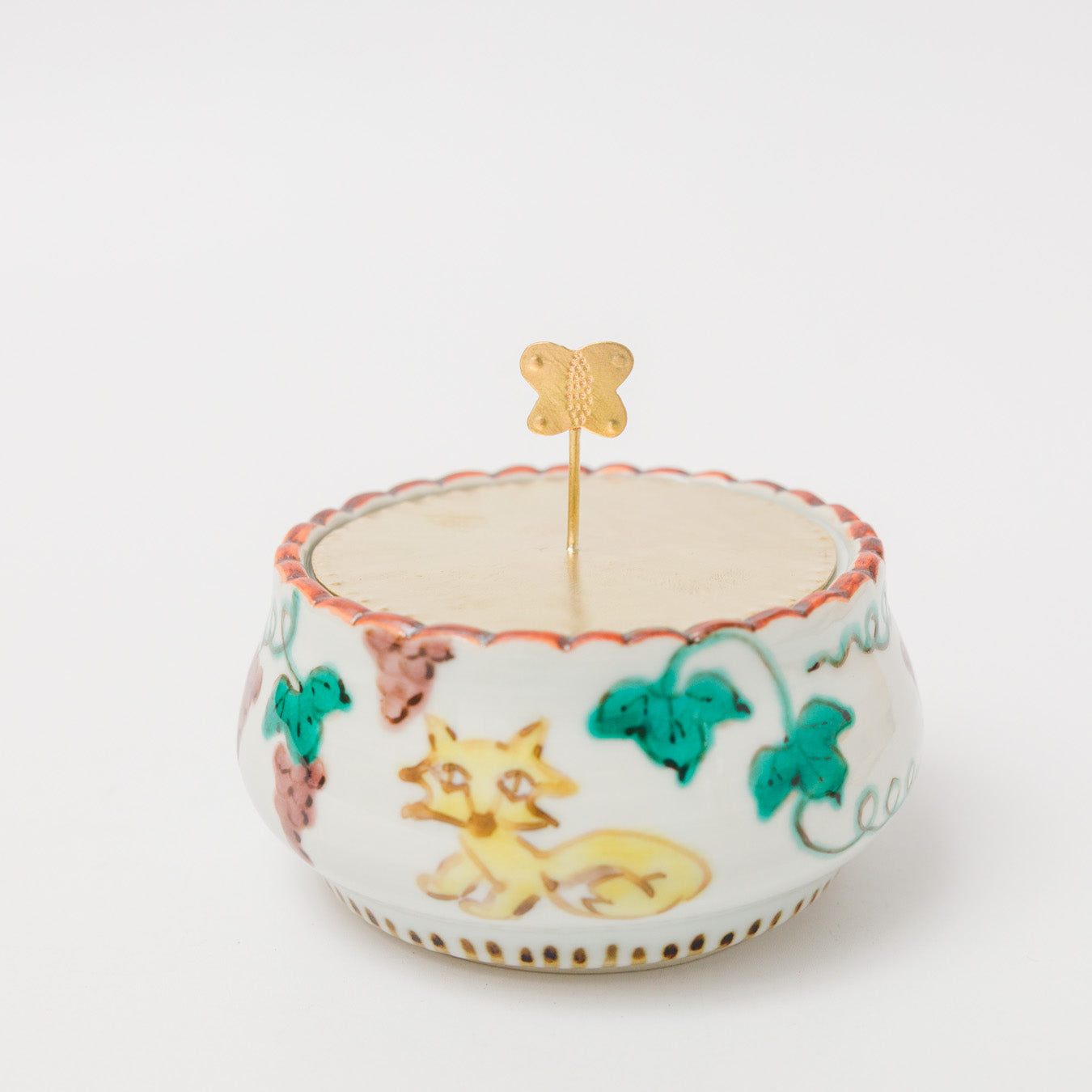 どこかとぼけた表情のきつねと、たわわに実るぶどうの絵柄が愛らしい小箱。