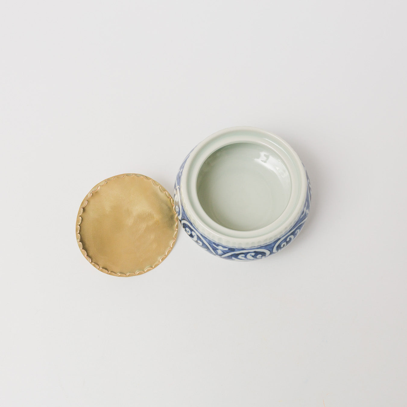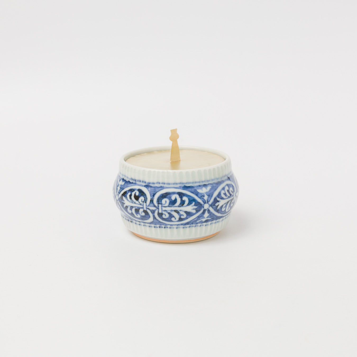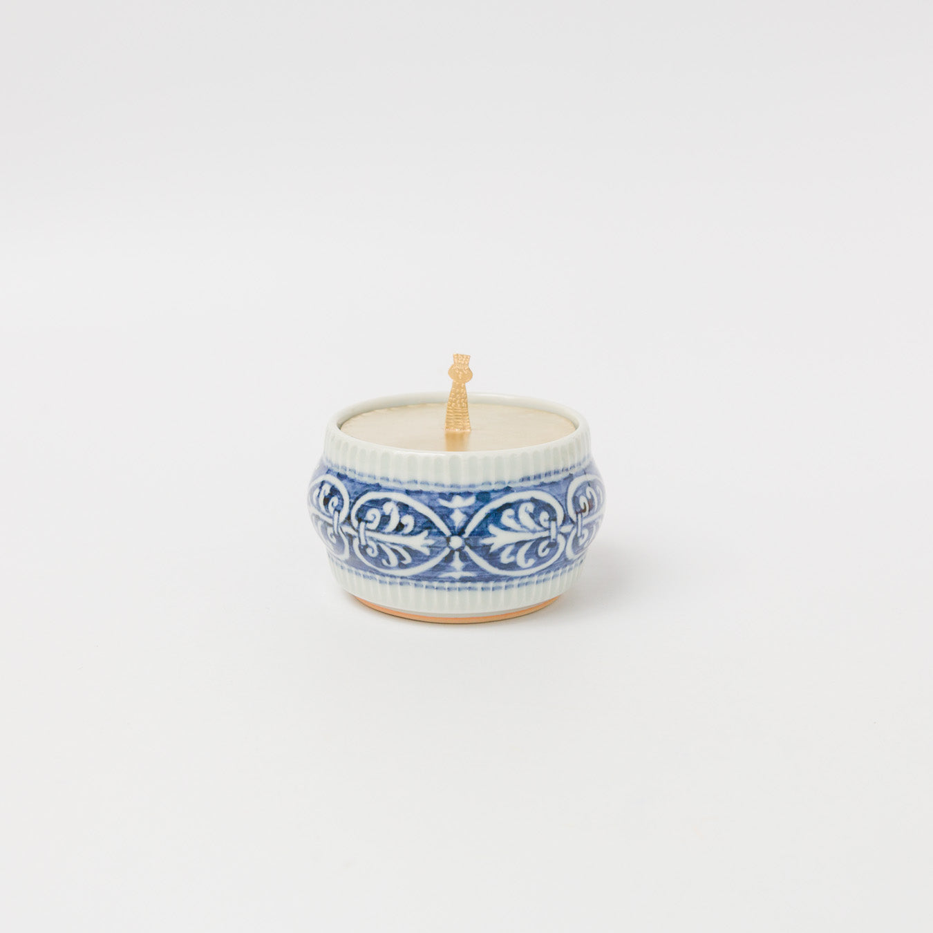 染付で描かれた細やかな唐草模様が、ぐるりとめぐる小箱。
