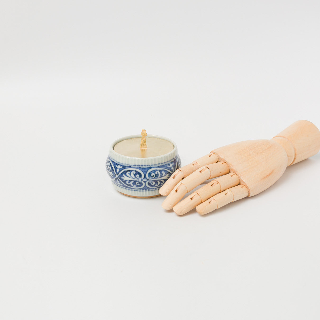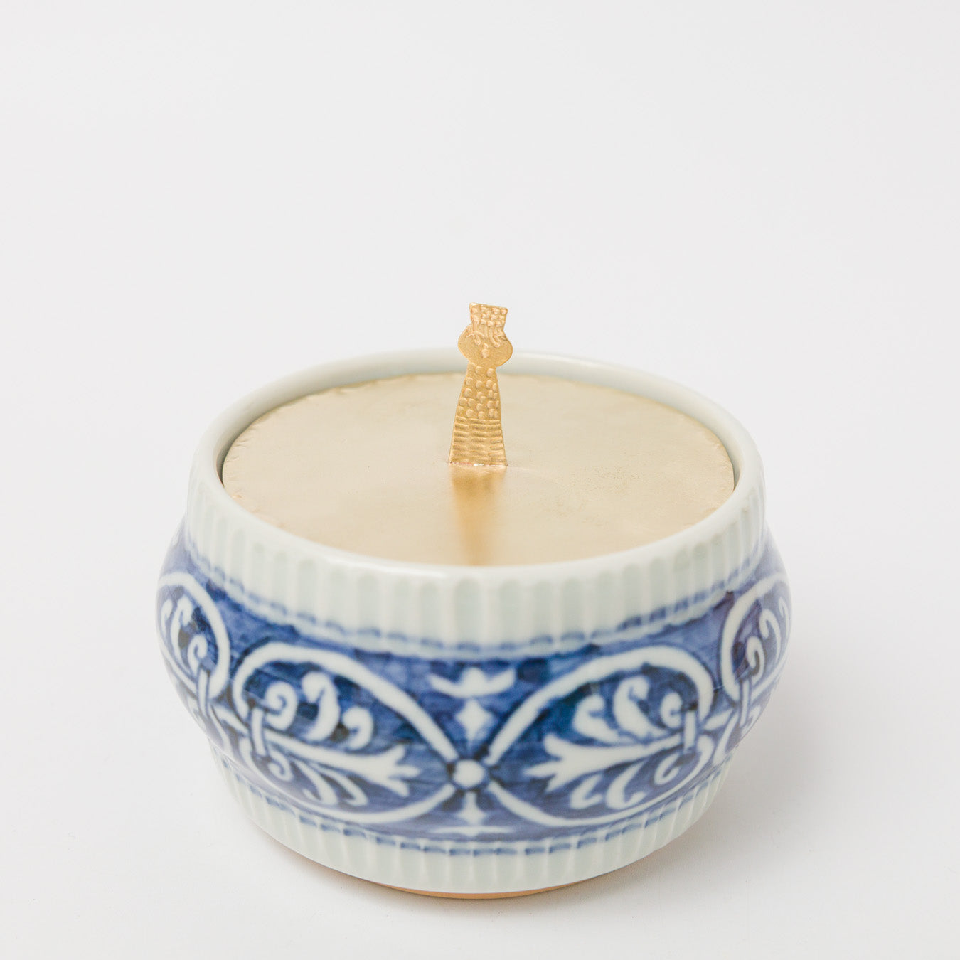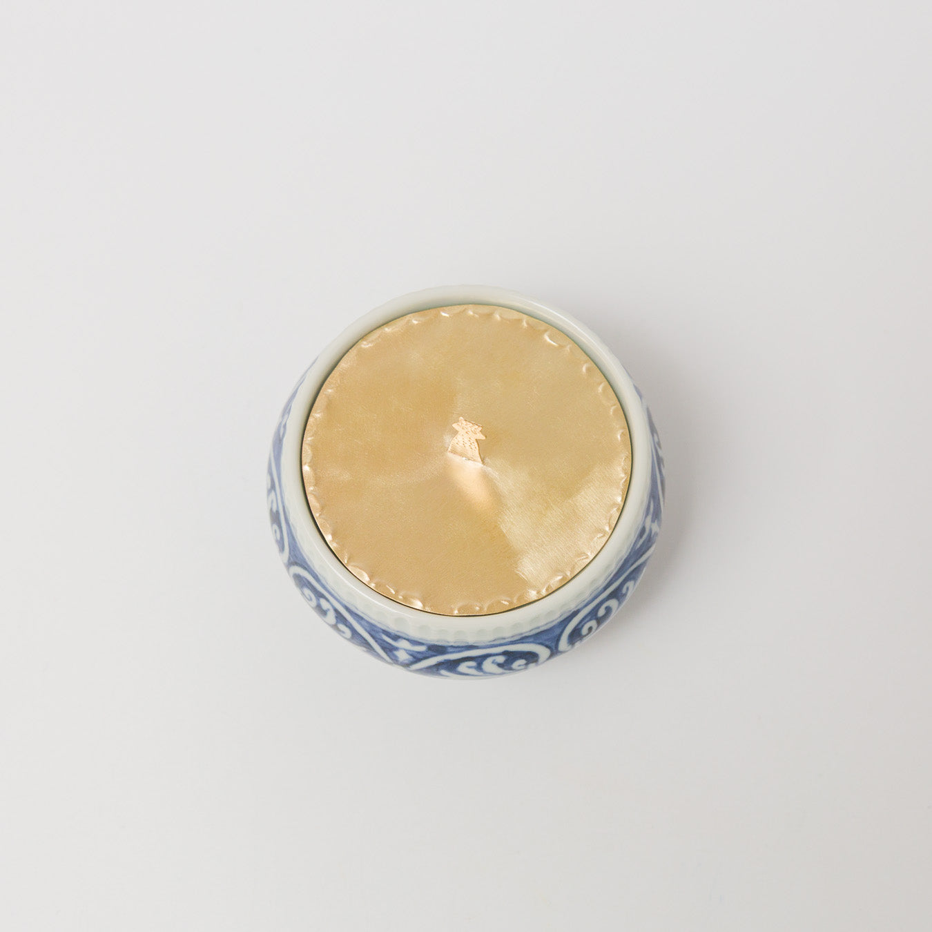 染付で描かれた細やかな唐草模様が、ぐるりとめぐる小箱。