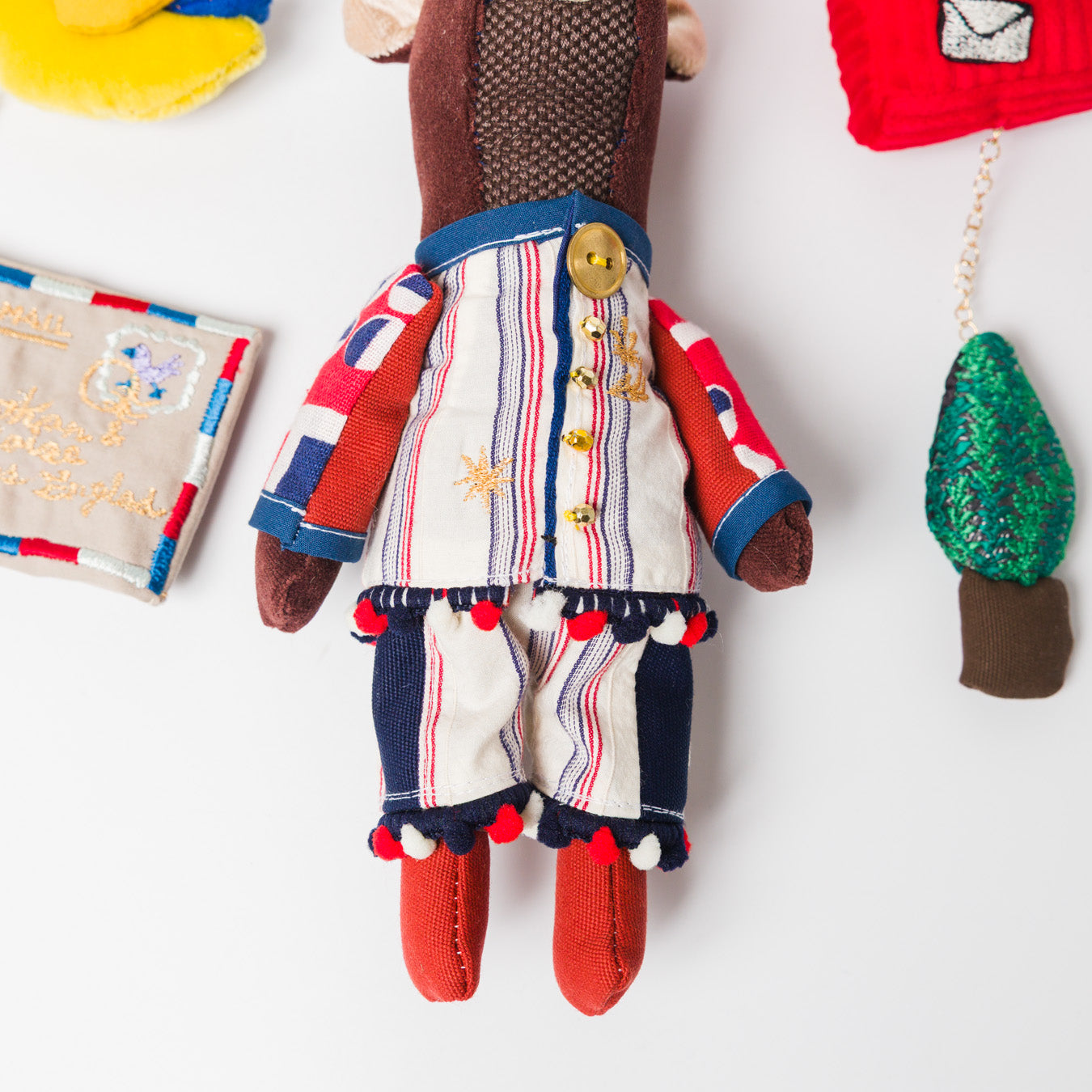 海外のインテリアファブリックを中心に使用したぬいぐるみ。横振り刺繍を仕様したモチーフなど。