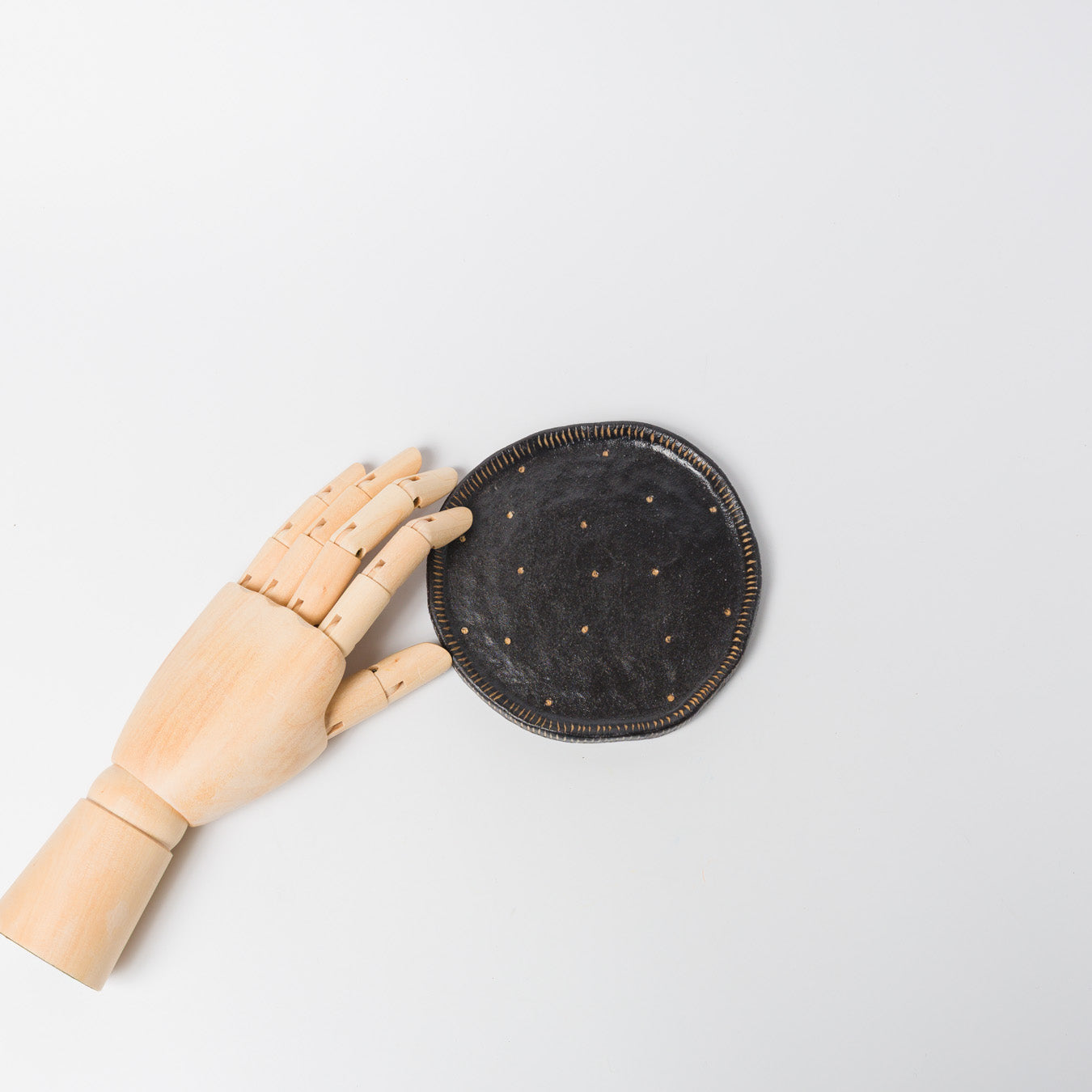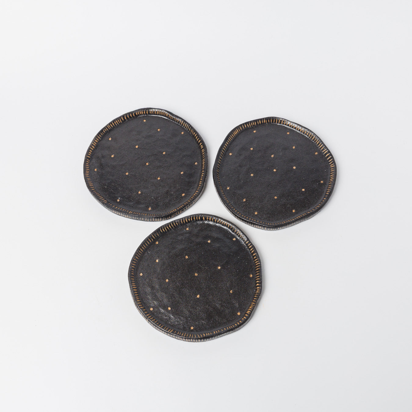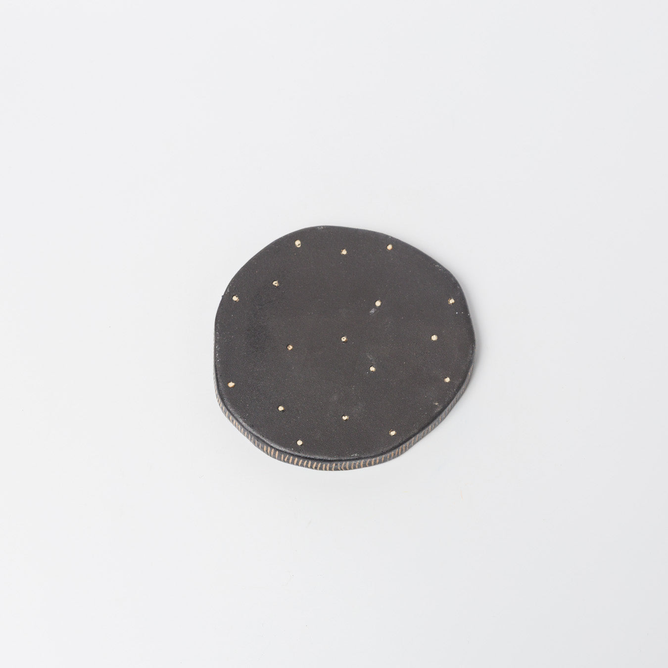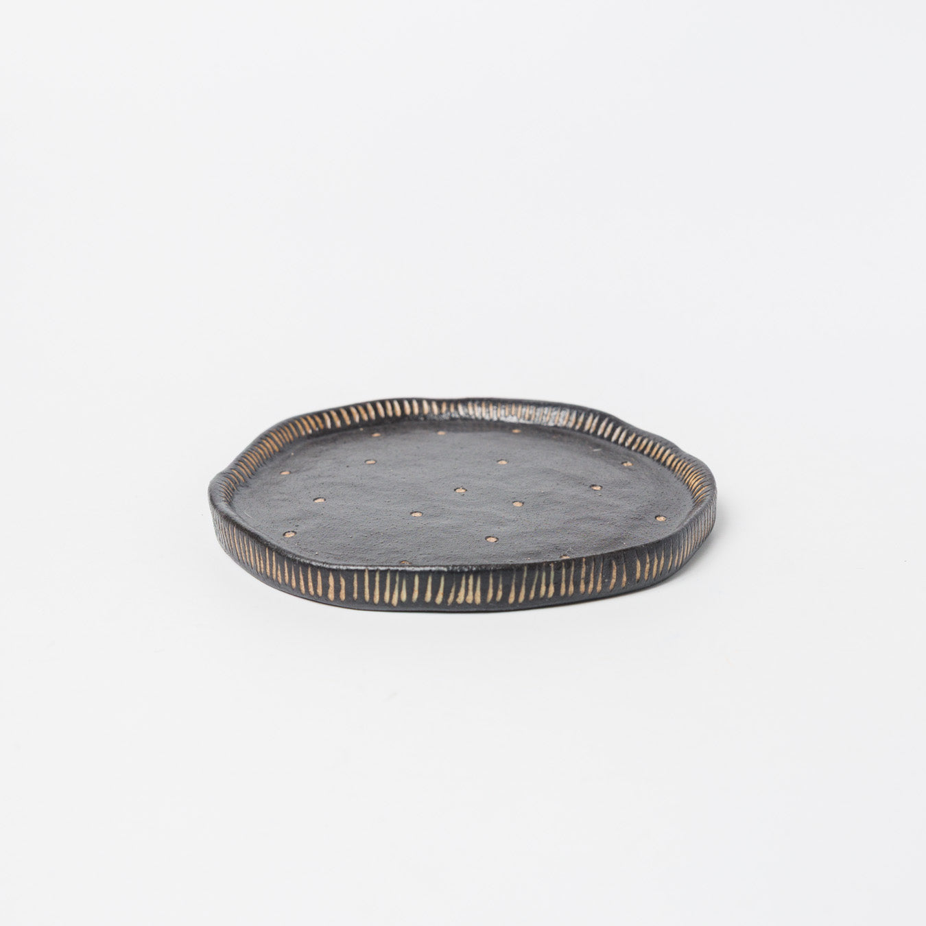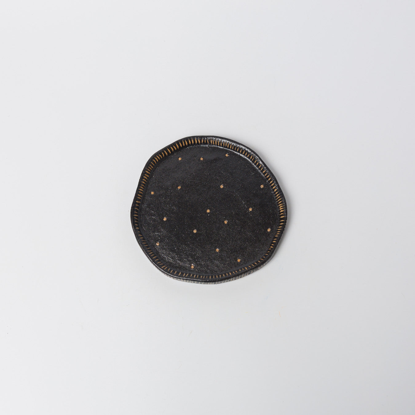 黒色ベースに、掻き落とし技法によるドット模様と縁のラインがアクセントになっています。手仕事ならではの“ゆがみ”が魅力です。