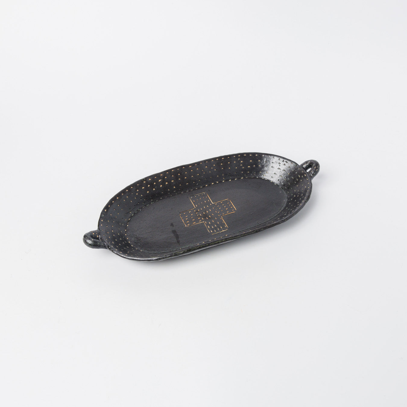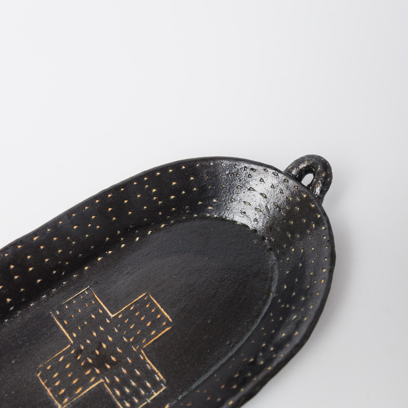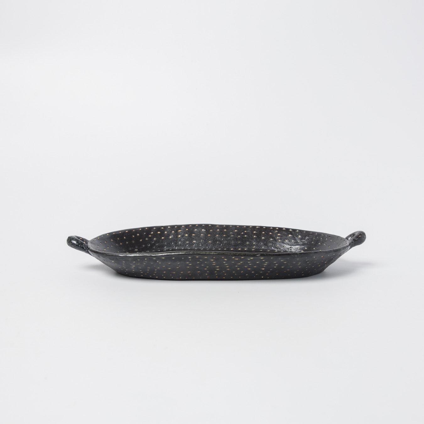 黒を基調とした落ち着いた佇まいに、模様がさりげないアクセントになっています。盛り皿としても使いやすいサイズです。黒はどんな料理も相性よく、美味しく引き立てます。