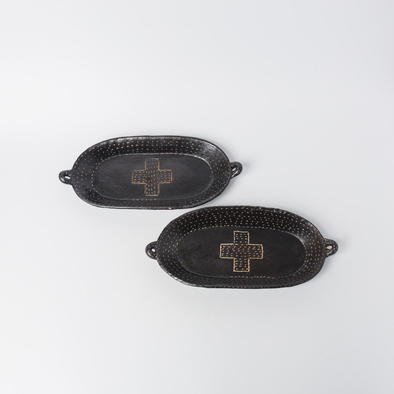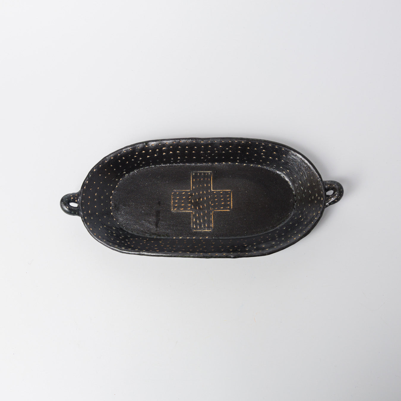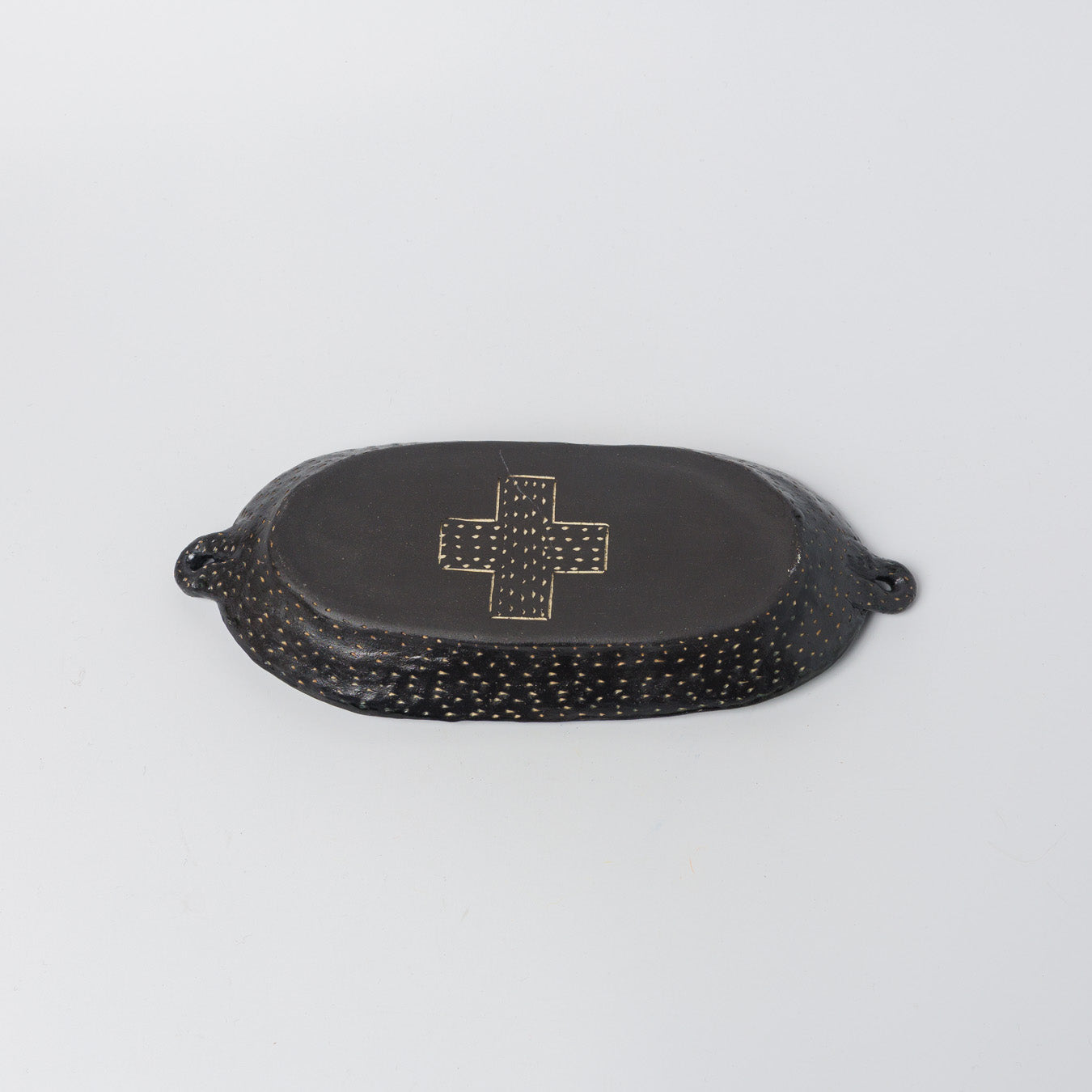 黒を基調とした落ち着いた佇まいに、模様がさりげないアクセントになっています。盛り皿としても使いやすいサイズです。黒はどんな料理も相性よく、美味しく引き立てます。