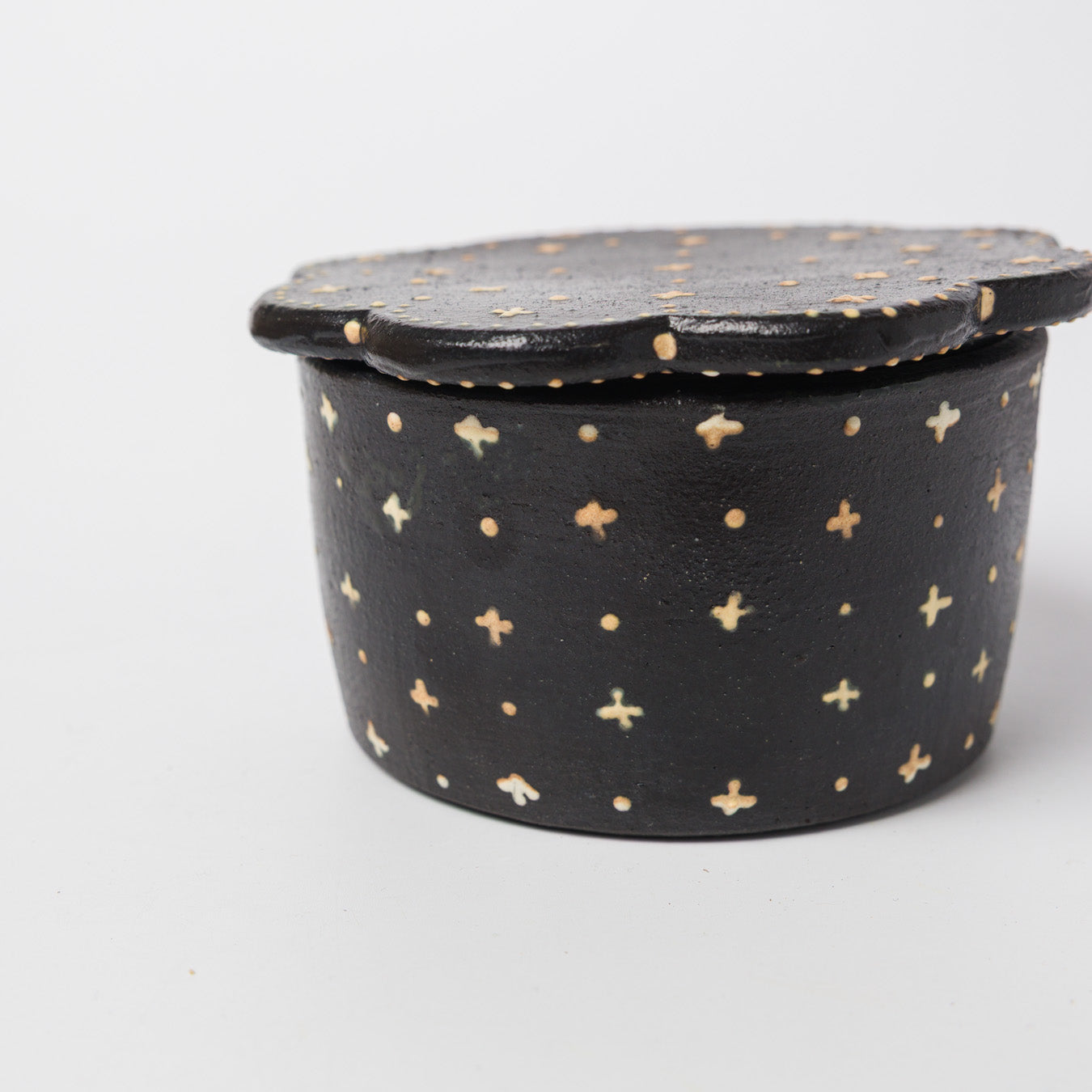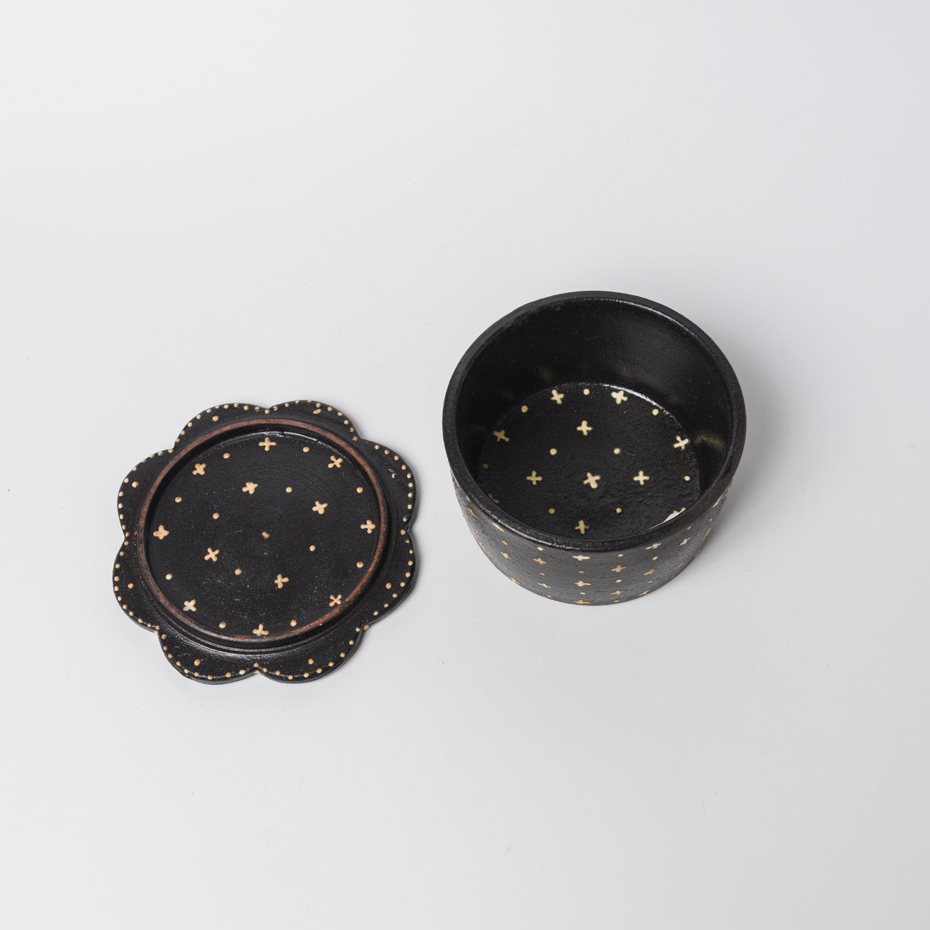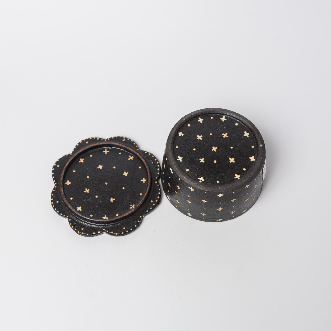 黒地に可愛らしいイッチン模様が散りばめられた、蓋付き鉢。
