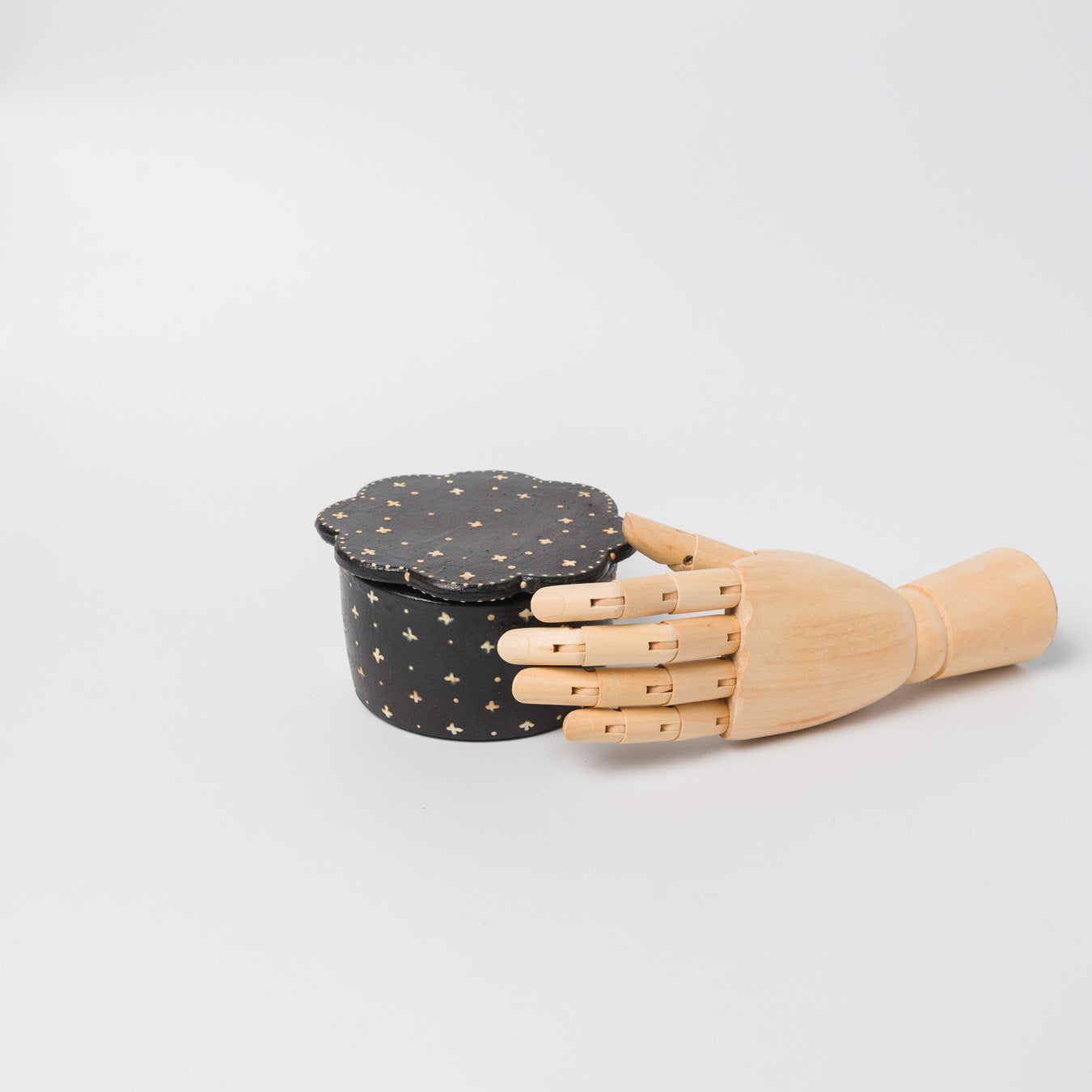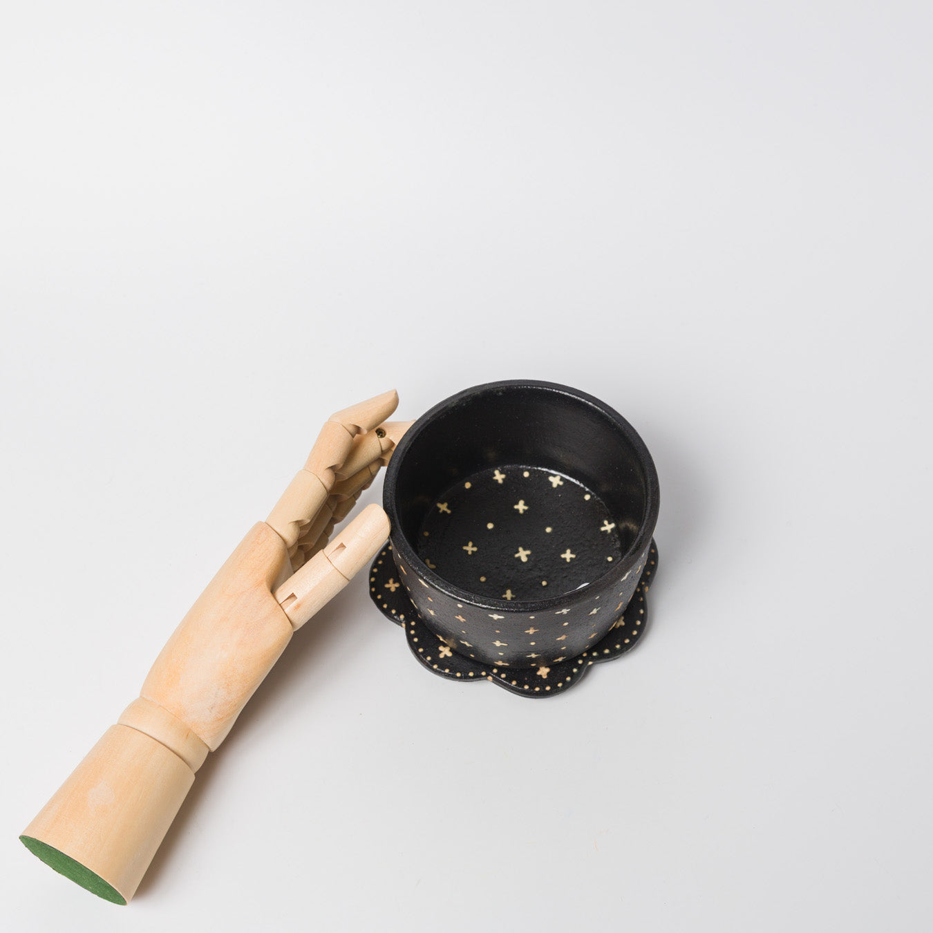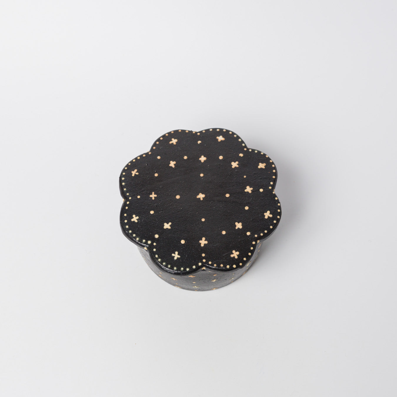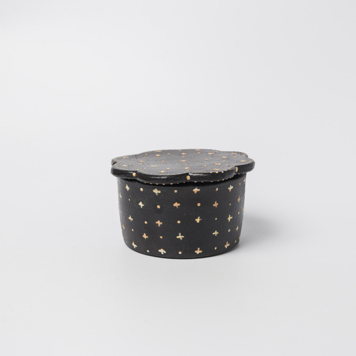 黒地に可愛らしいイッチン模様が散りばめられた、蓋付き鉢。