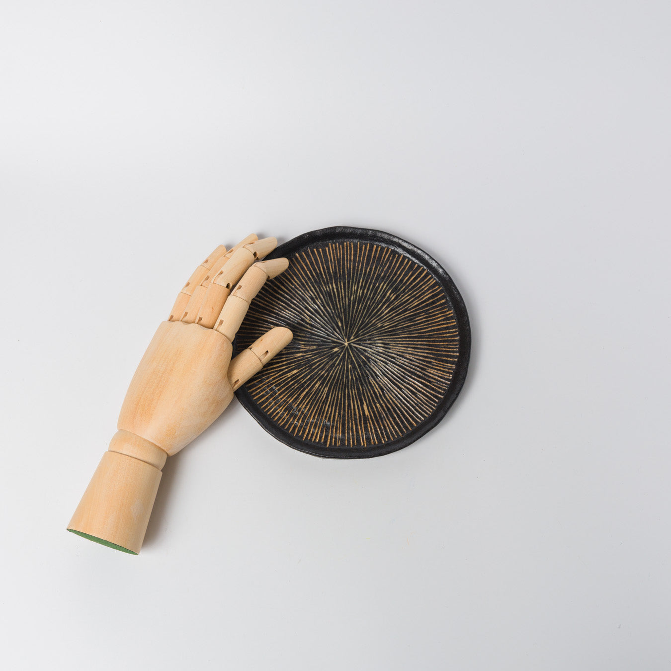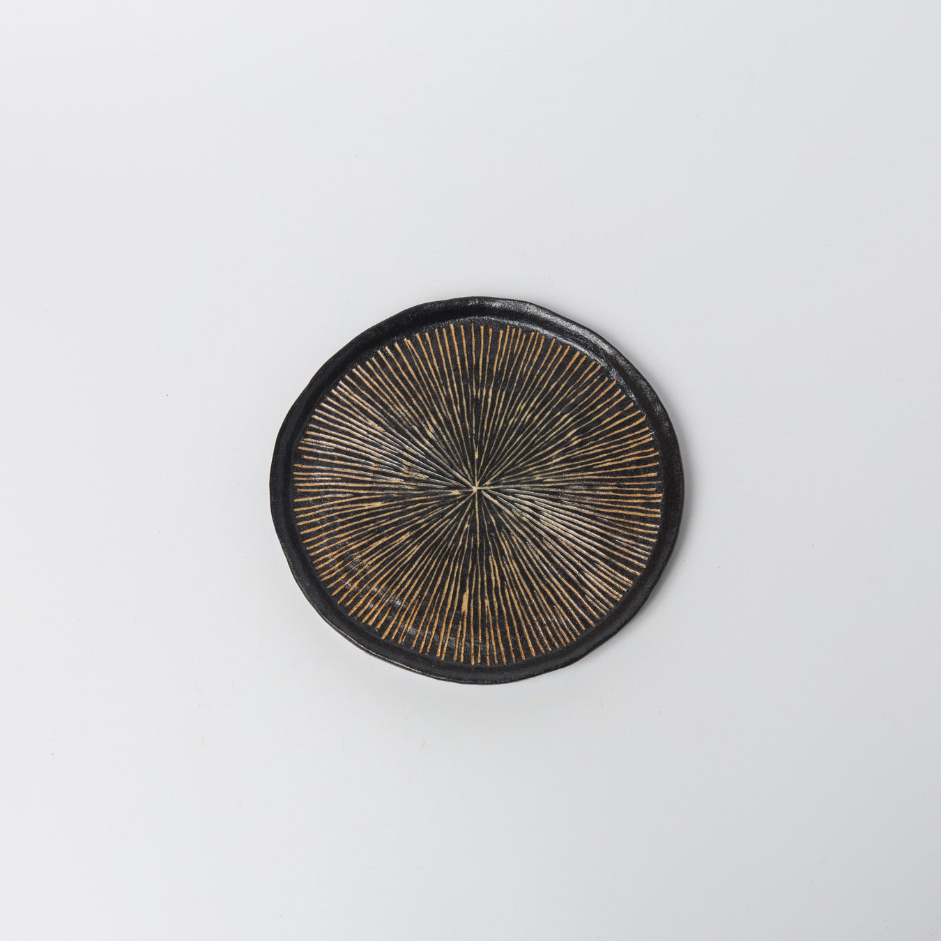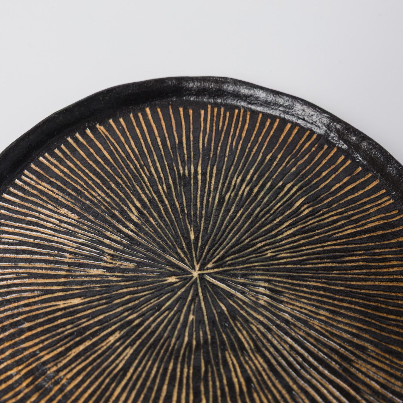 黒を基調に、表面は中心から放射状に掻き落とした線が広がるデザイン。