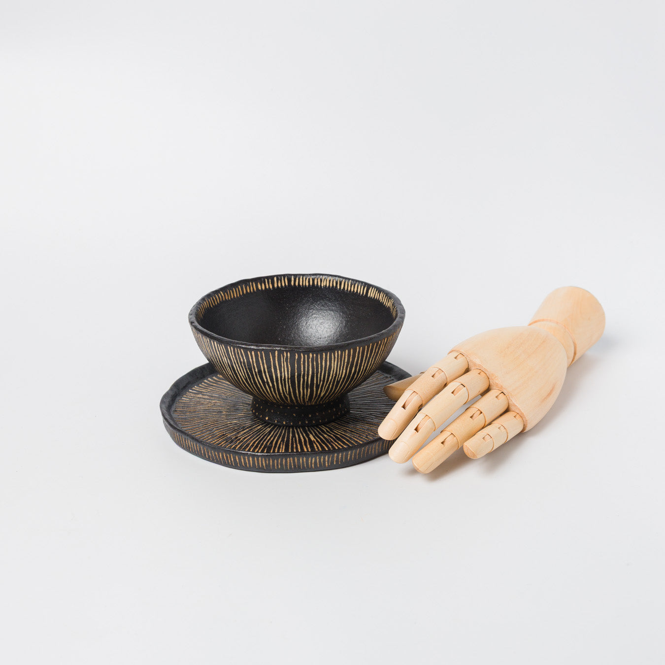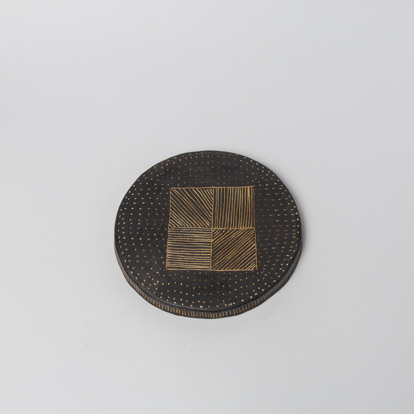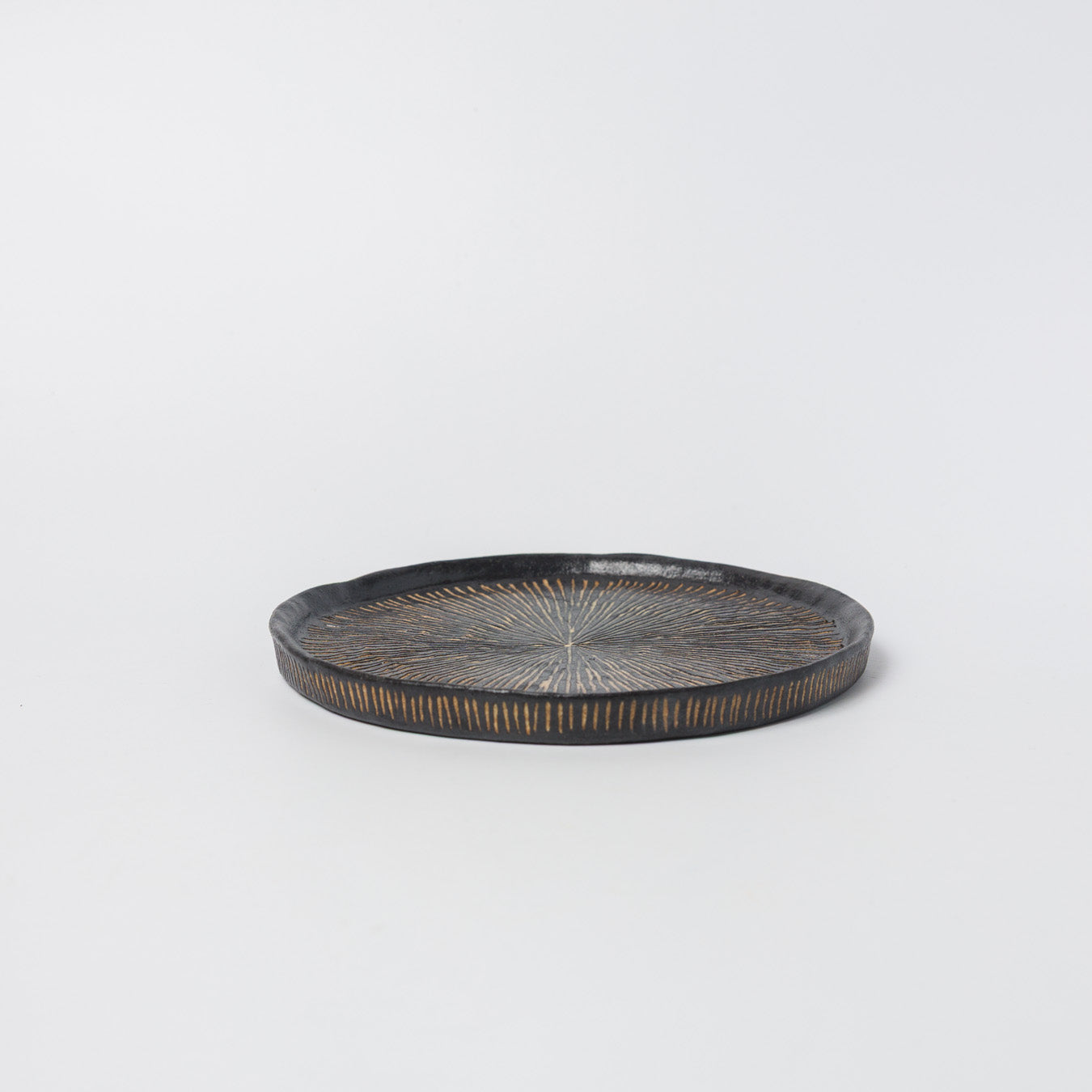 黒を基調に、表面は中心から放射状に掻き落とした線が広がるデザイン。