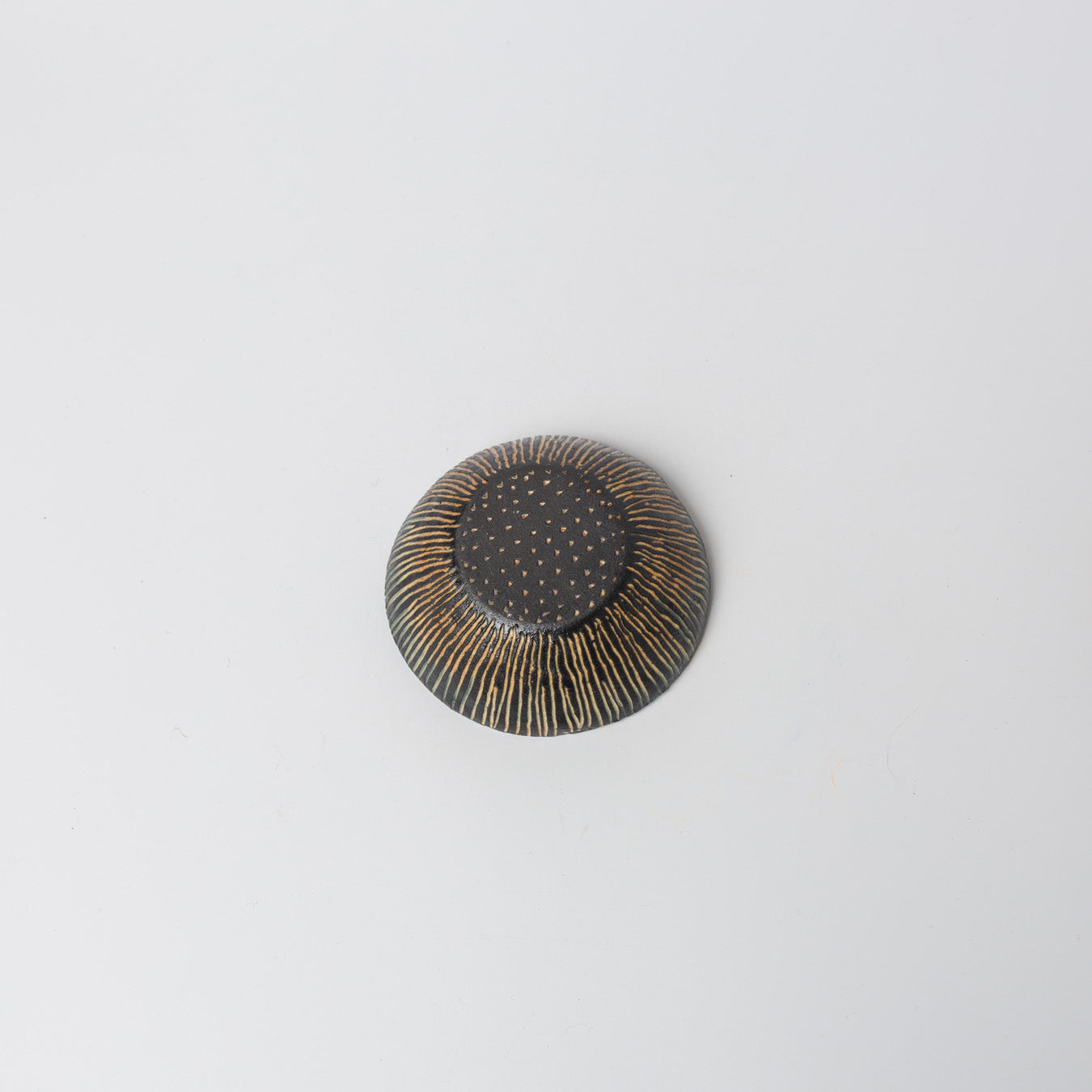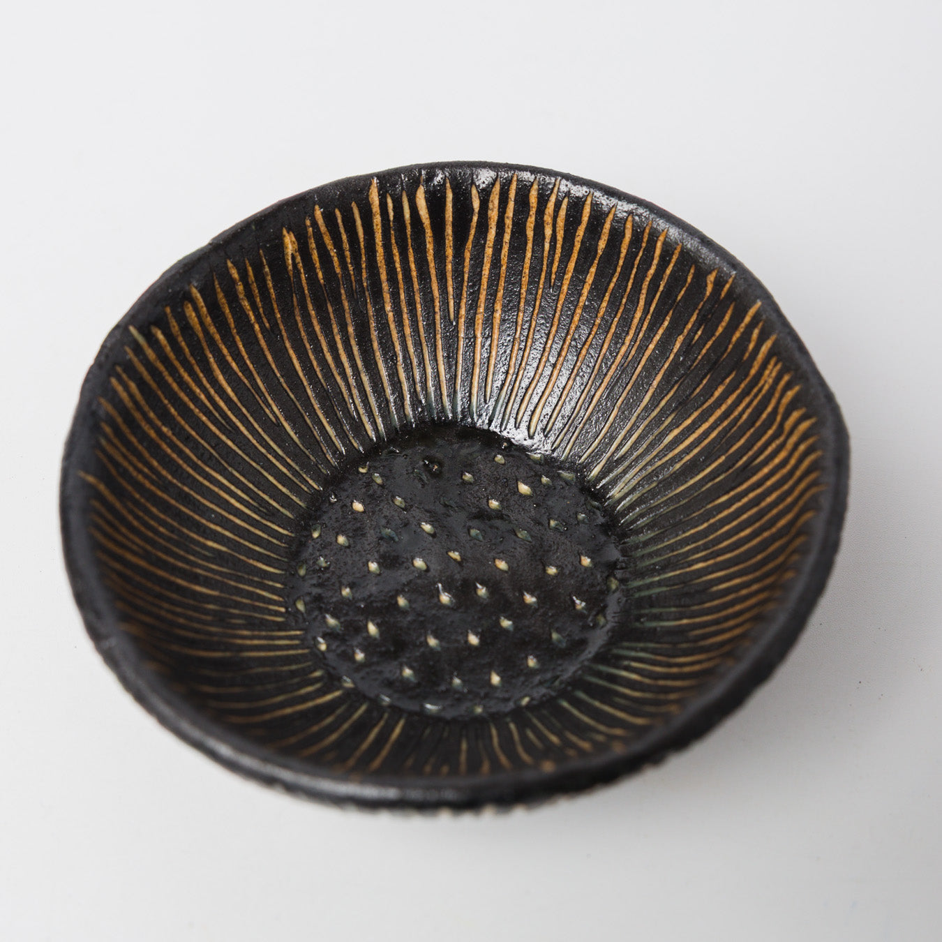 黒を基調に、ドット模様と放射状に掻き落とした線が広がるデザイン。