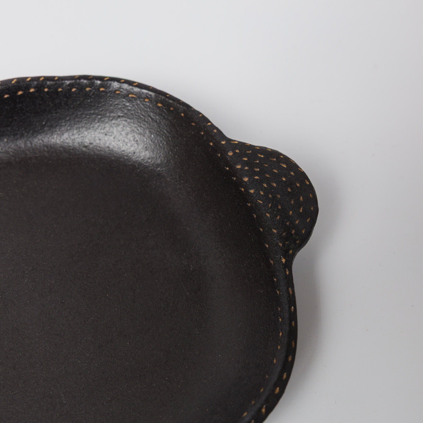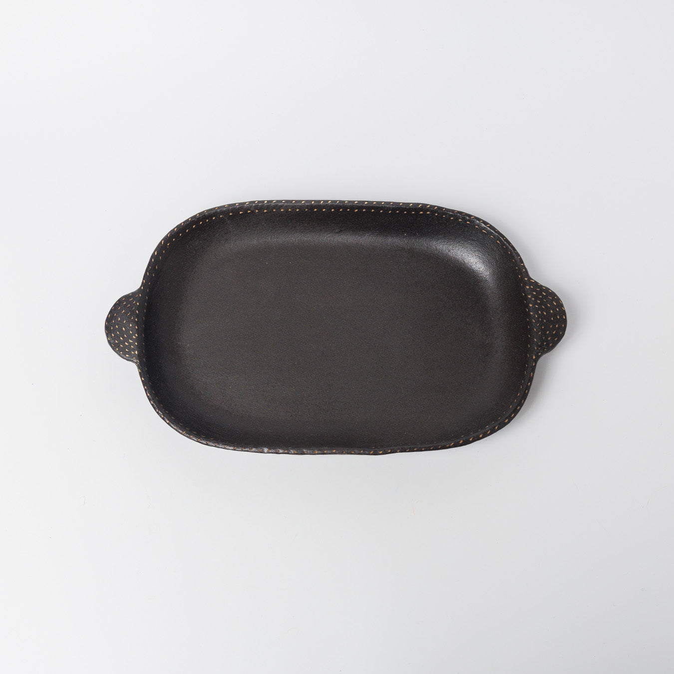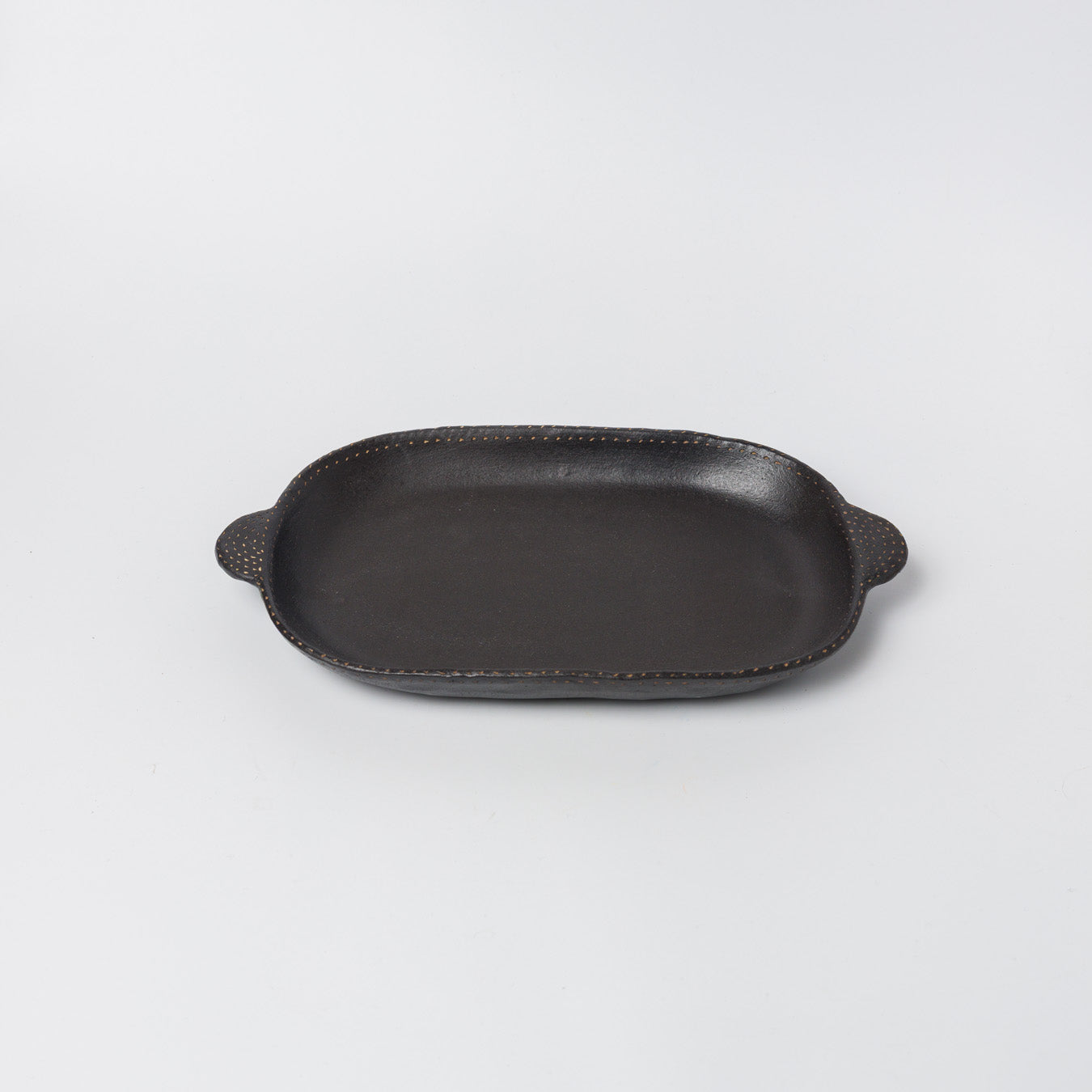 黒を基調とした落ち着いた佇まいに、縁の点模様がさりげないアクセントになっています。盛り皿としてもワンプレートとしても使いやすいサイズです。黒はどんな料理も相性よく、美味しく引き立てます。