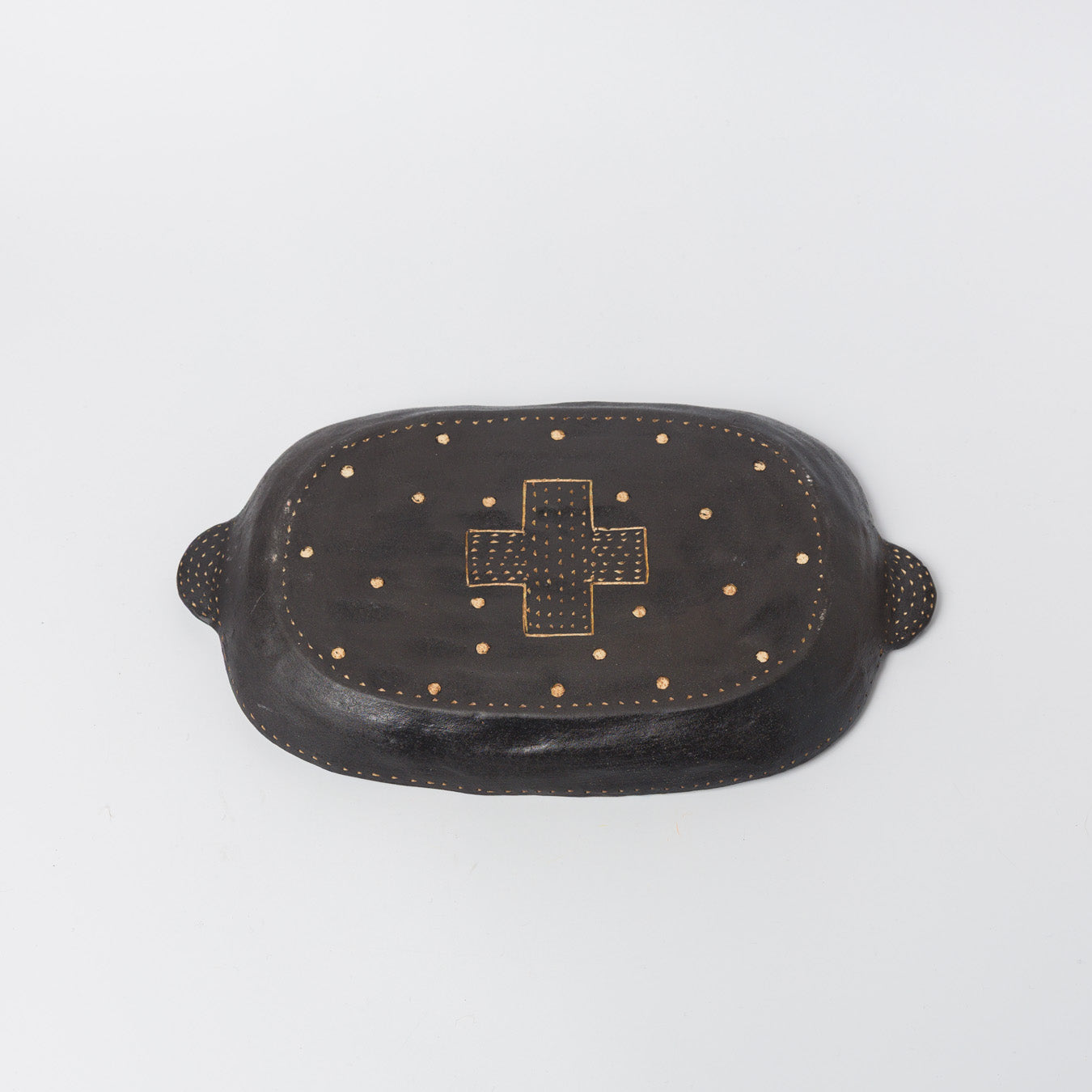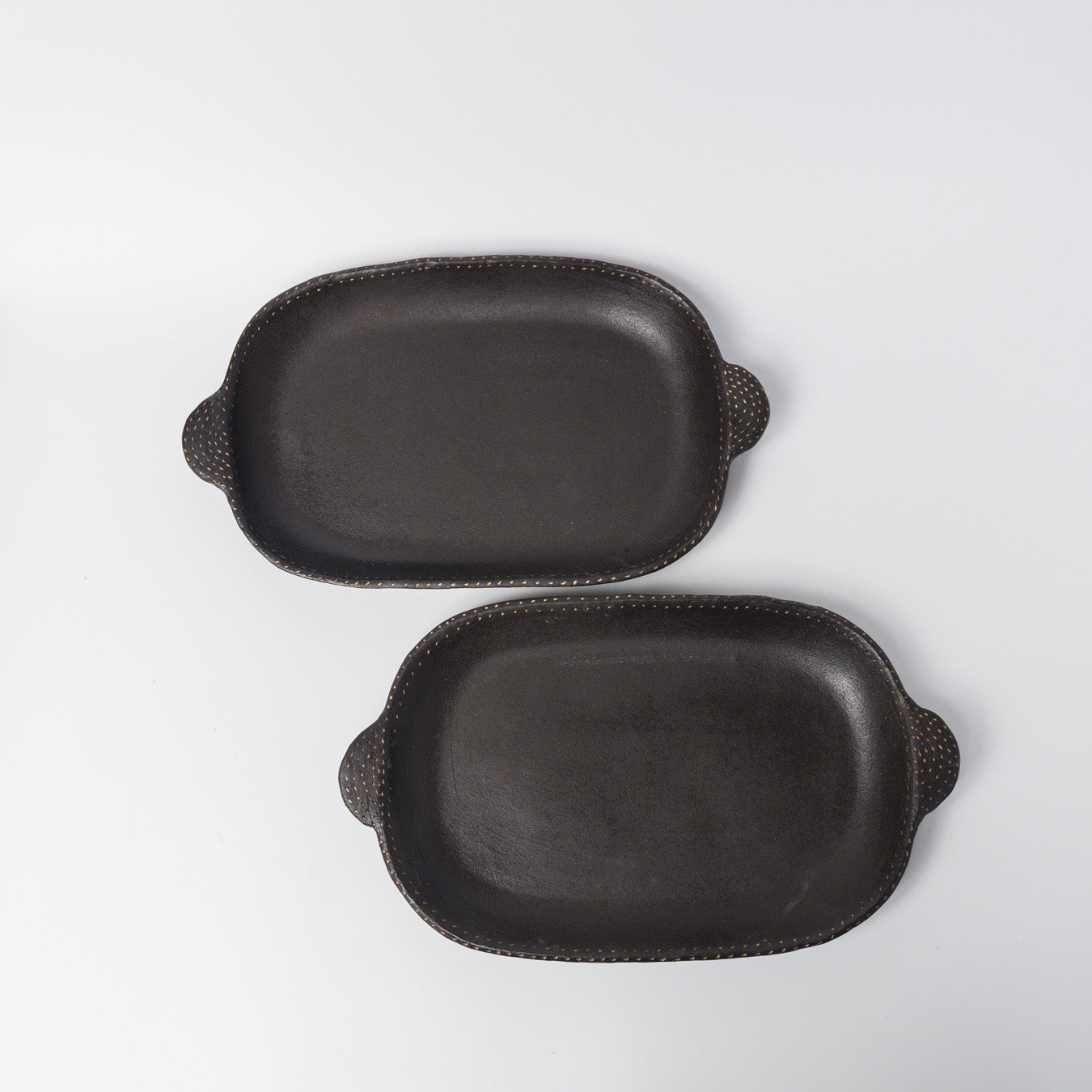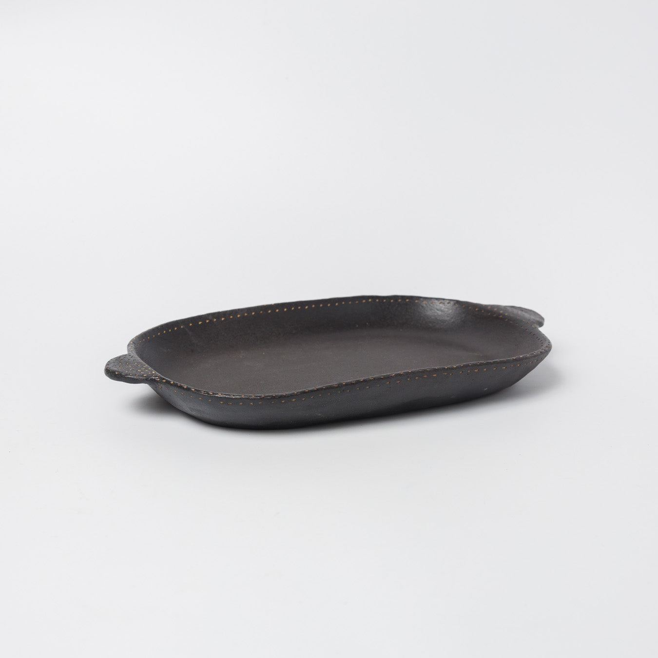 黒を基調とした落ち着いた佇まいに、縁の点模様がさりげないアクセントになっています。盛り皿としてもワンプレートとしても使いやすいサイズです。黒はどんな料理も相性よく、美味しく引き立てます。