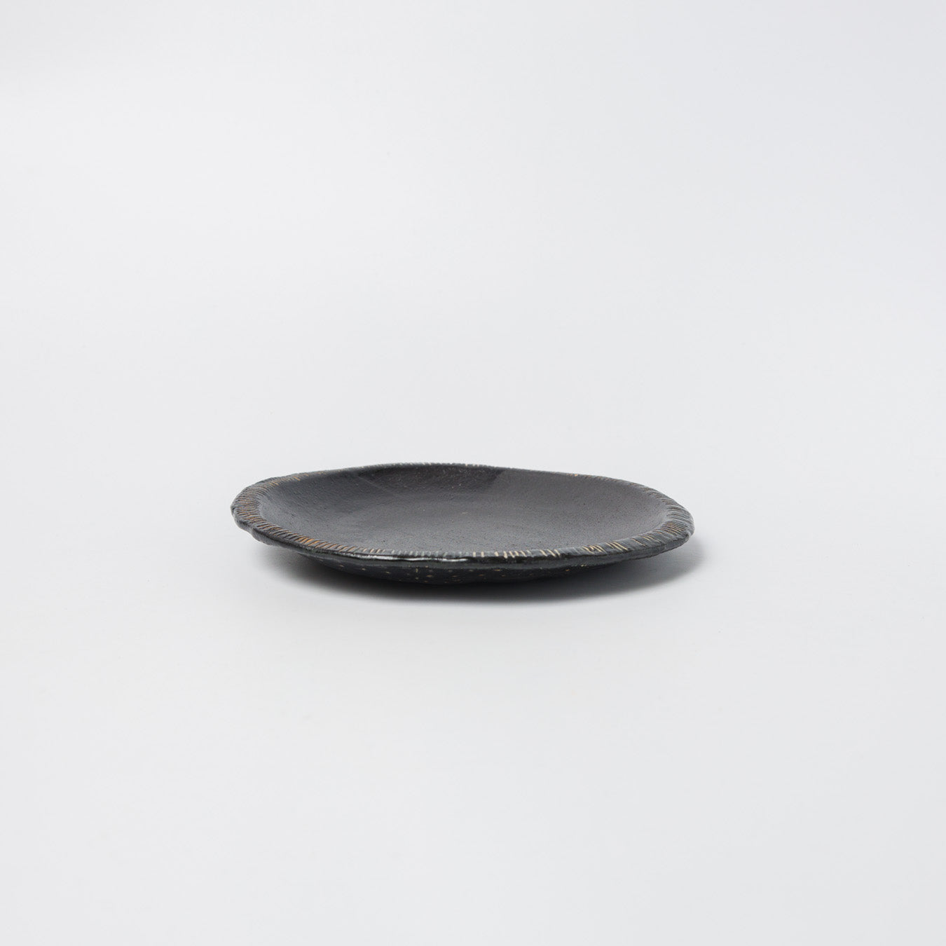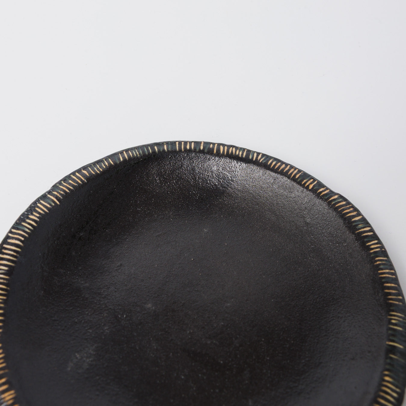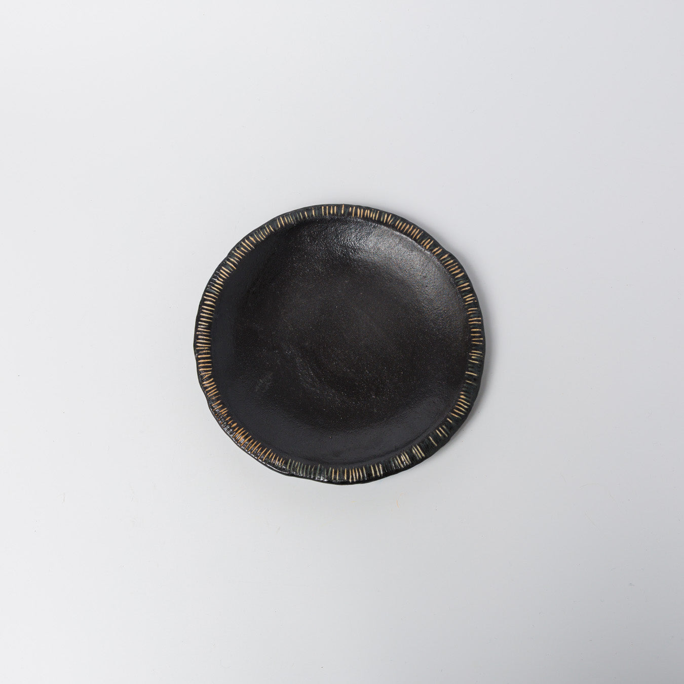 黒を基調とした落ち着いた佇まいに、縁の点模様がさりげないアクセントになっています。菓子皿や取り皿としても使いやすいサイズです。黒はどんな料理も相性よく、美味しく引き立てます。