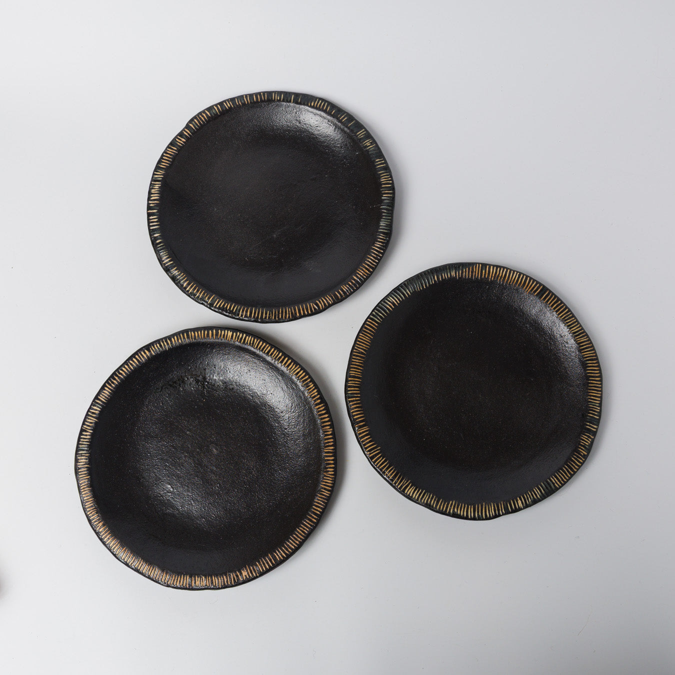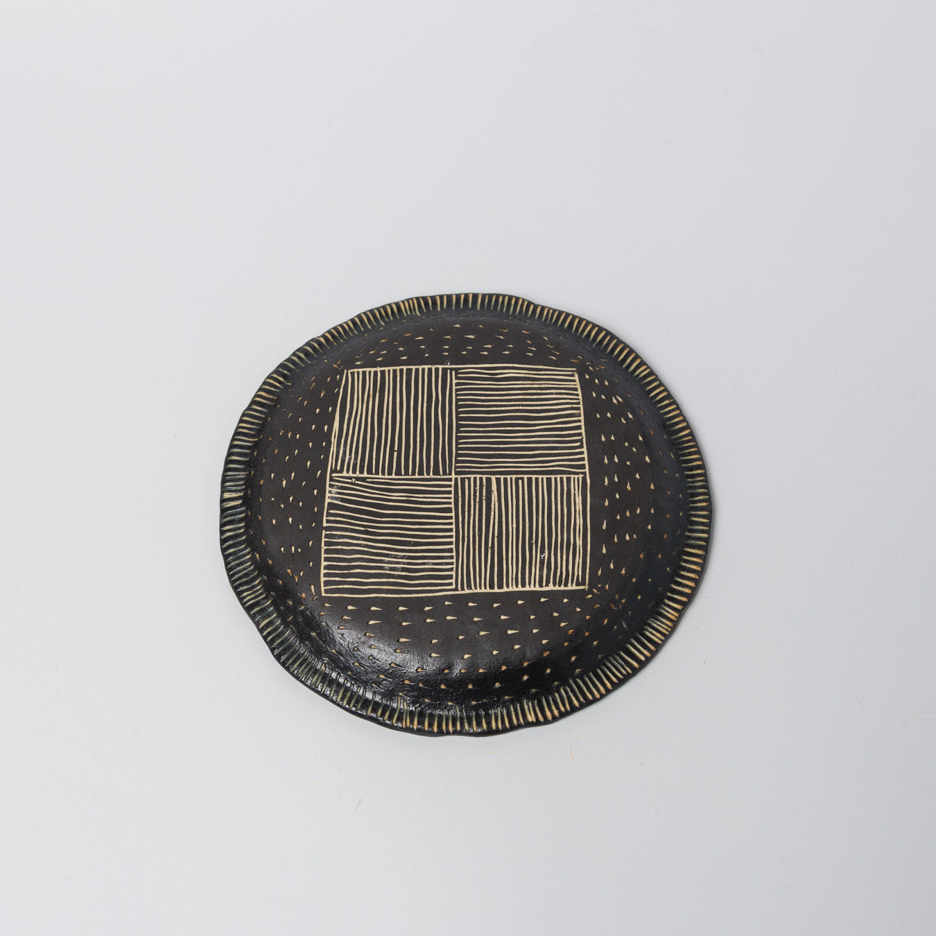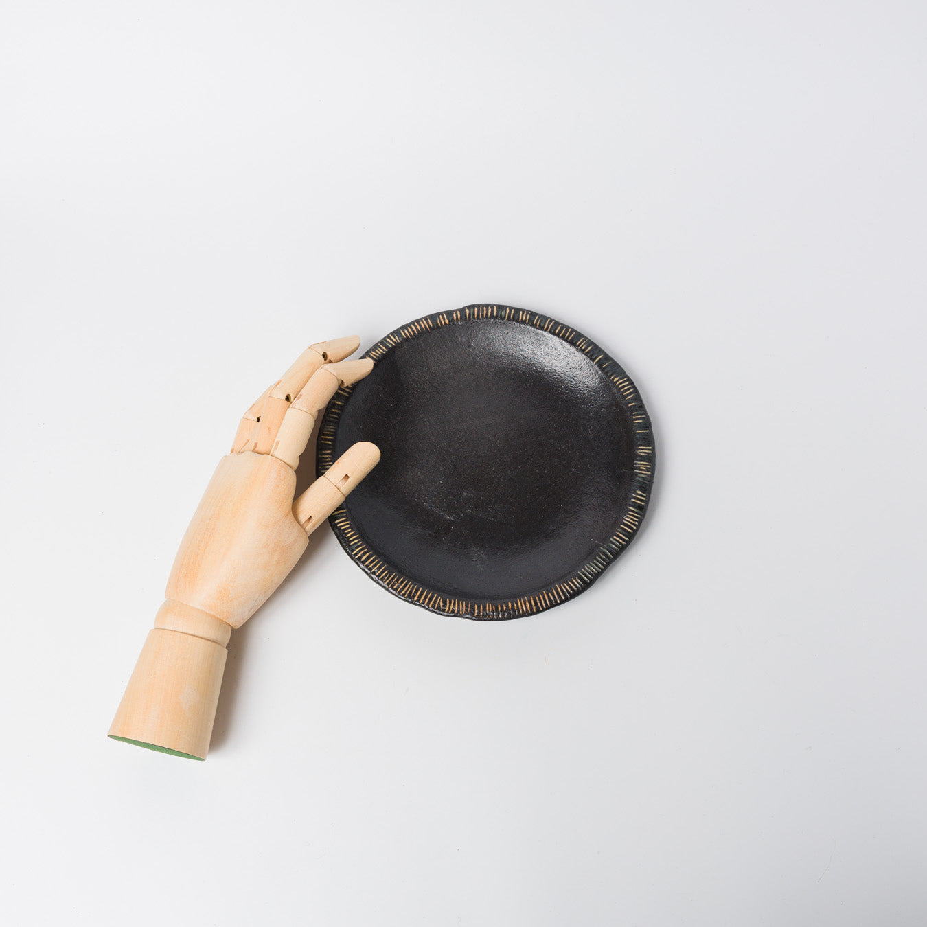 黒を基調とした落ち着いた佇まいに、縁の点模様がさりげないアクセントになっています。菓子皿や取り皿としても使いやすいサイズです。黒はどんな料理も相性よく、美味しく引き立てます。