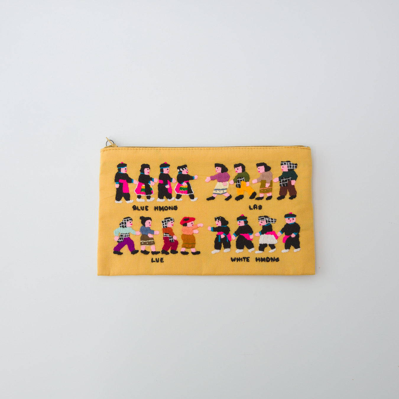 ラオスのさまざまな村で暮らす人々をモチーフにした手刺繍ポーチ。
