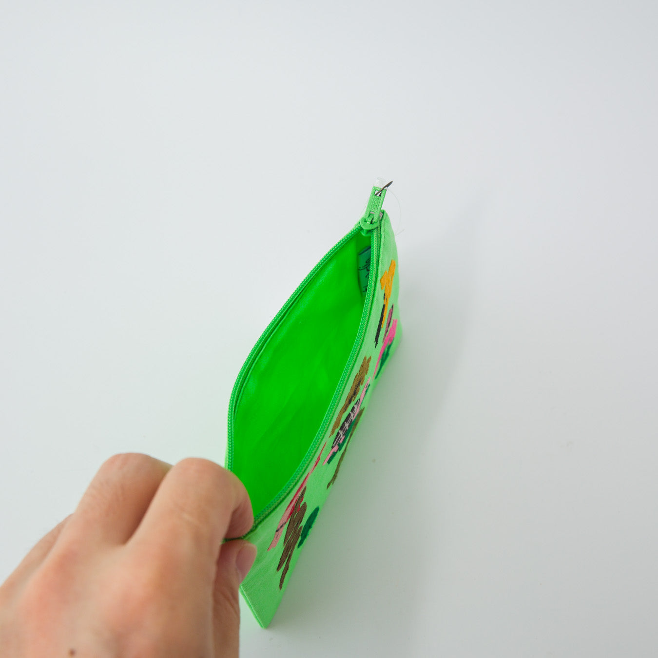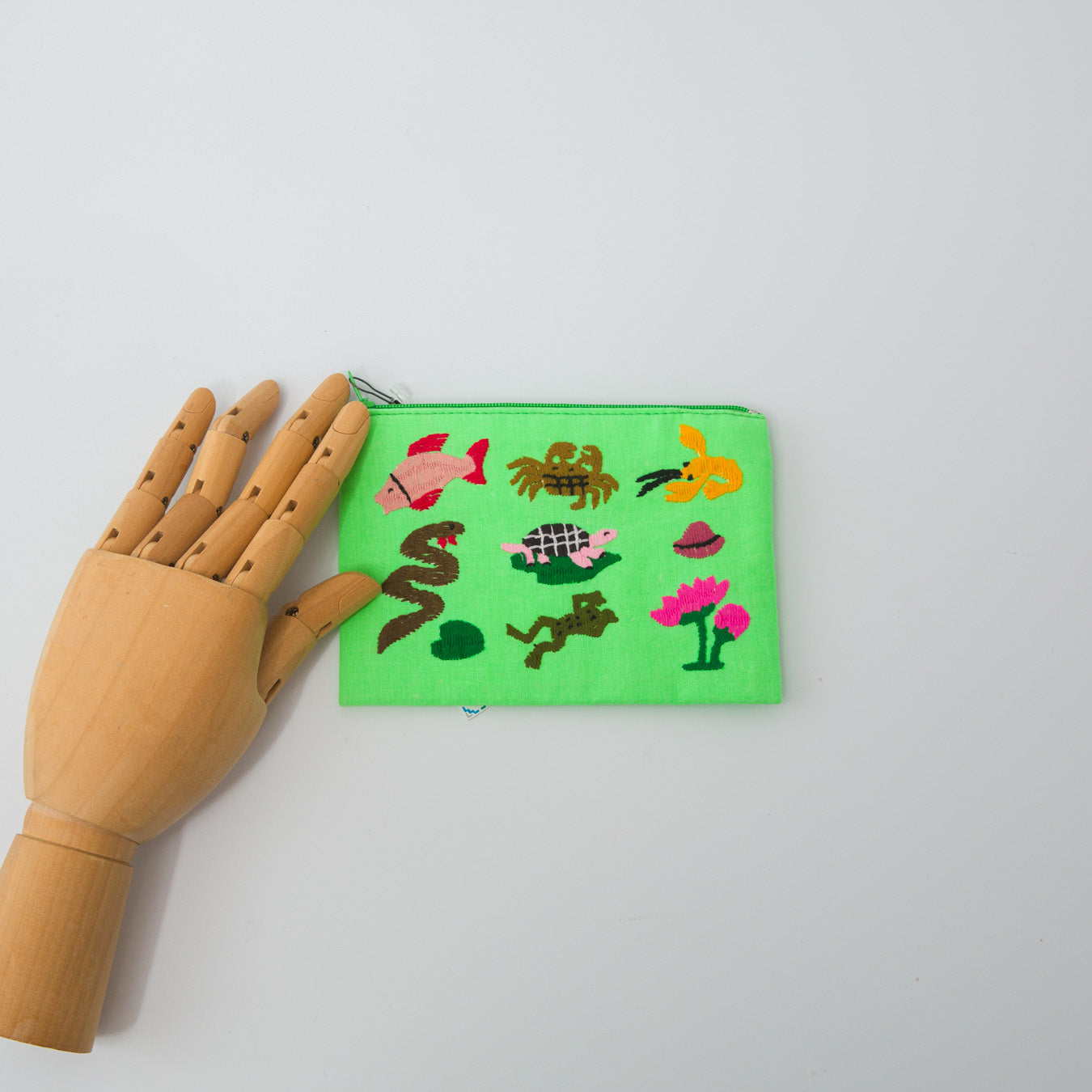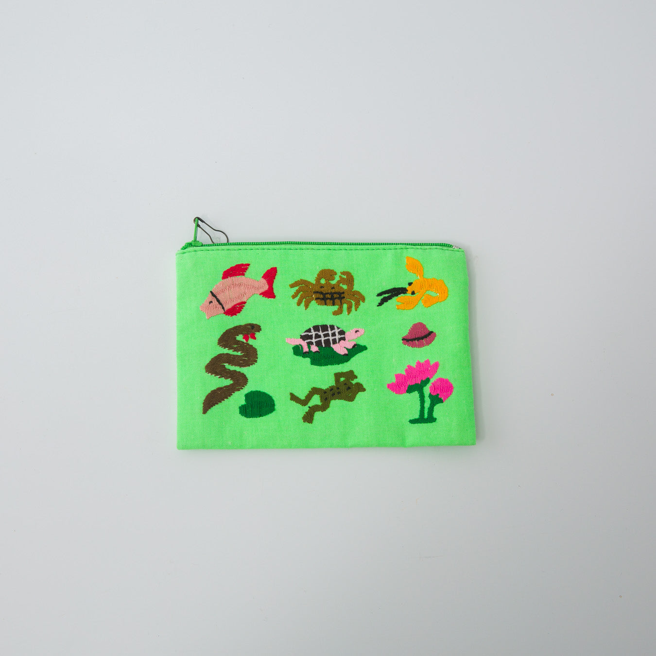 海のないラオスで暮らす、川や淡水に生きる動物たちをモチーフにした手刺繍ポーチ。