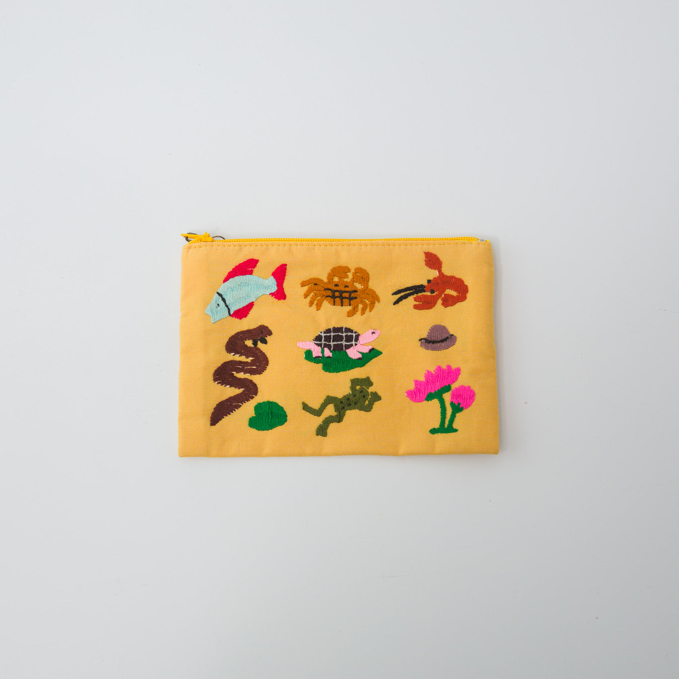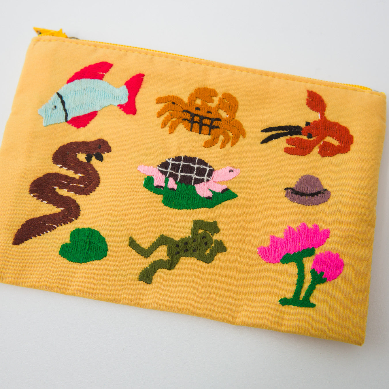 海のないラオスで暮らす、川や淡水に生きる動物たちをモチーフにした手刺繍ポーチ。