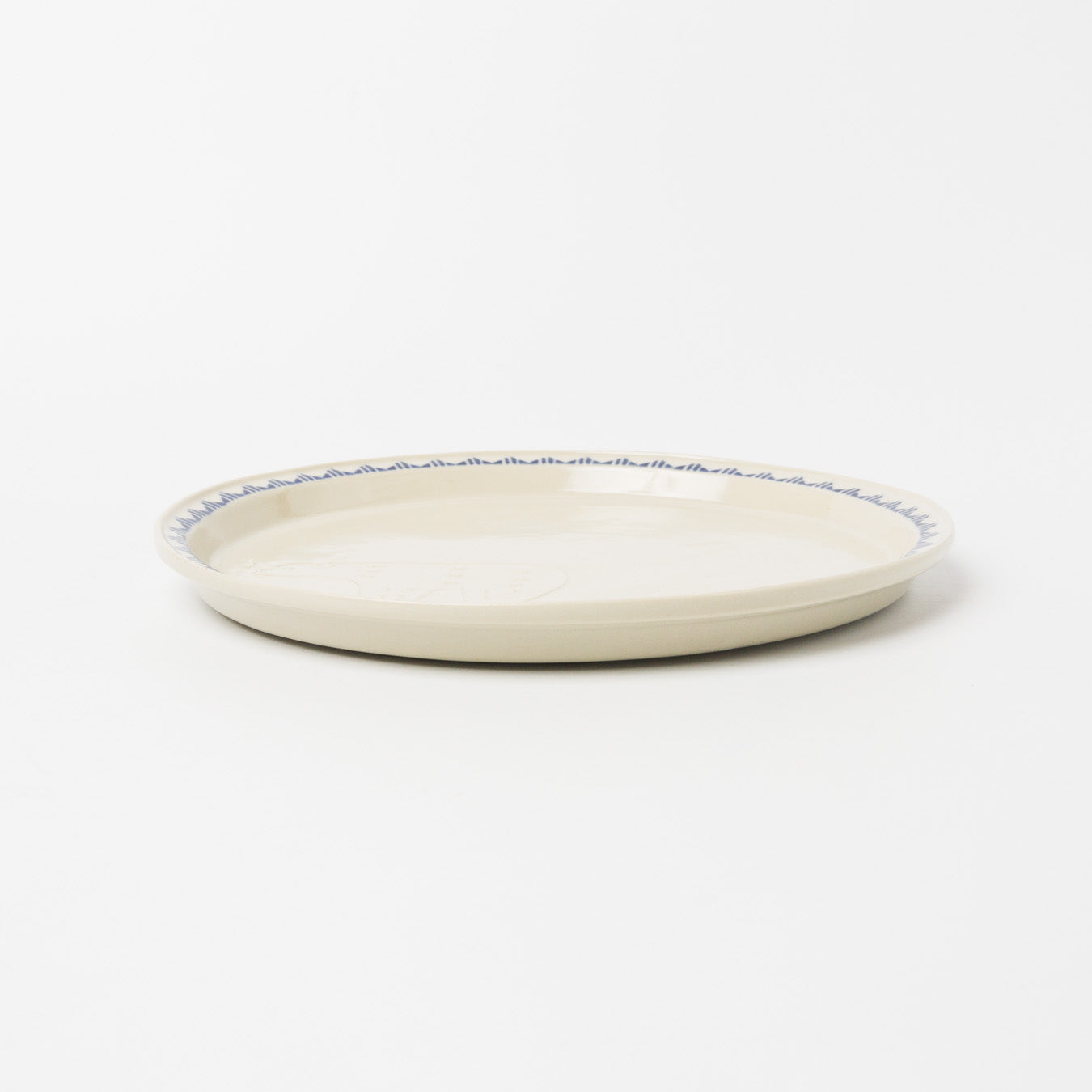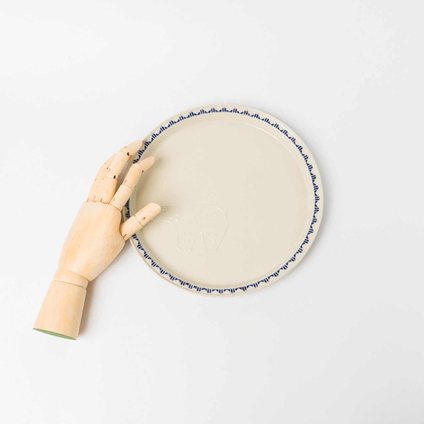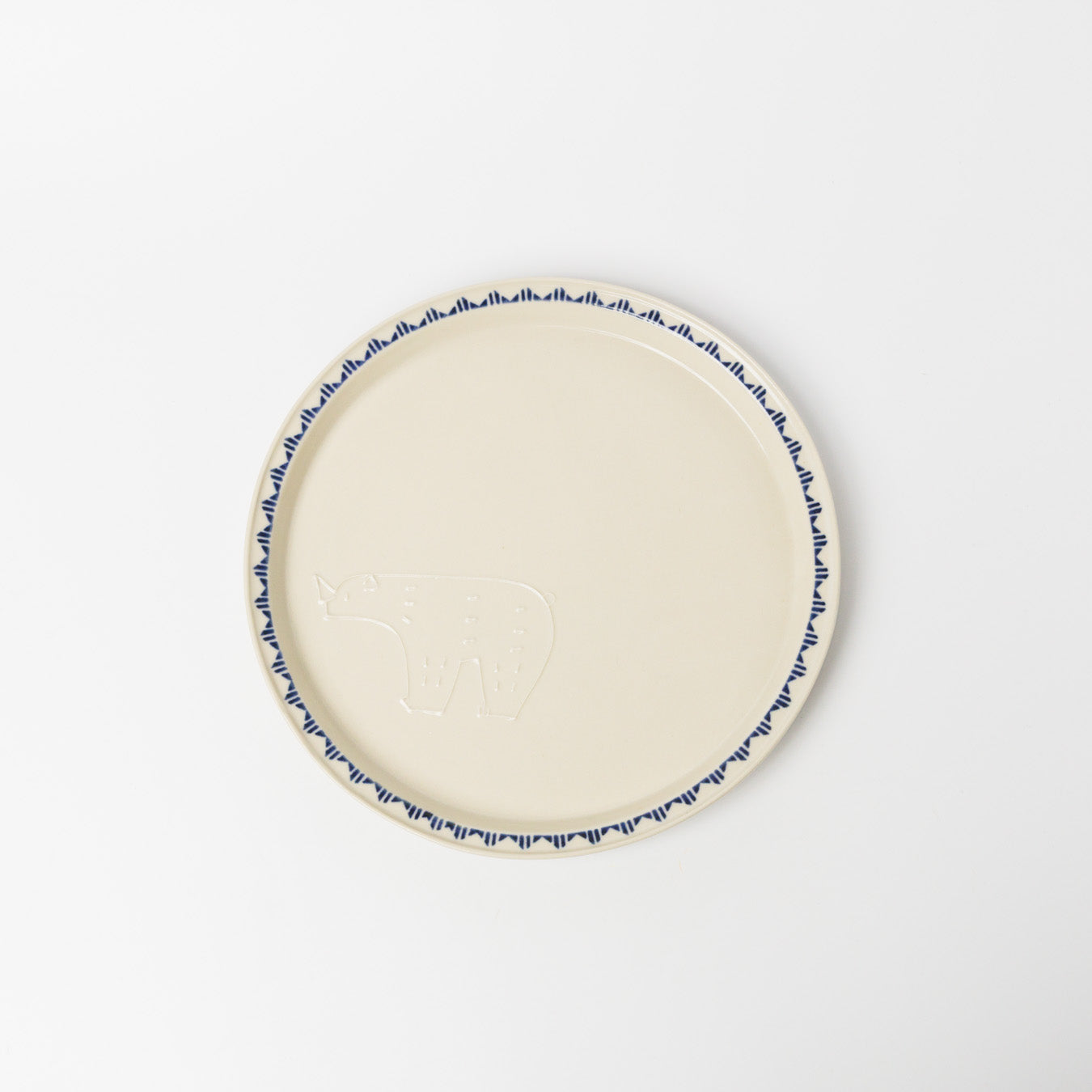 イッチン技法で描かれたシロクマが印象的なフラット皿。縁に描かれた幾何学模様が、器全体の印象をほどよく引き締めています。
