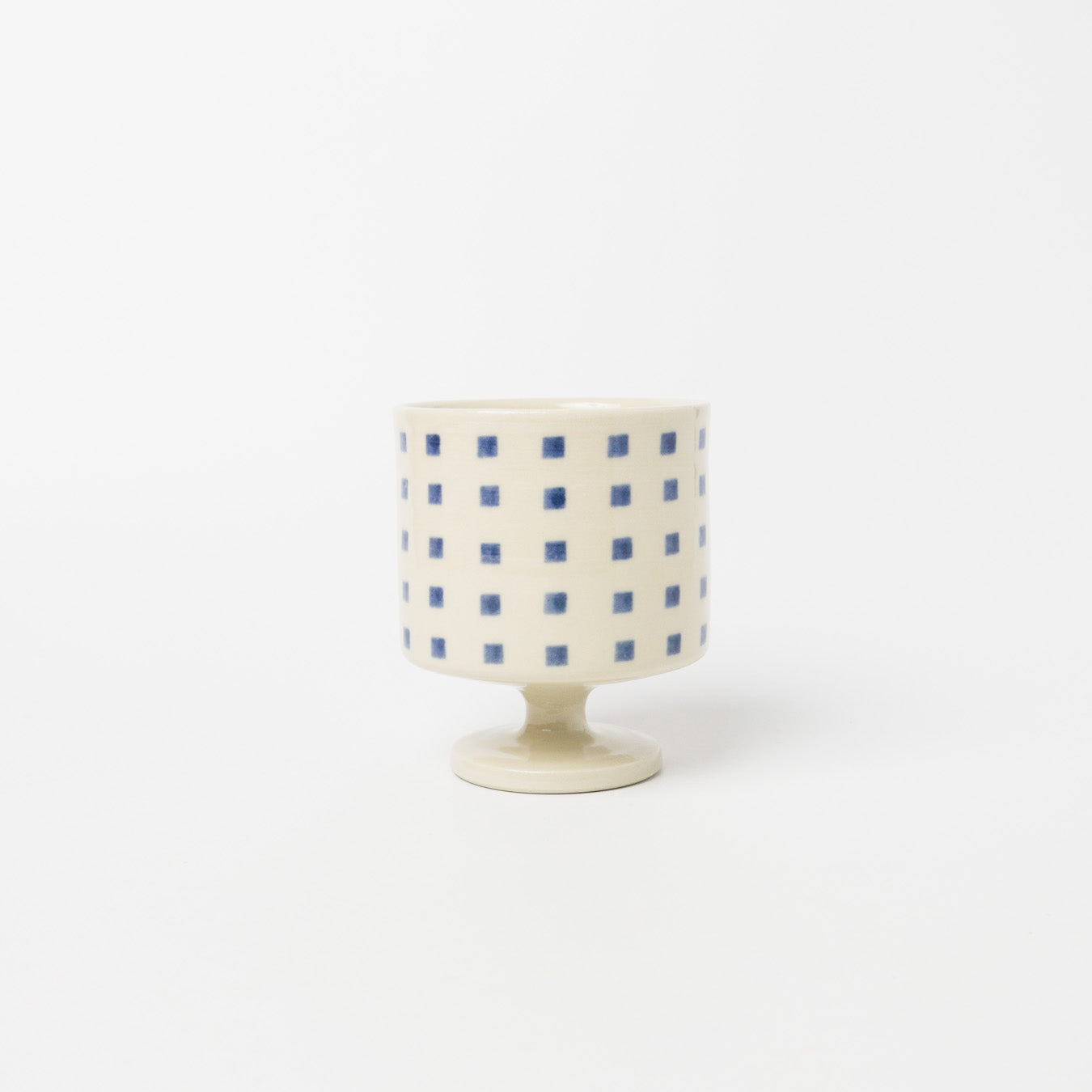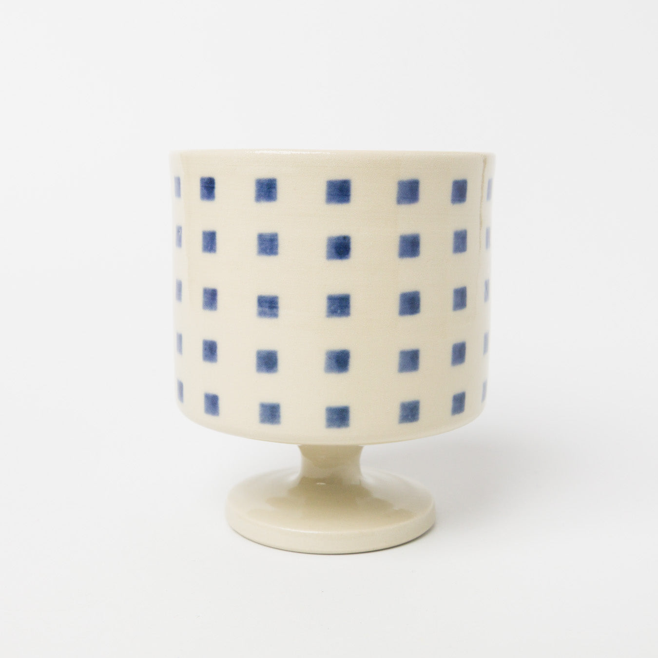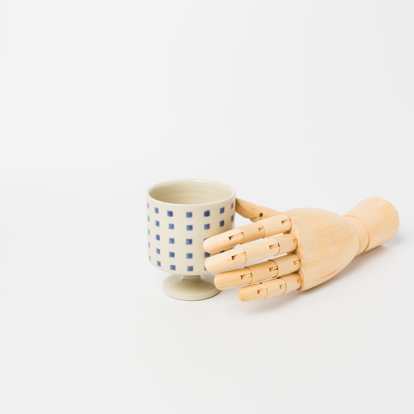 リズムよく並ぶ小さな青い四角模様が印象的なカップ。
