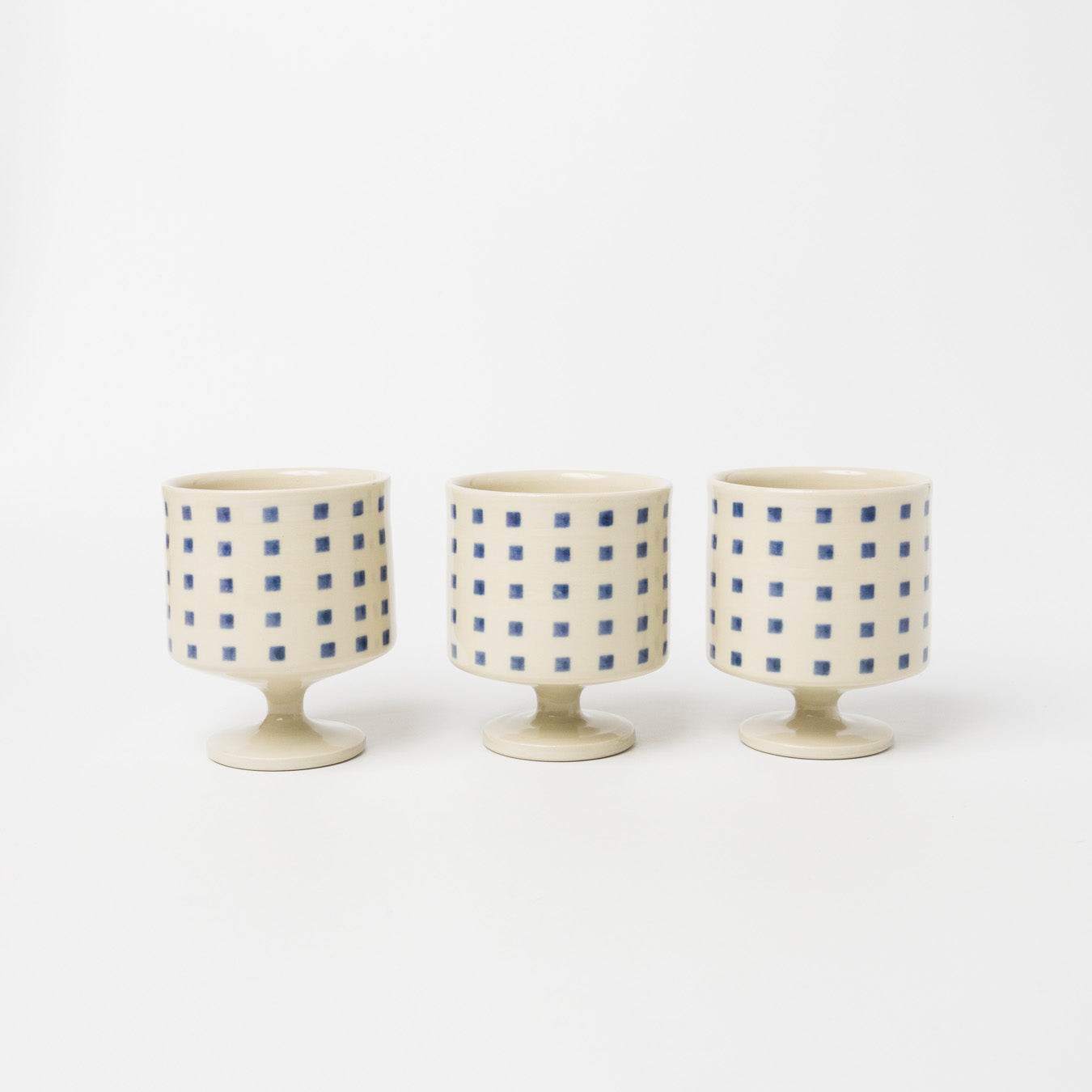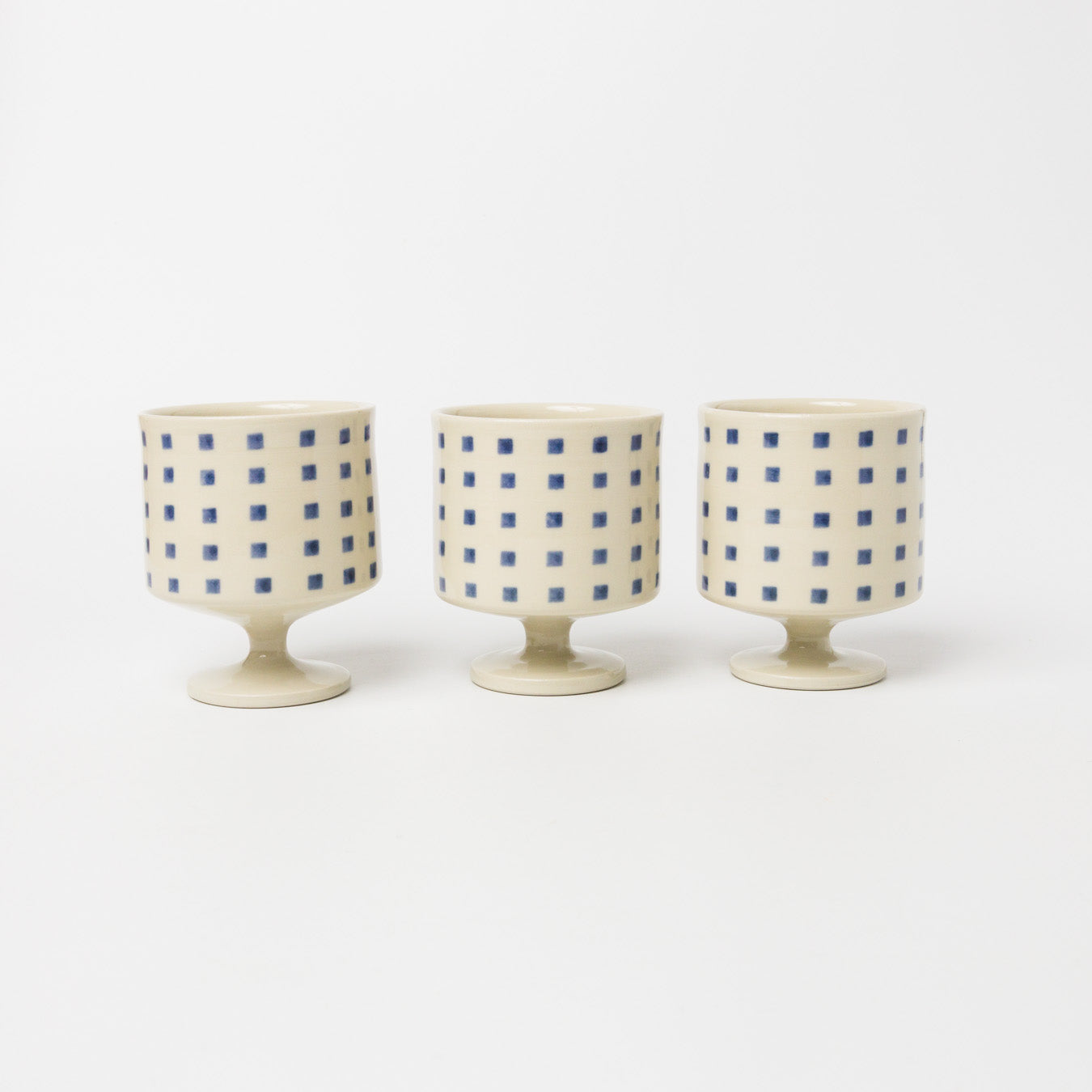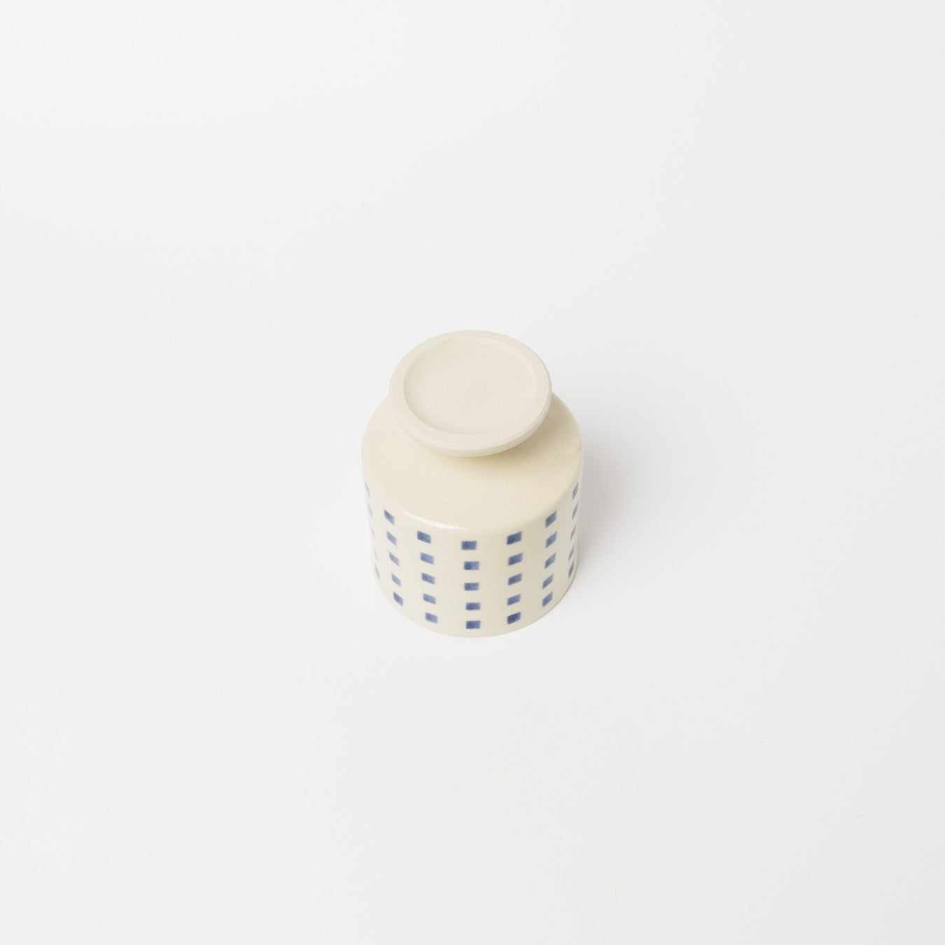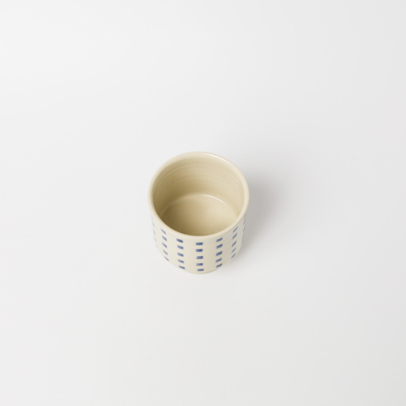 リズムよく並ぶ小さな青い四角模様が印象的なカップ。